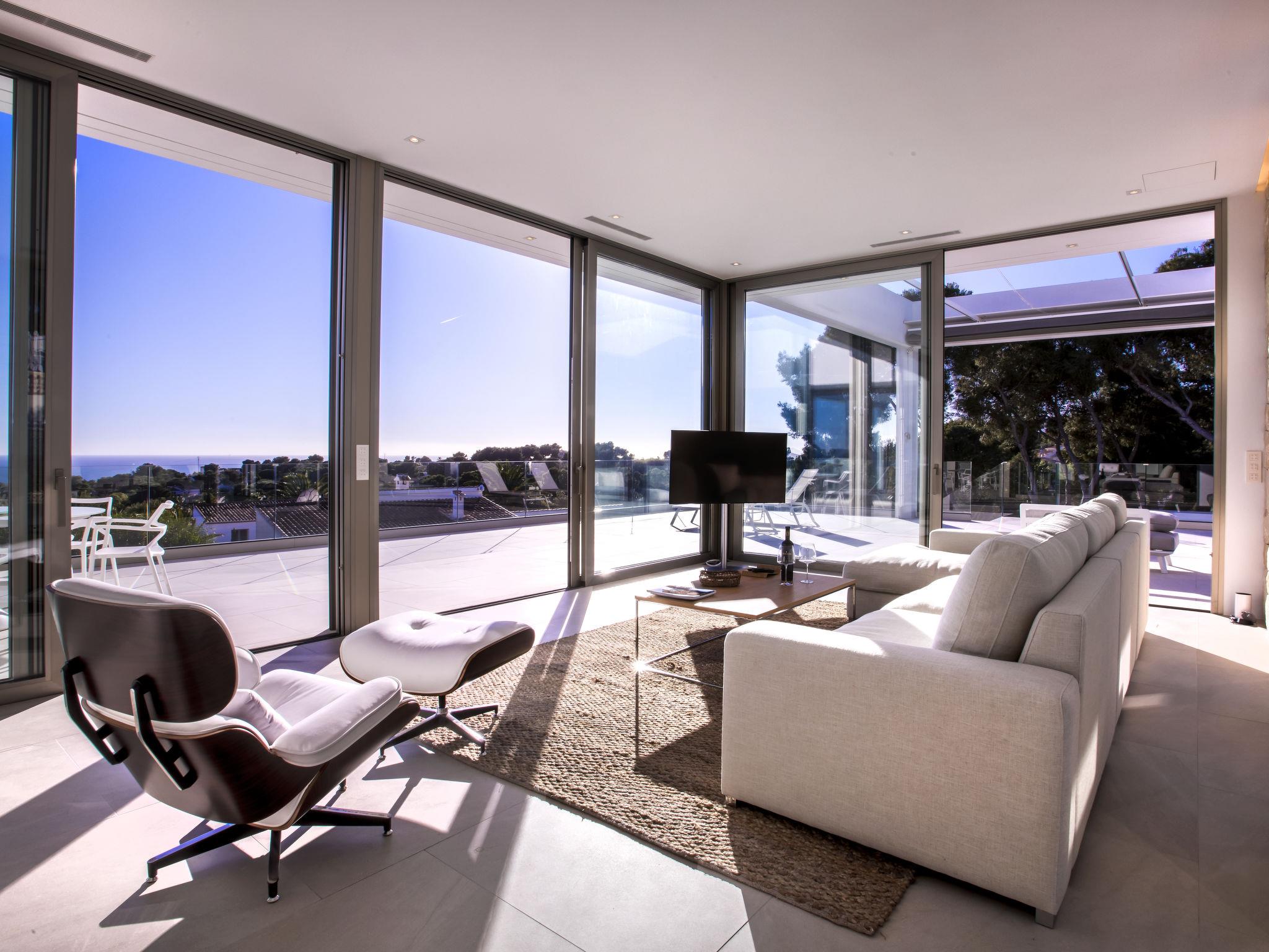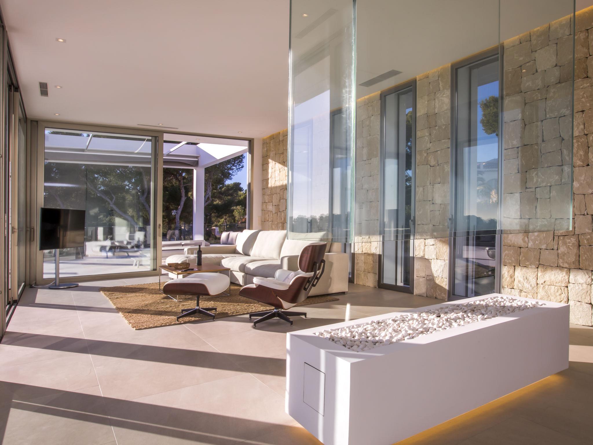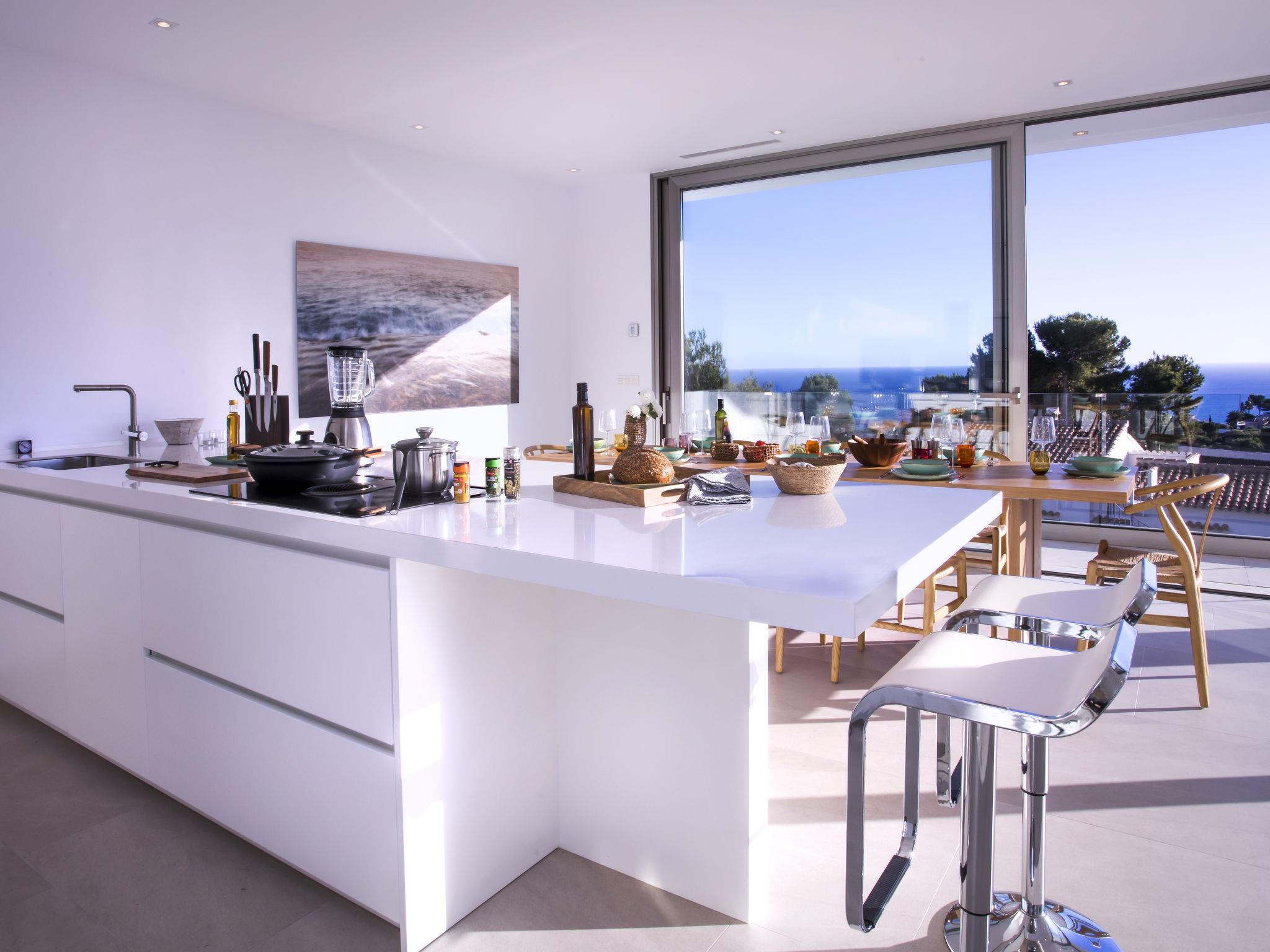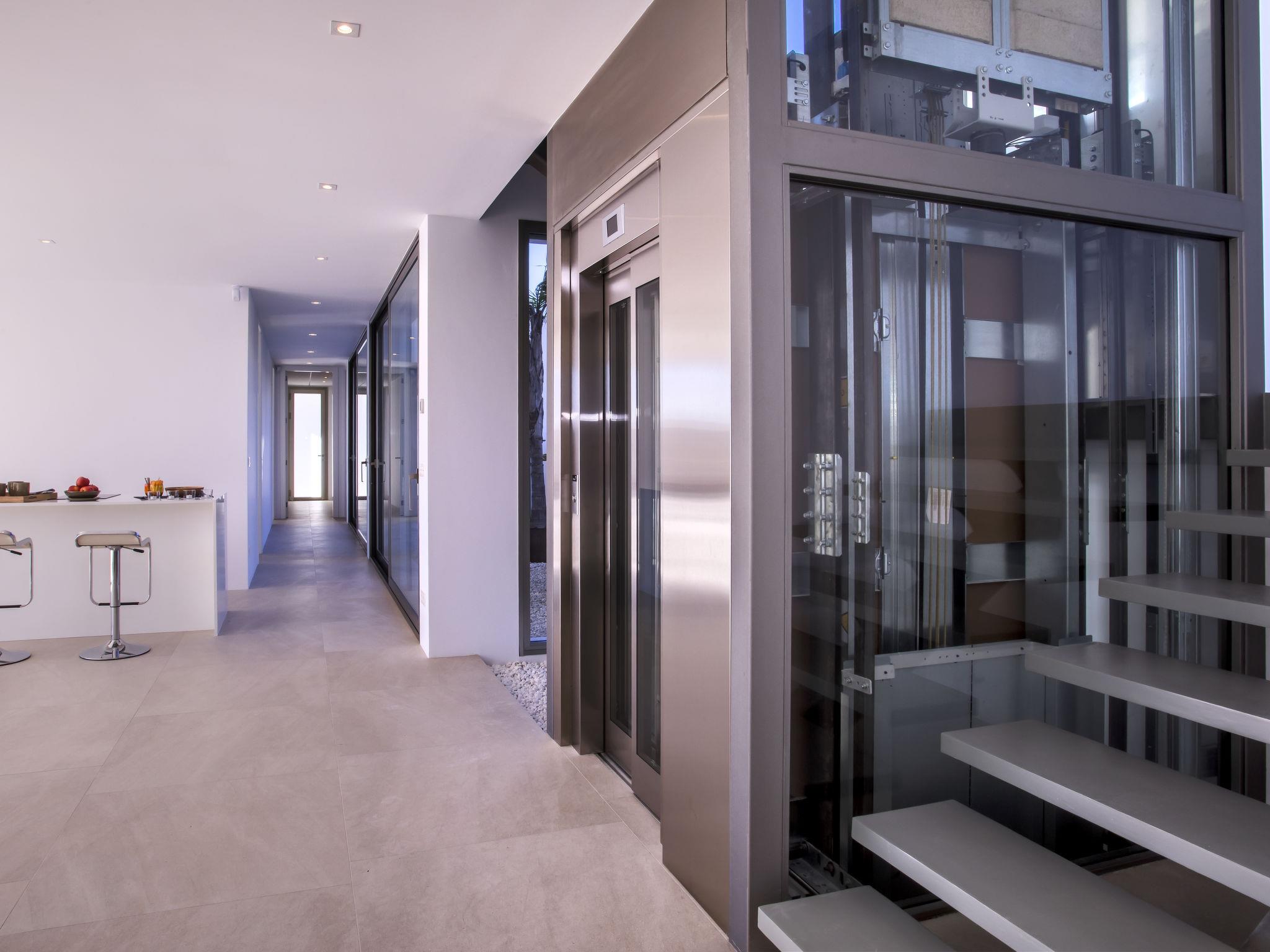 Very large, very modern, very luxurious villa "Halcon al Mar", 2 storeys, built in 2021. In the resort Jávea - Balcón al Mar, in a quiet, sunny position, 1 km from the sea, 3.5 km from the beach. Private: property with lawn and trees, beautiful garden to relax, swimming pool angular, heated (12 x 4 m, depth 100 - 200 cm, seasonal availability: 01.Jan. - 31.Dec.) with internal staircase. Outdoor shower, patio (190 m2), garden furniture, barbecue. In the house: lift, central heating system, air conditioning. Parking on the premises, single garage. E-charging station. Supermarket 600 m, restaurant 400 m, bus stop "Toscamar" 4.3 km, sandy beach "El Arenal" 6 km, shingle beach "Cala Granadella" 4.8 km, rocky beach "Cala Portitxol - La Barraca" 3.5 km. Sports harbour 6 km, golf course (9 hole) 10 km, surf school 3.5 km, sailing school 3.5 km, tennis 600 m. The owner does not accept any youth groups.