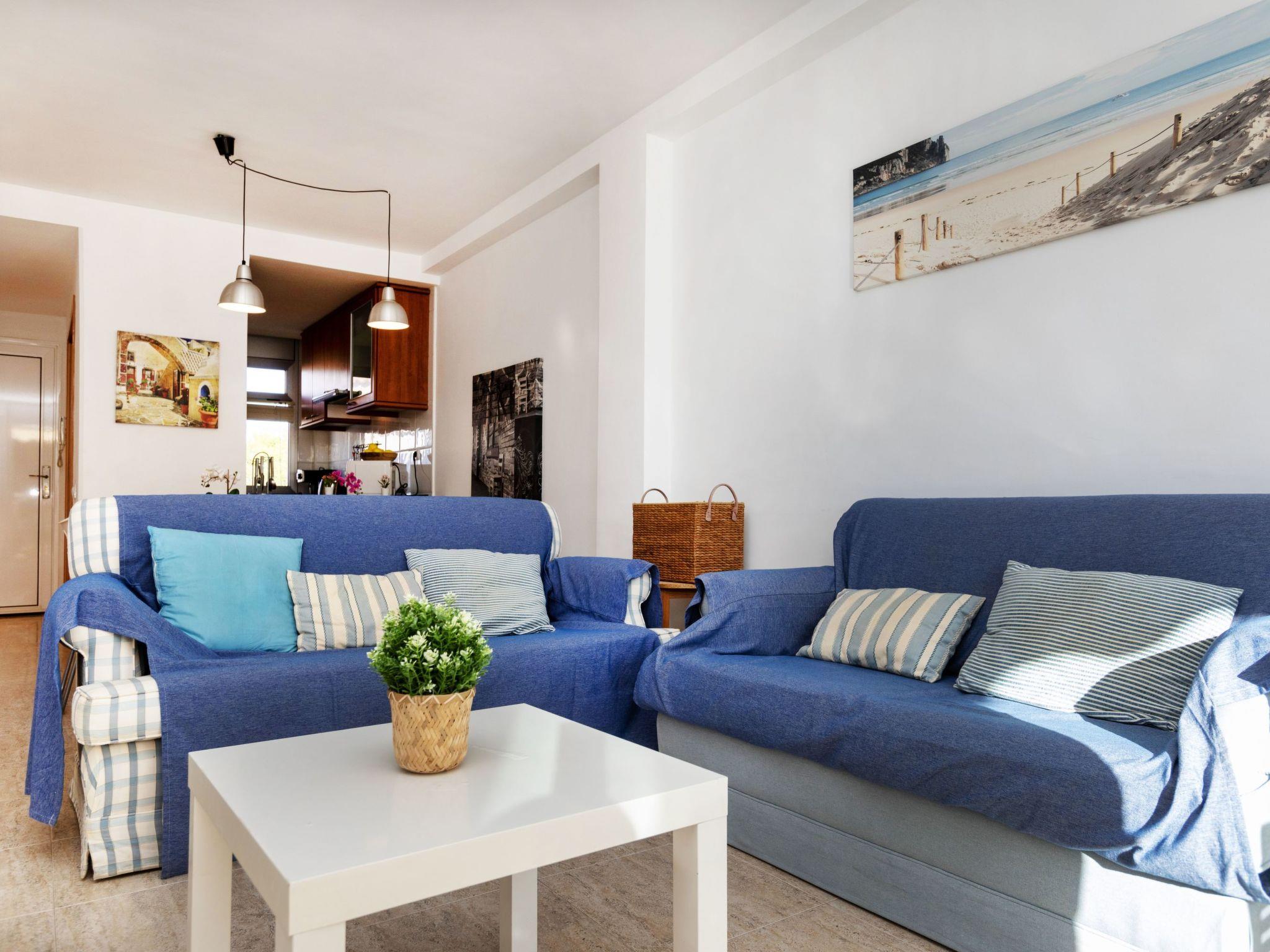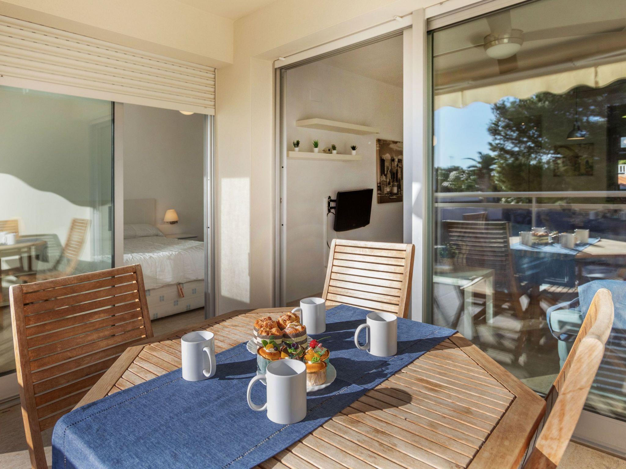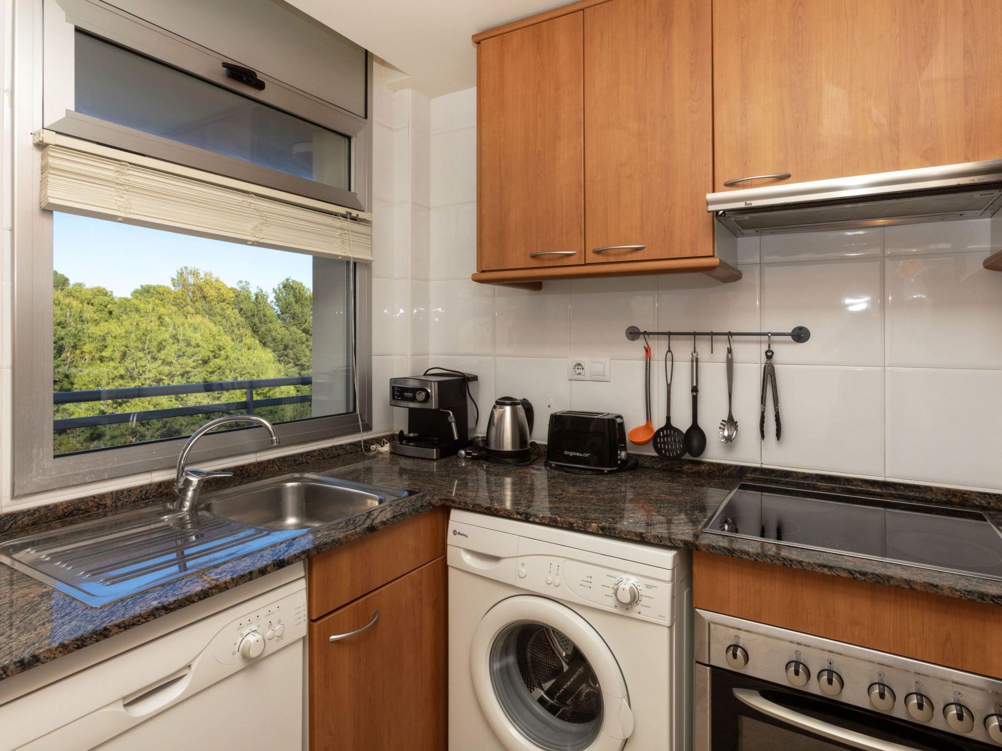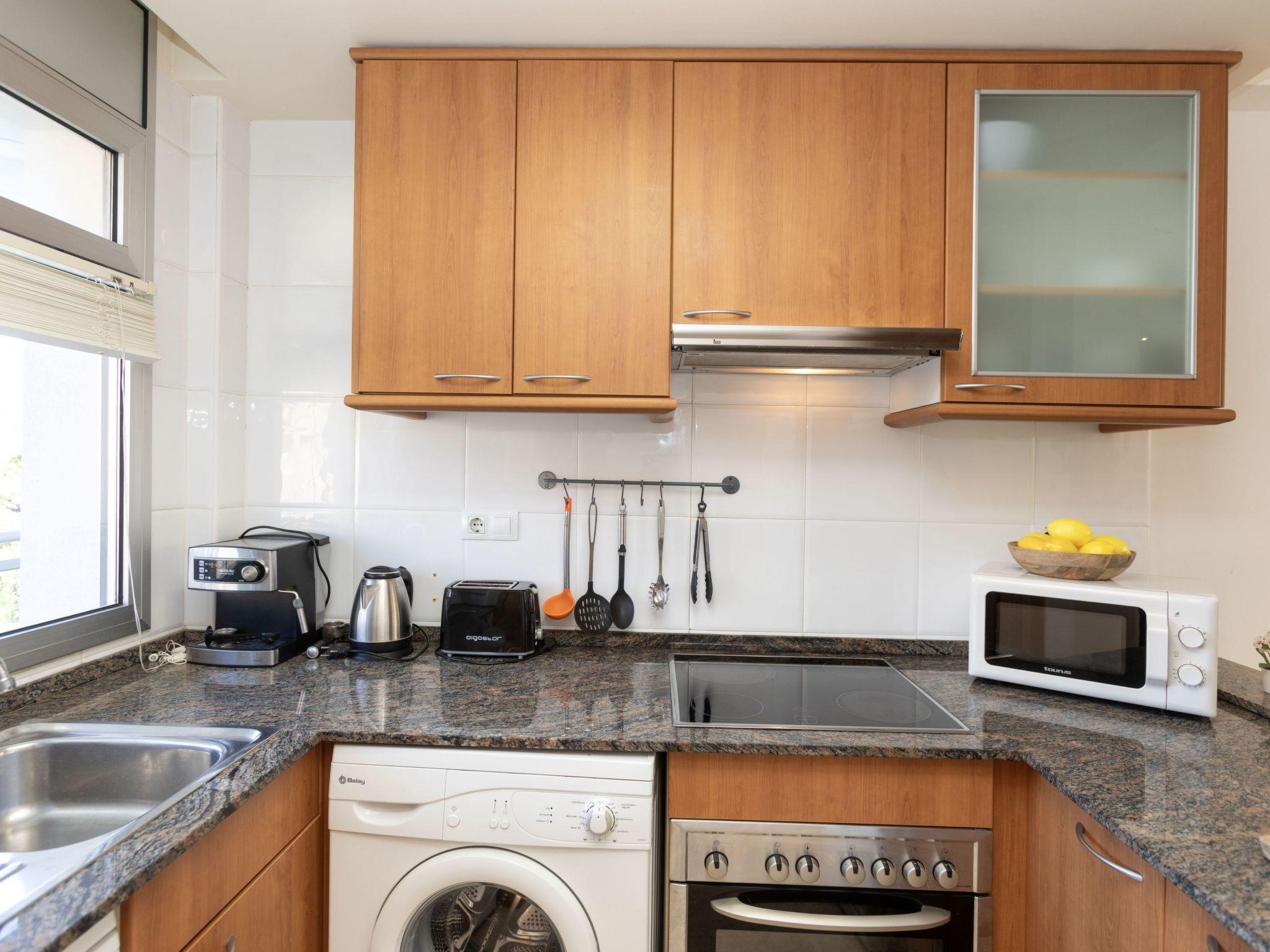 "Cala Llobeta", 3-room apartment 70 m2. Comfortable and cosy furnishings: living/dining room with dining table, digital TV and fan. Exit to the balcony. 1 room with 1 double bed (135 cm), fan. Exit to the balcony. 1 room with 2 beds (90 cm), fan. Open kitchen (oven, dishwasher, 4 induction hot plates, toaster, kettle, microwave, electric coffee machine). Bath/WC. No heating option. Balcony furniture. View of the sea, the swimming pool and the garden. Facilities: washing machine, iron, hair dryer. Parking space n 20 (1 car). Please note: maximum 1 pet/ dog allowed. TV only ES. HUTTE-044794 // Reg. Nr.: ESFCTU0000430200006188330000000000000000HUTTE-0447943