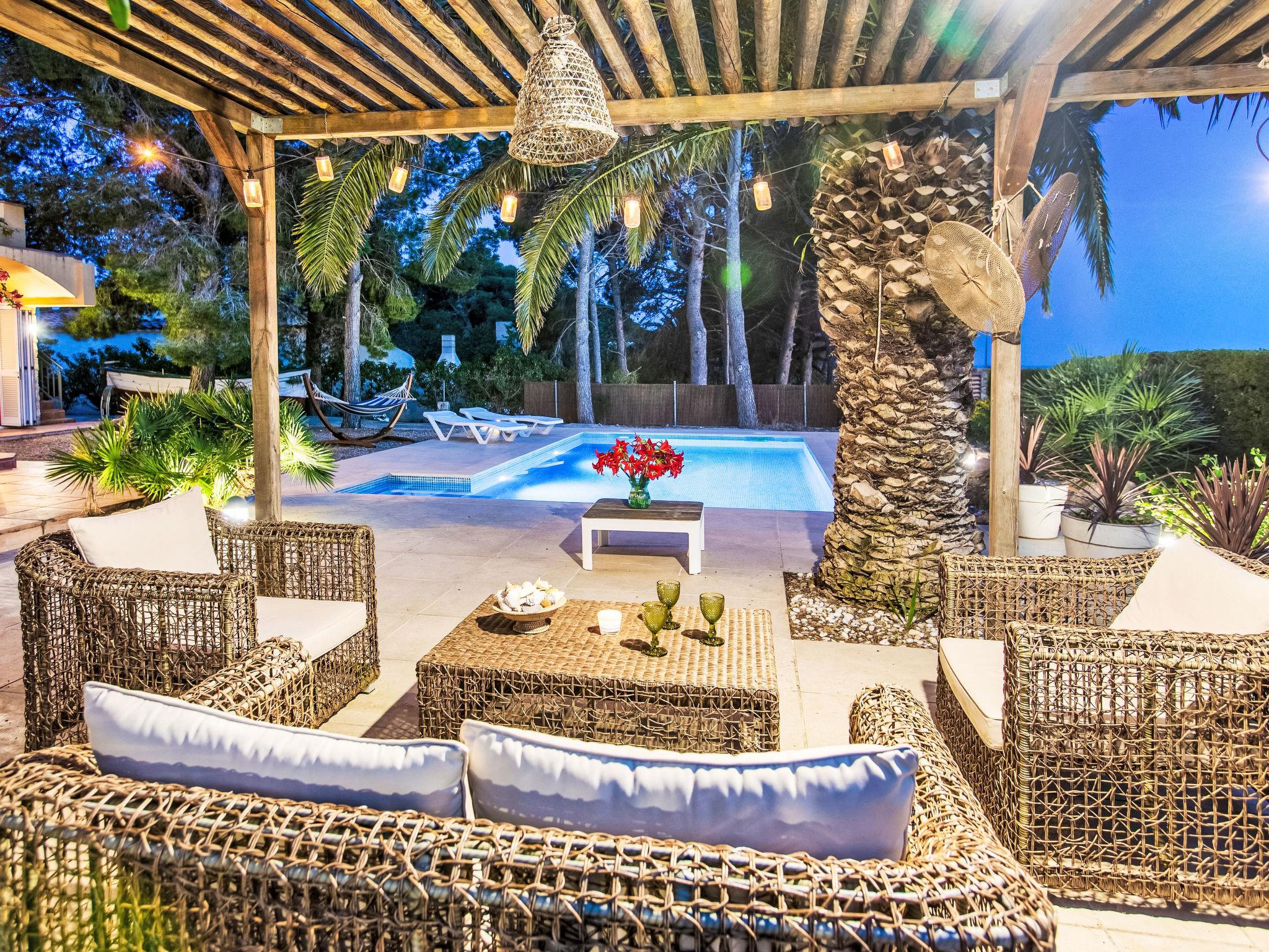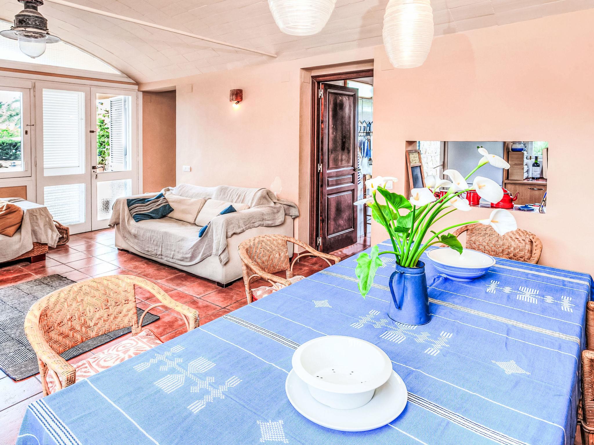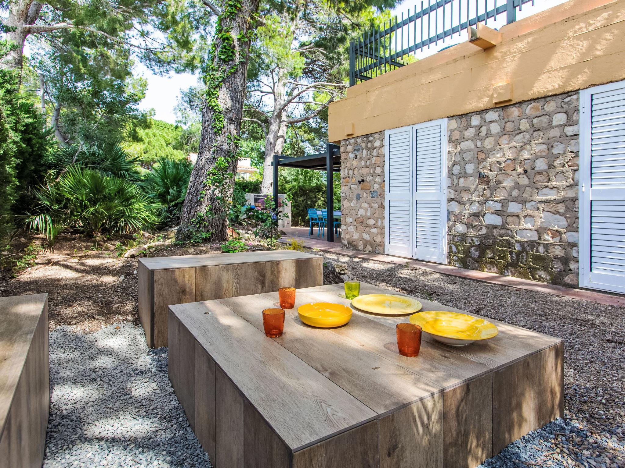 "Villa Platja Calafato", 4-room villa 180 m2. Very comfortable and tasteful furnishings: living/dining room with digital TV and air conditioning. Exit to the terrace. 1 room with 1 french bed (135 cm). 1 room with 1 x 2 bunk beds (90 cm). 1 room with 2 beds (90 cm). Entrance hall with air conditioning. Kitchen (2 hot plates, oven, dishwasher, 2 ceramic glass hob hotplates, toaster, kettle, microwave, electric coffee machine). 2 showers/WC. Boiler (100 litres). No heating option. Patio. Terrace furniture, barbecue, covered balcony, sitting area. Facilities: washing machine, iron, children's high chair, baby cot, hair dryer. Internet (WiFi, free). Parking at the house. Maximum 2 pets/ dogs allowed. HUTTE-001173 // Reg. Nr.: ESFCTU0000430200003983220000000000000000HUTTE-0011739