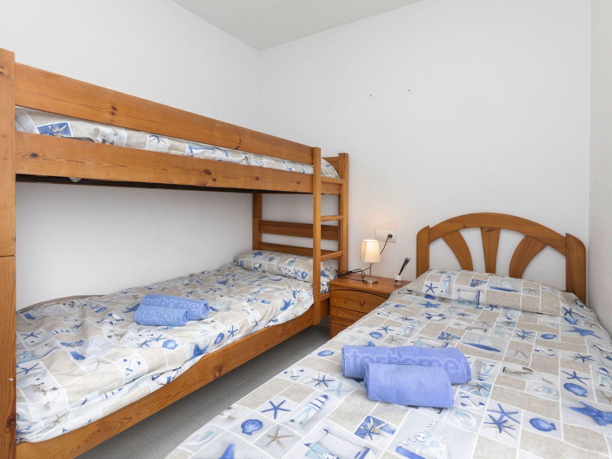 "Villa Cambrils", 4-room house 85 m2. Simple and comfortable furnishings: living/dining room with dining table and satellite TV. Exit to the terrace. 1 room with 1 french bed (150 cm), bath/WC and air conditioning. Open kitchen (oven, 4 ceramic glass hob hotplates, toaster, kettle, microwave, electric coffee machine). Upper floor: walk-through room with air conditioning. 1 room with 1 bed (90 cm), 1 x 2 bunk beds (90 cm). Exit to the terrace. 1 room with 1 french bed (150 cm). Exit to the terrace. Shower/WC. Boiler (120 litres). No heating option. Terrace furniture, barbecue. Facilities: washing machine, iron, children's high chair, baby cot, hair dryer. Internet (WiFi, free). Parking at the house. Please note: maximum 1 pet/ dog allowed. TV only FR. HUTTE-059004