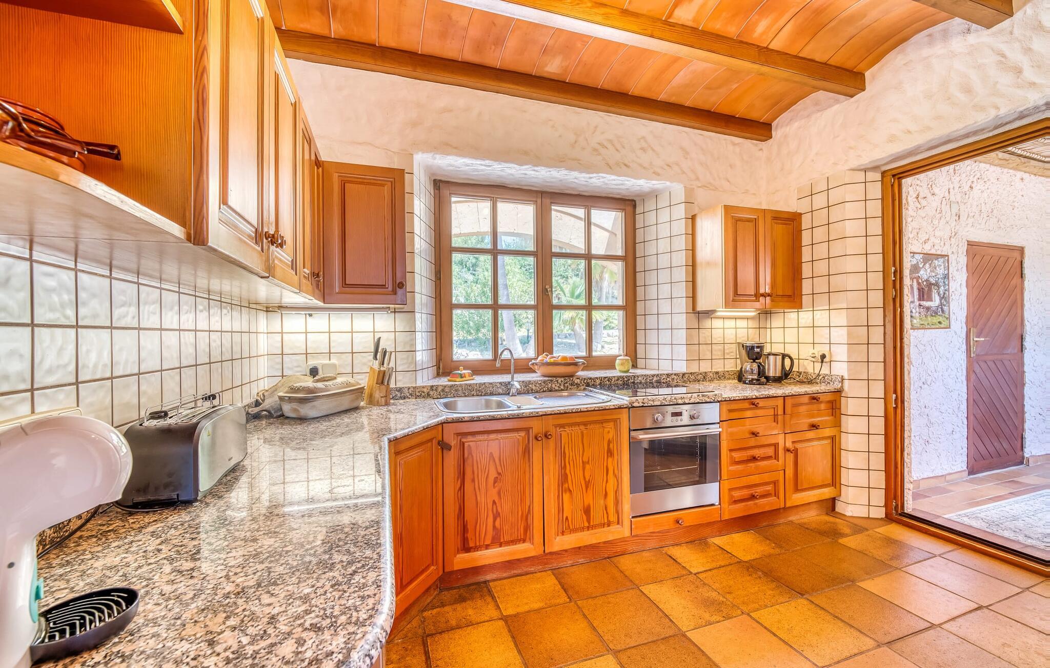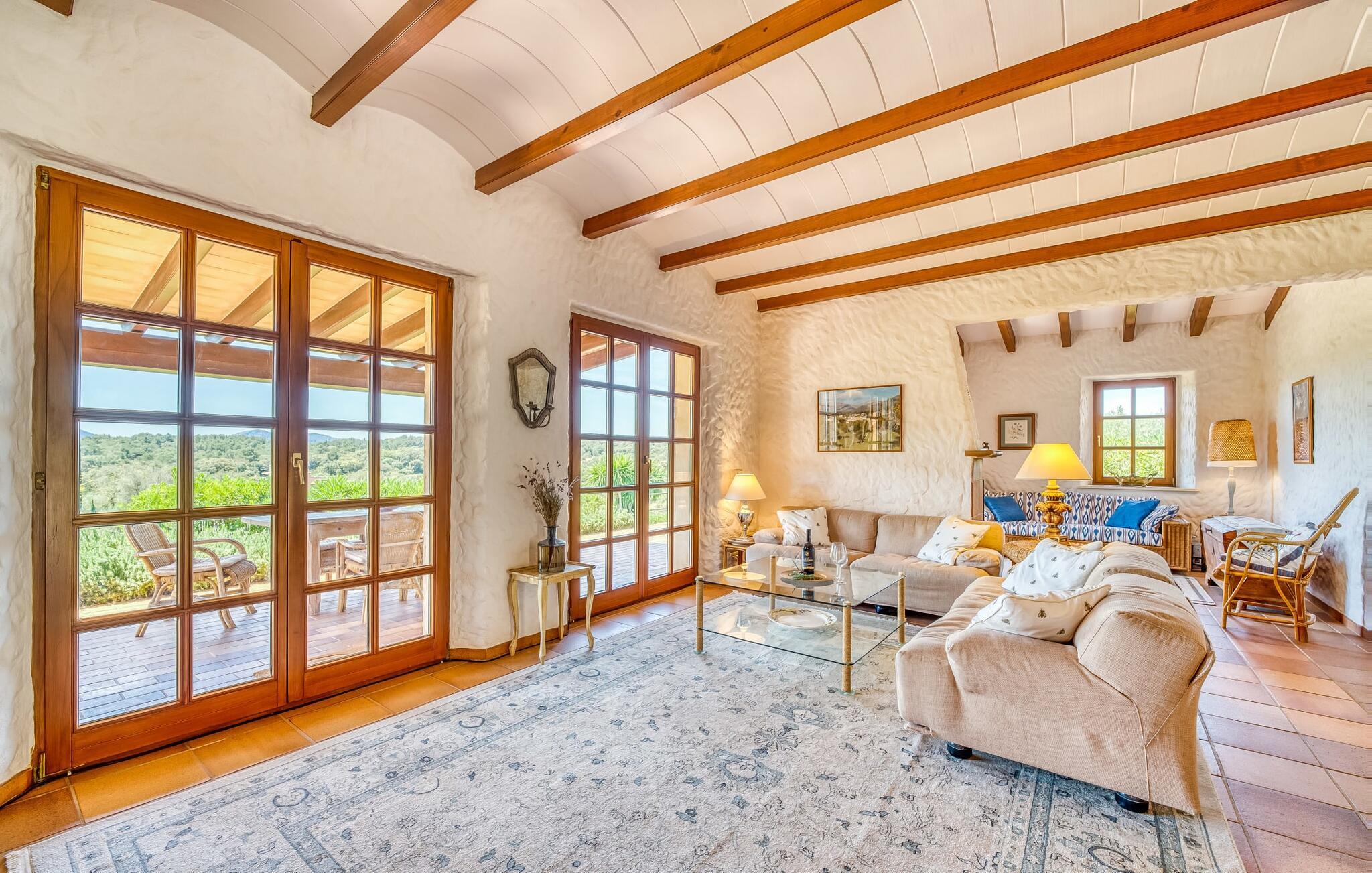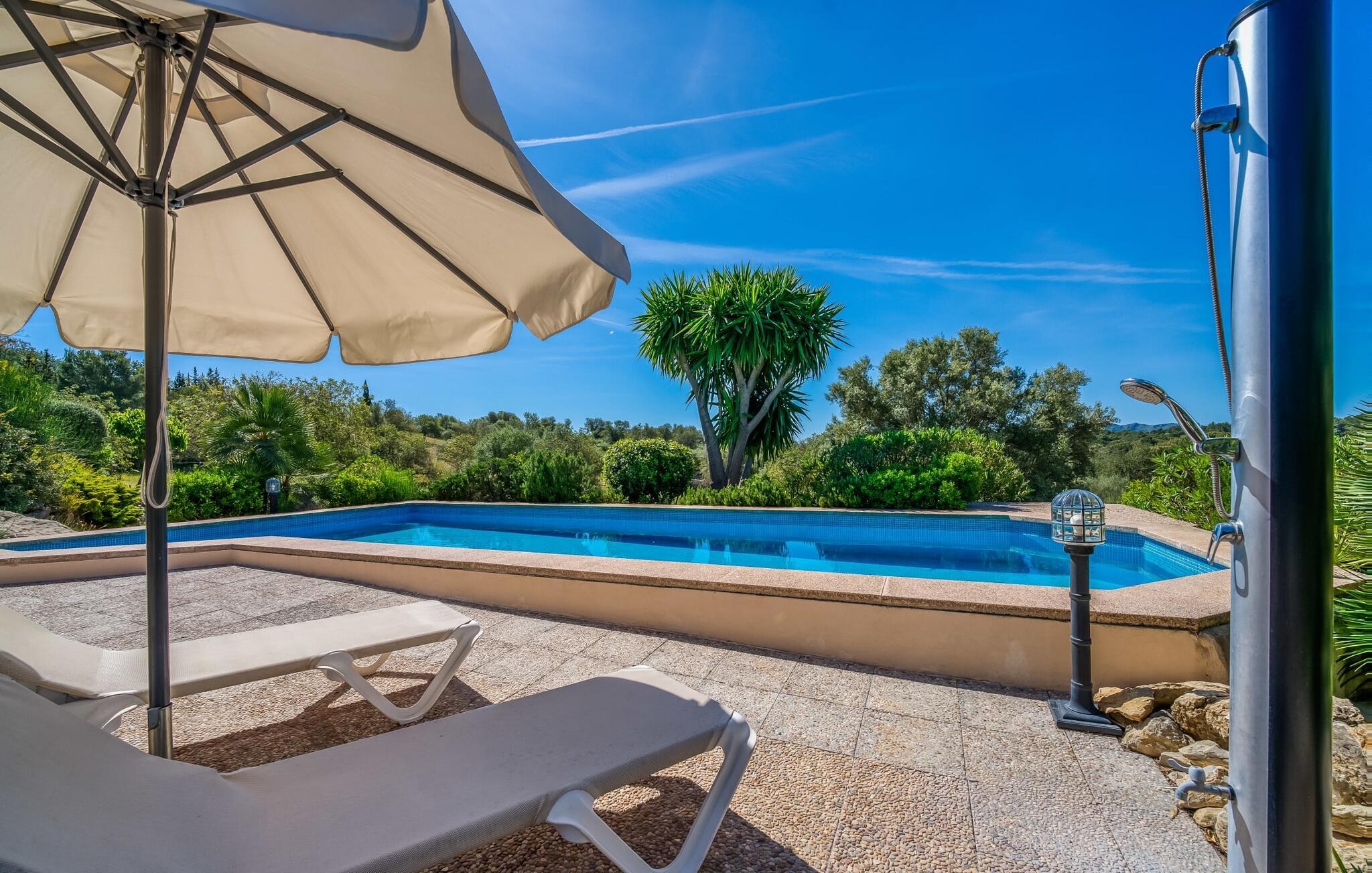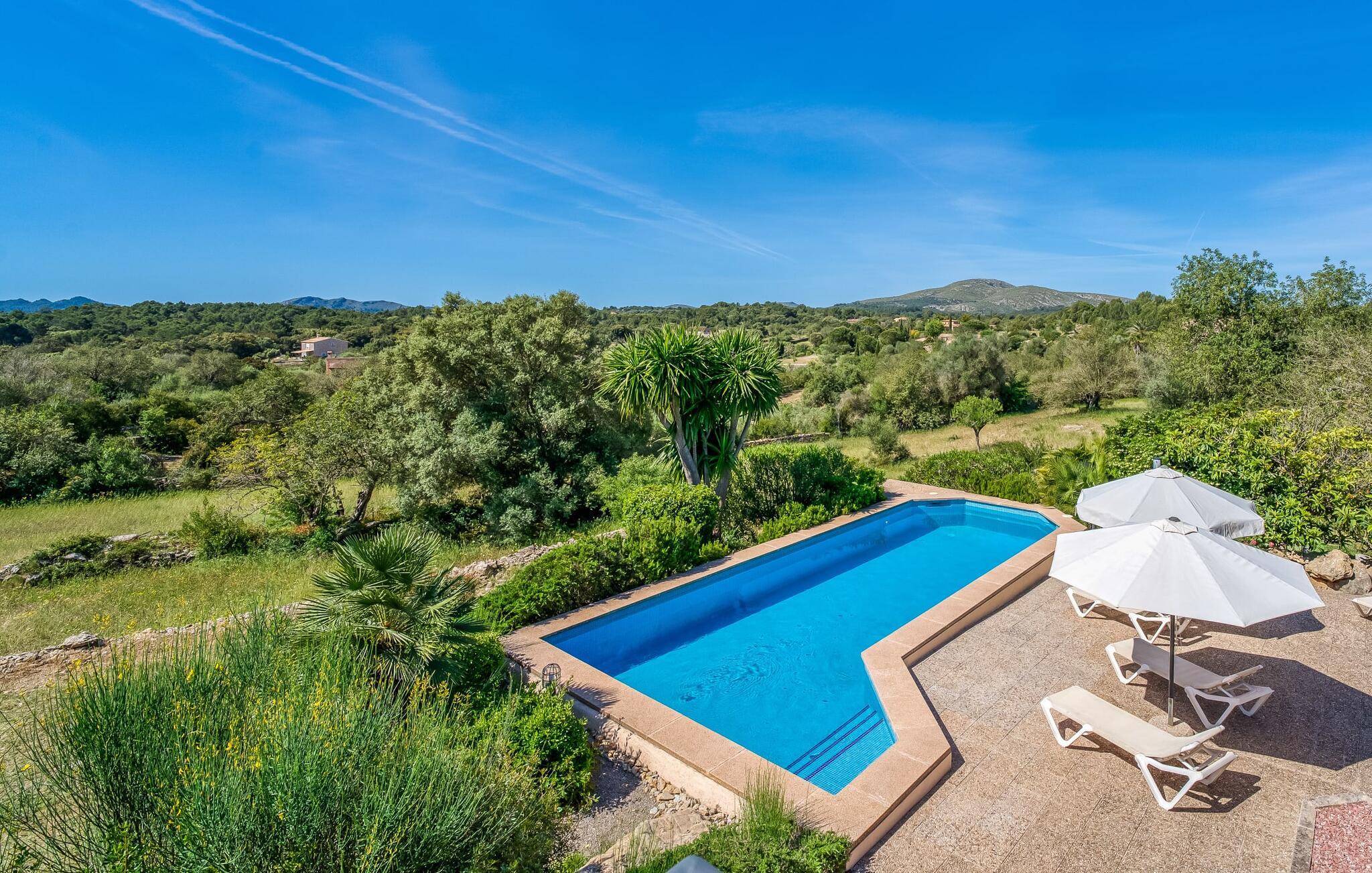 Umgeben von Palmen-, Mandel-, Oliven- und Feigenbäumen grenzt die Villa direkt an ein Naturschutzgebiet. Das sonnige Anwesen in Hanglage bietet eine atemberaubende Aussicht und eine Reihe von Außenbereichen, die Sie genießen können, vom großen Pool bis zum einladenden Grillplatz. Entspannen Sie sich unter den hohen Palmen am Pool, die mit klarem Brunnenwasser gefüllt sind, oder entspannen Sie sich auf der Terrasse und genießen Sie die Aussicht. Ein überdachter Parkplatz ist ebenfalls vorhanden.