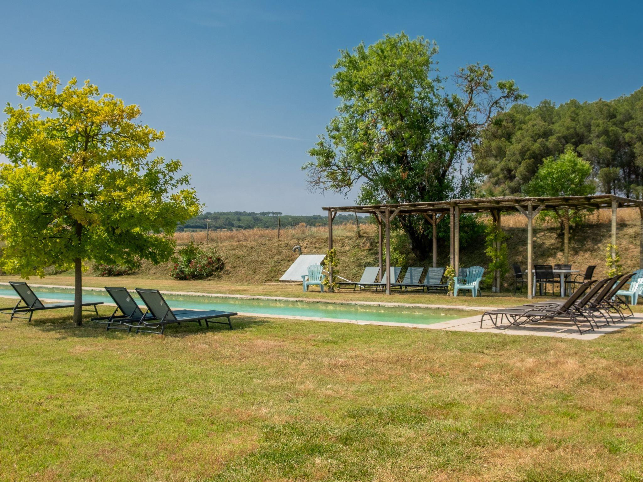 The swimming pool is set in a large fenced area with a beautiful lawn garden, sun loungers and a pergola-covered lounge.