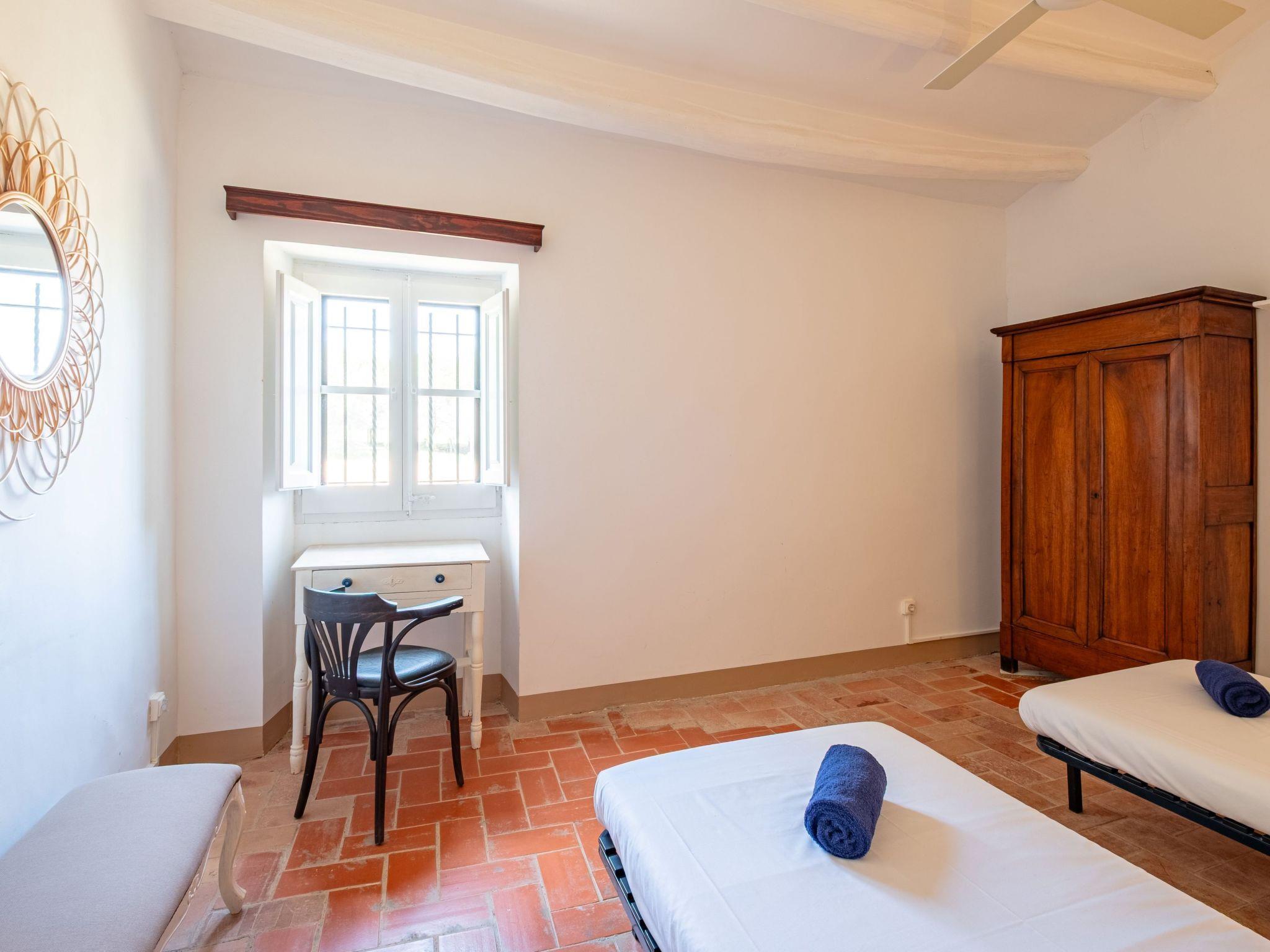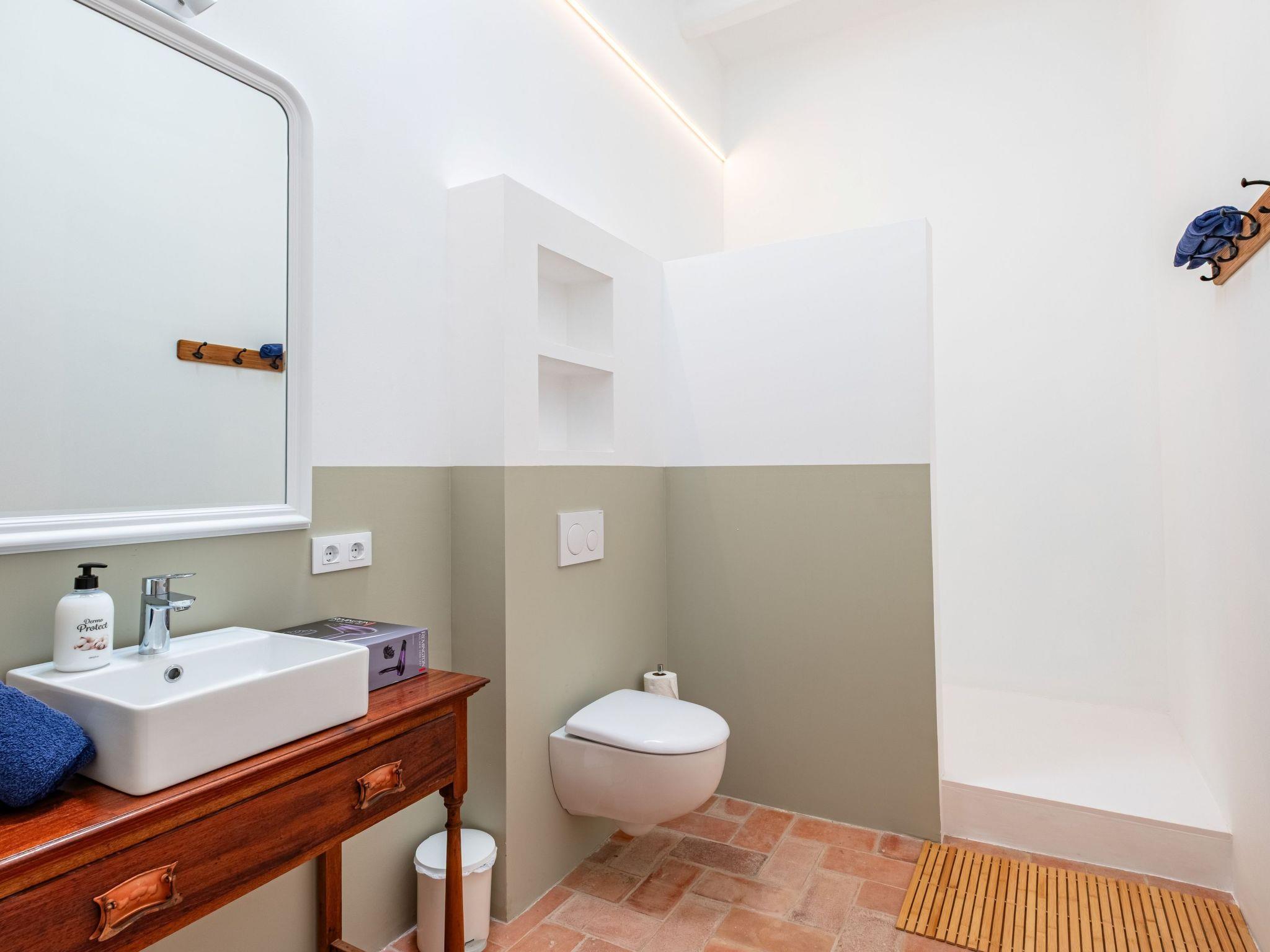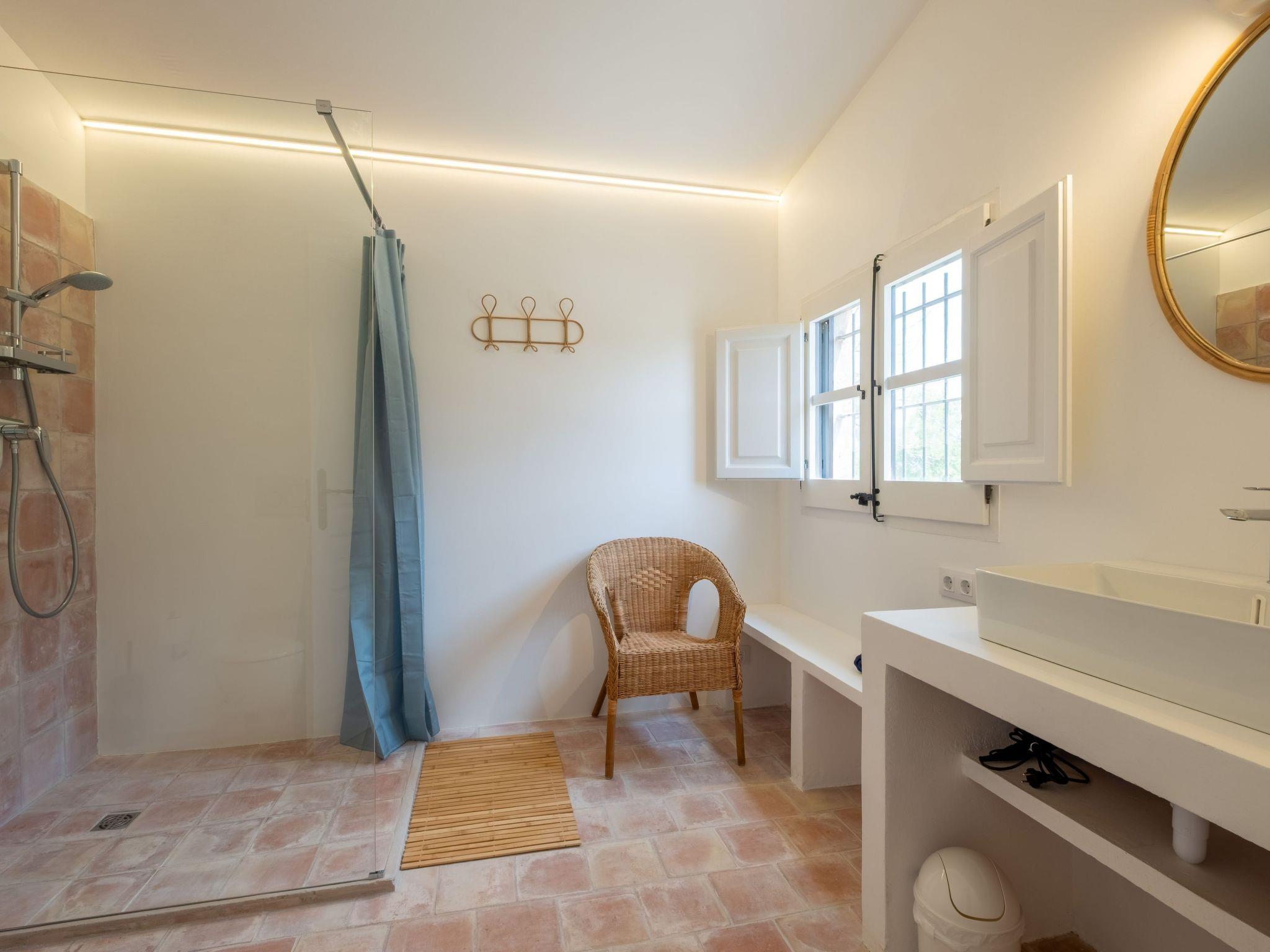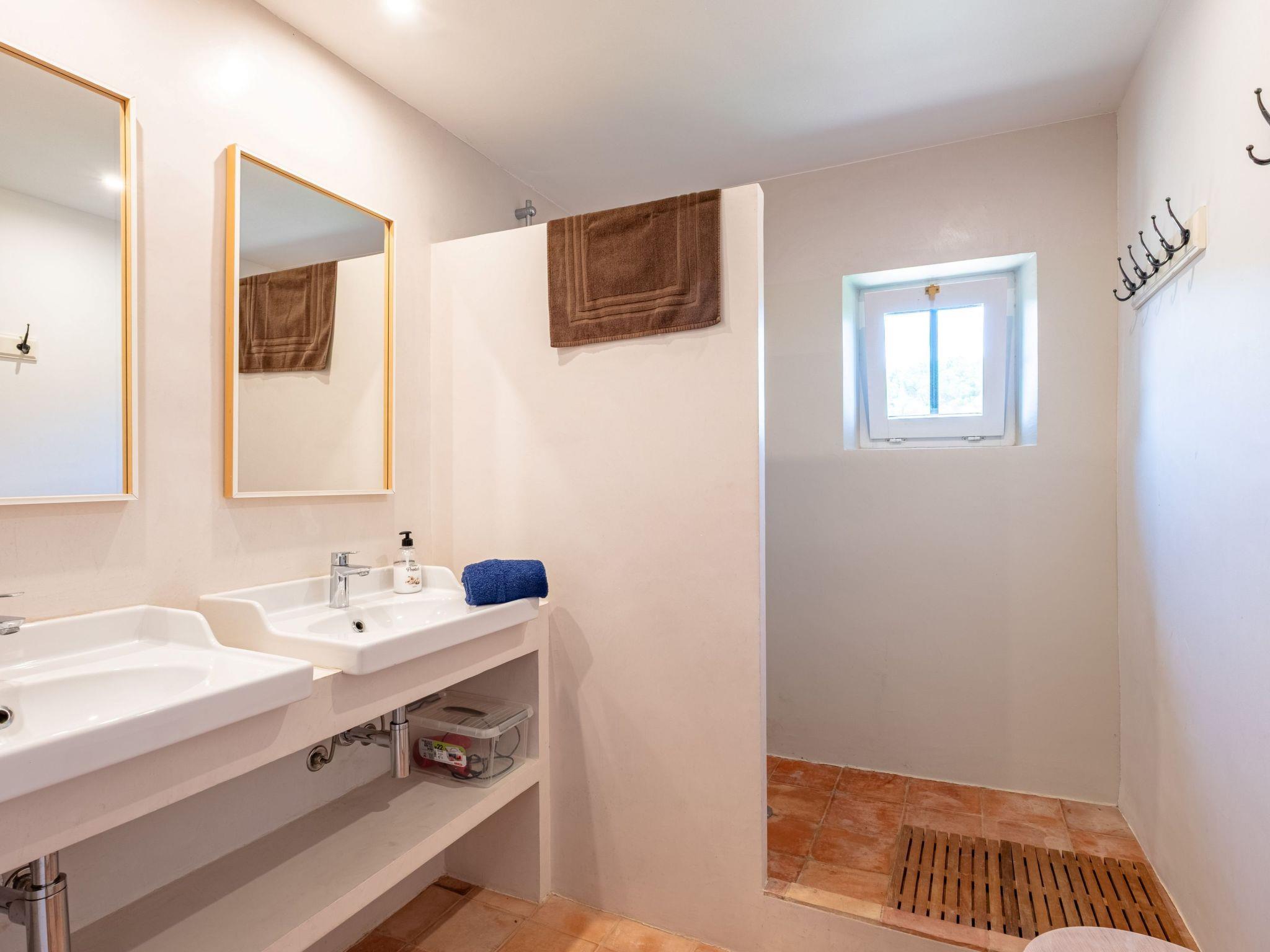 A staircase leads to the upper floor where a hall of 35 m2 leads to three suites (with bathroom and toilet, 2 of them with double bed and the other with two single beds), a double bedroom with 2 single beds, a bedroom for 4 people with 4 single beds, a bathroom with bath and toilet, a separate toilet and a bathroom with shower.