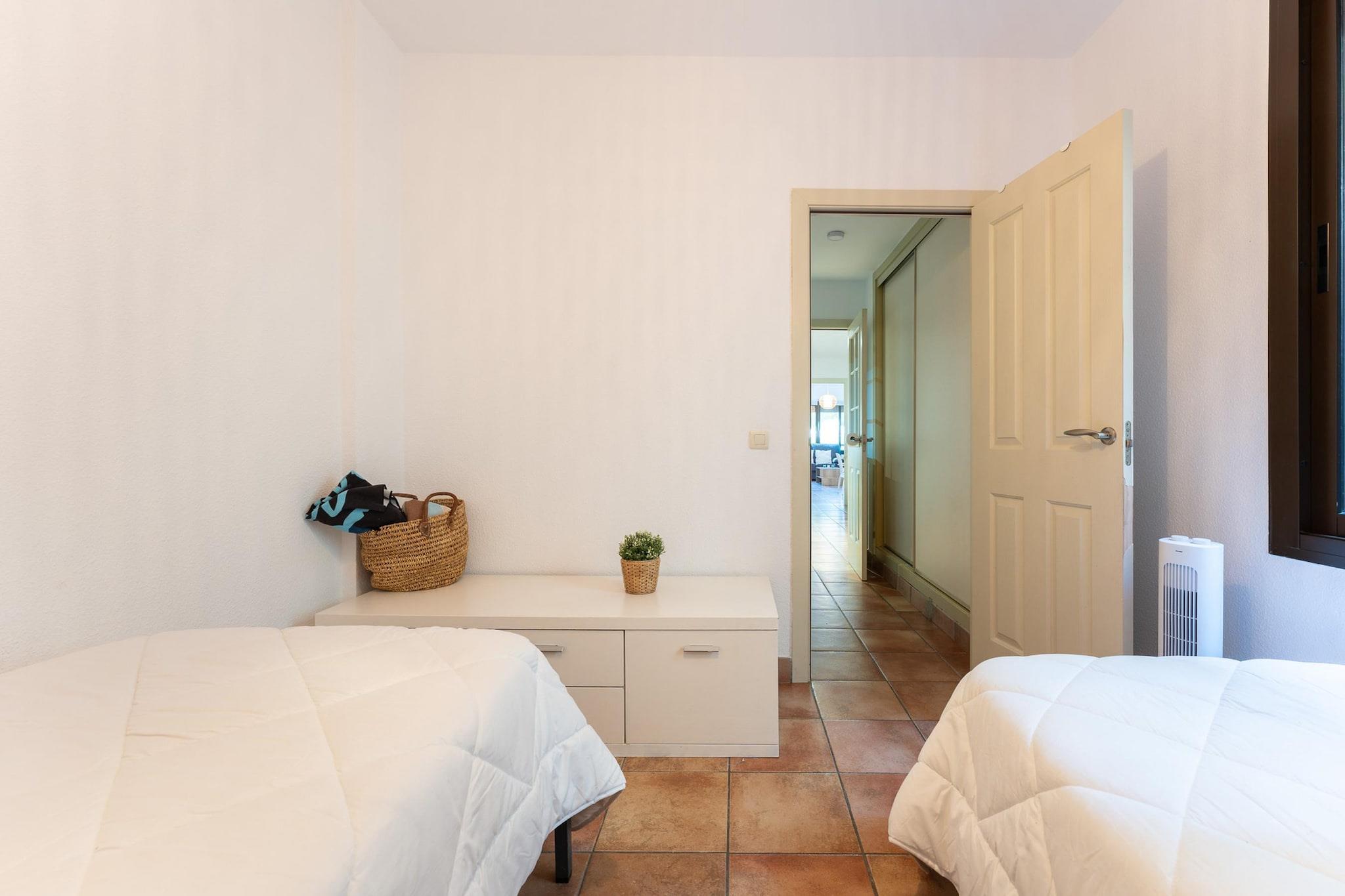 Kitchen(electric kettle, toaster, coffee machine, oven, microwave, fridge-freezer, dishes and cutlery, Cooking basics), Living/diningroom(TV, dining table, seating area), bedroom(single bed, single bed), bedroom(double bed), bathroom(bathtub with shower, washbasin, bidet), bathroom(shower, washbasin, bidet), washing machine, air conditioning, terrace, garden furniture, swimming pool(shared with other guests), lift