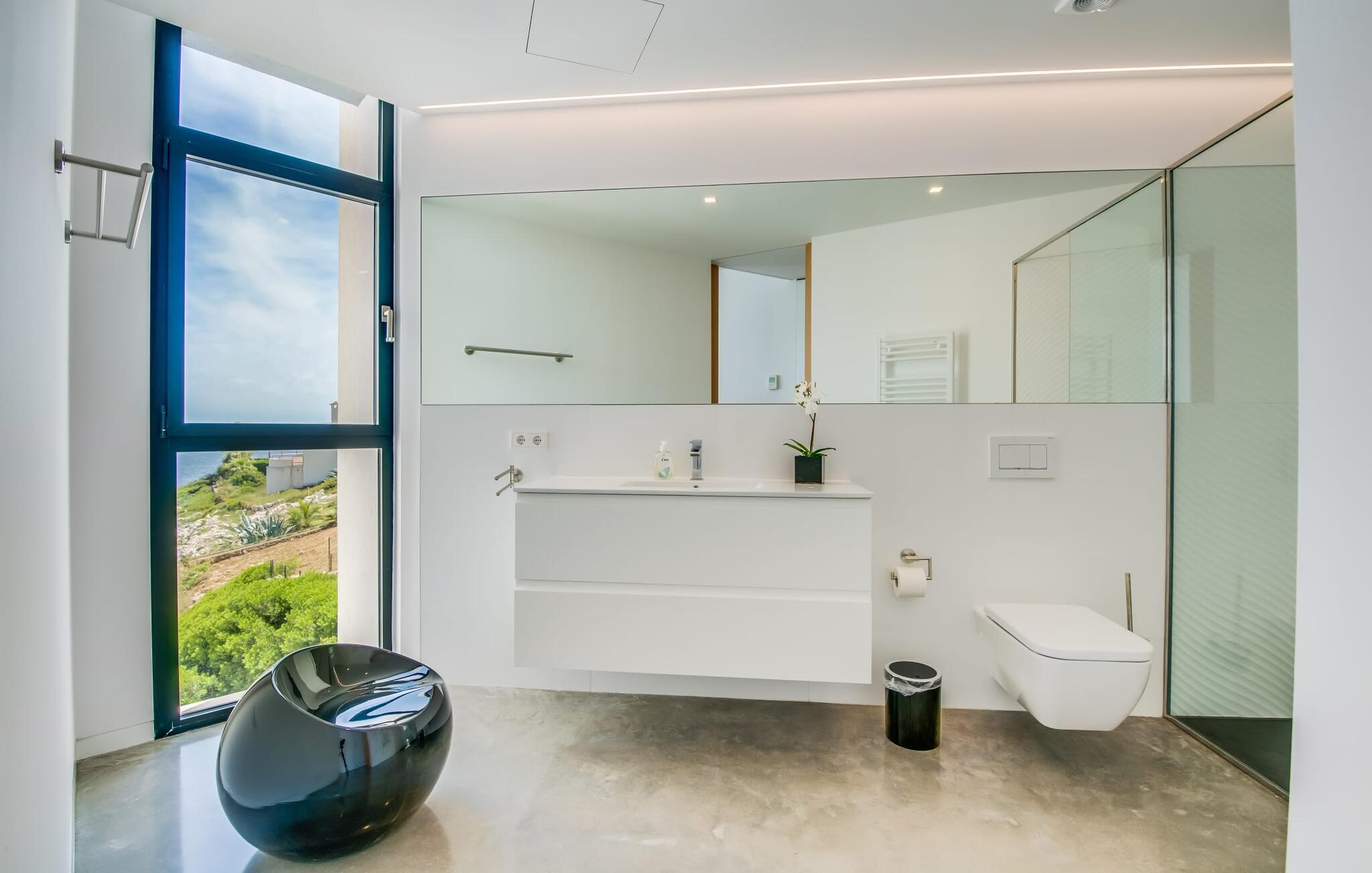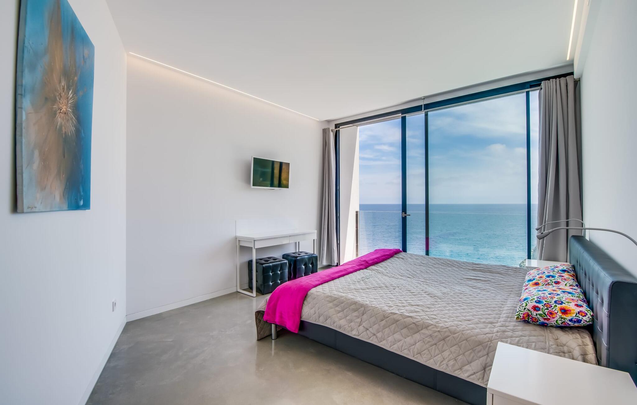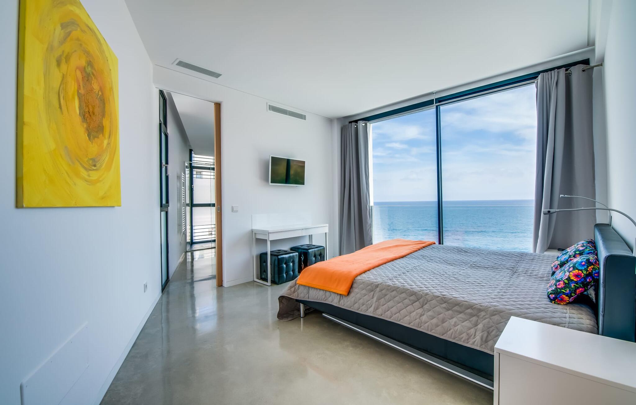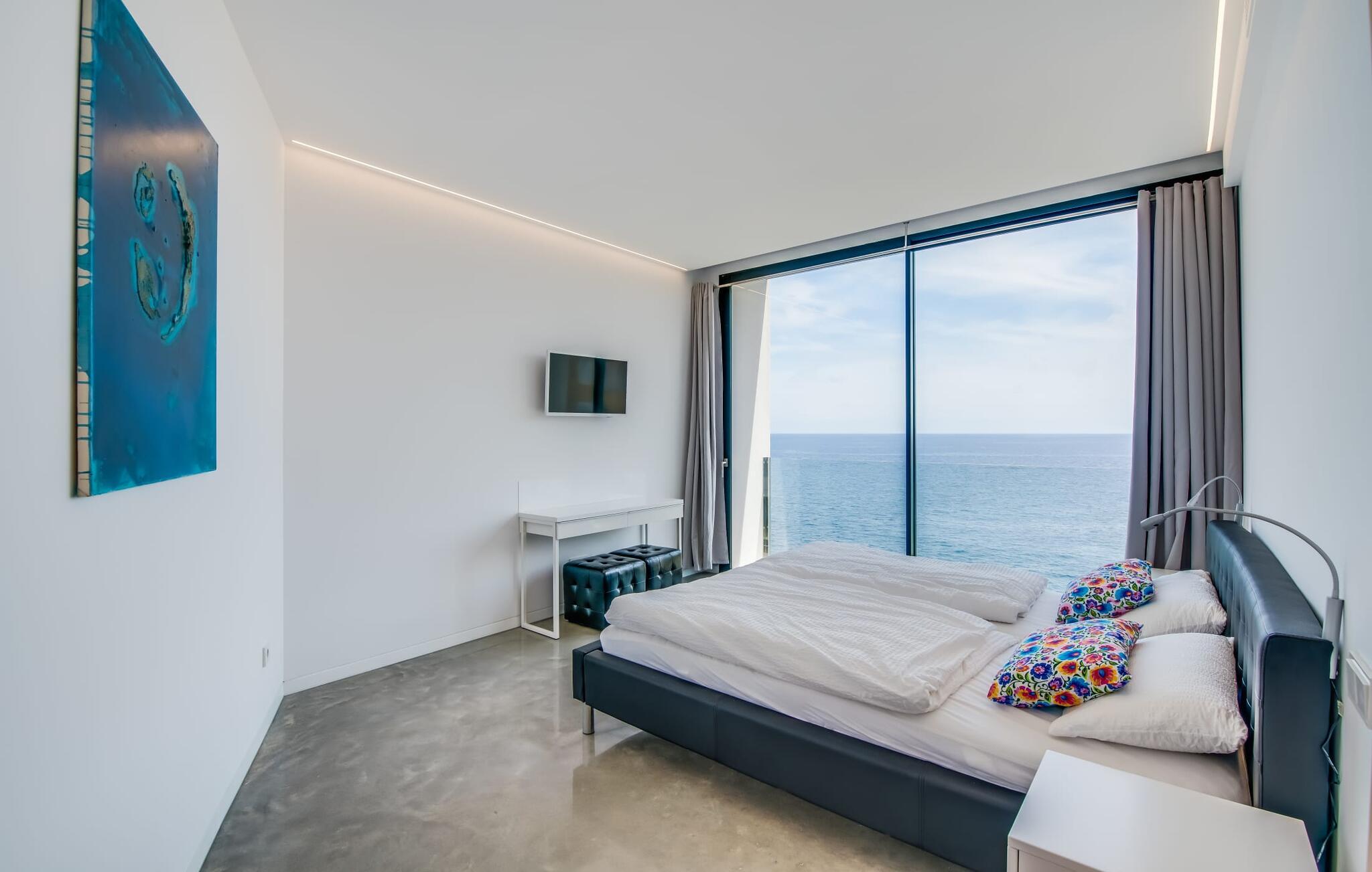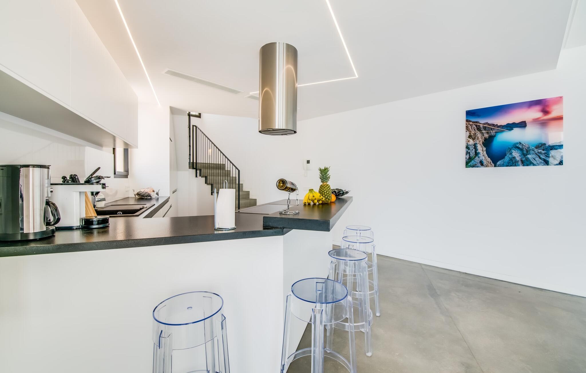 Von der Meerseite aus verleihen die 12 m hohen, vertikalen Säulen der Villa das Aussehen einer äußerst modernen schlossähnlichen Anlage. Gleichzeitig sucht das aufwändige Lichtkonzept seinesgleichen, denn horizontale Lamellen in Gebäudehöhe lassen viel Sonnenlicht aus Ost und West herein und unterstreichen die dominierenden Farben des Innenraums – Grau, Schwarz und Weiß – elegant. Riesige Panorama-Schiebefenster vermitteln auch im stilvollen Wohn-, Ess- und Kochbereich Outdoor-Feeling: Die Küche, die selbst höchste Ansprüche erfüllt, weiß mit Arbeitsplatte und Tresen aus gehämmertem schwarzem Zaire-Granit, einer Espressomaschine, einer professionellen Kaffeemaschine Eine Maschine für acht Personen, ein Geschirrspüler sowie der Kühl-/Gefrierschrank sind nur einige Leckerbissen, die Ihnen das Leben hier erleichtern. Unzählige Designklassiker und elegante Hingucker, darunter auch aus Buchenholz, sorgen für nachhaltige Inspiration. Alle Schlafzimmer, die sich auf zwei Etagen verteilen, verfügen über geschmackvolle En-Suite-Badezimmer, Klimaanlage, einen Fernseher sowie Meerblick, während Kunstwerke an den Wänden dezente Akzente setzen. Im Erdgeschoss befindet sich außerdem ein Gäste-WC.