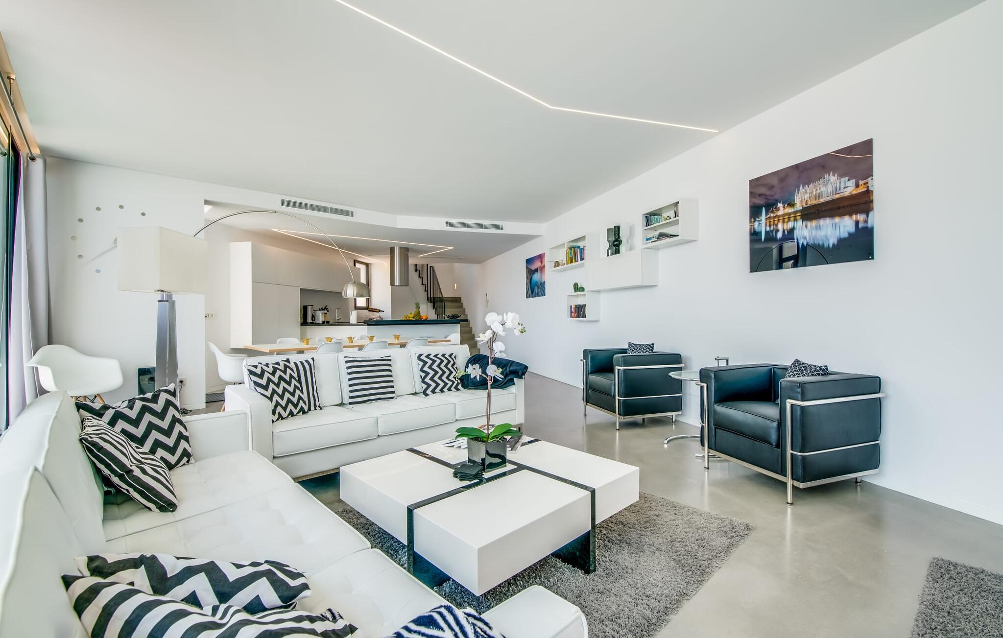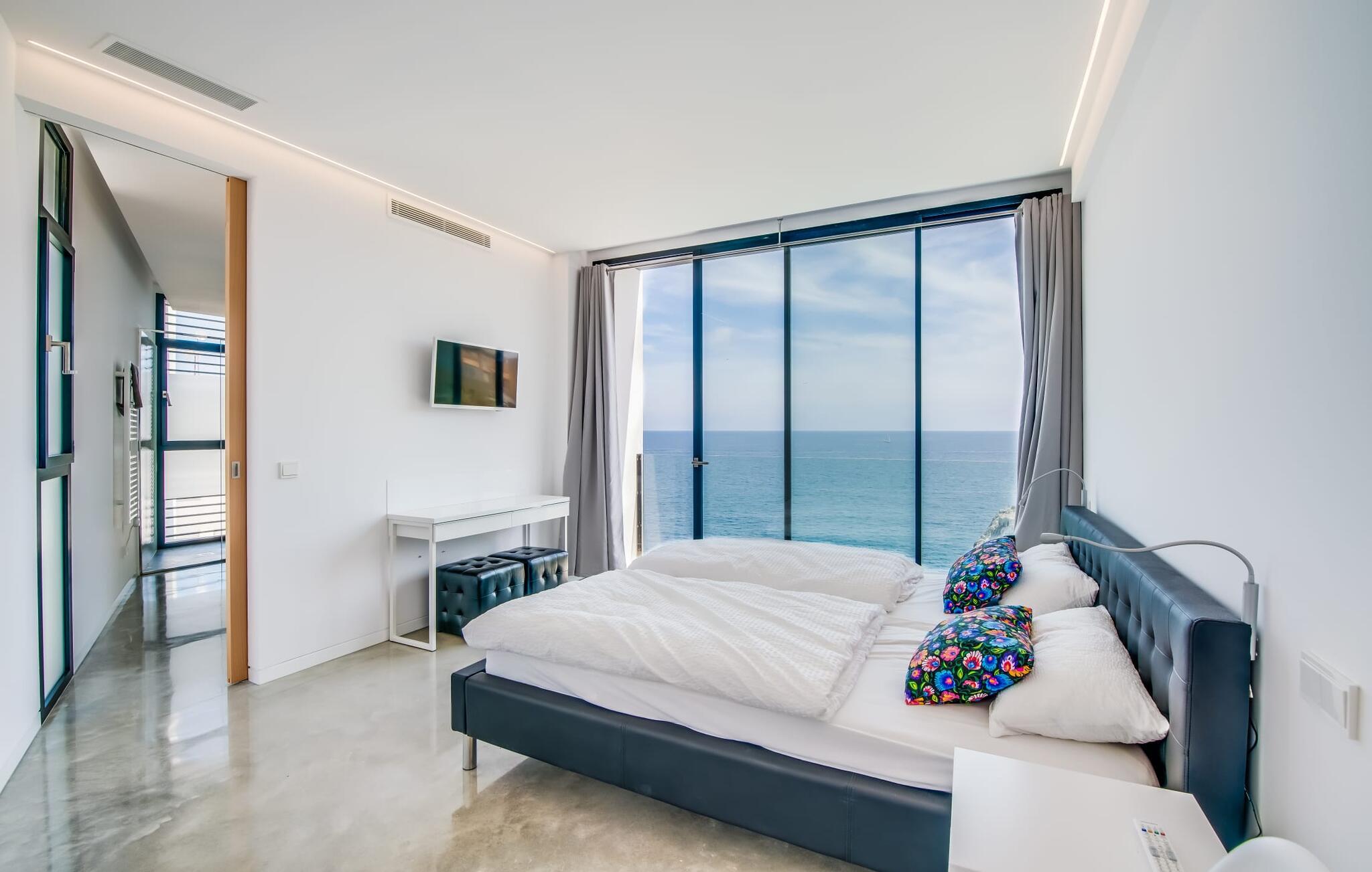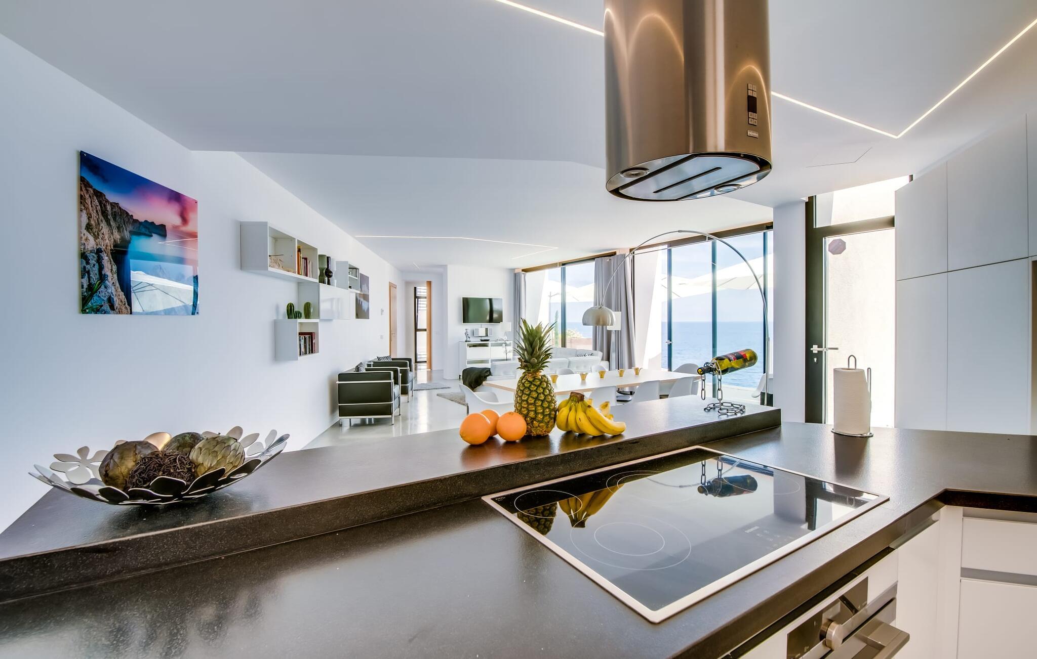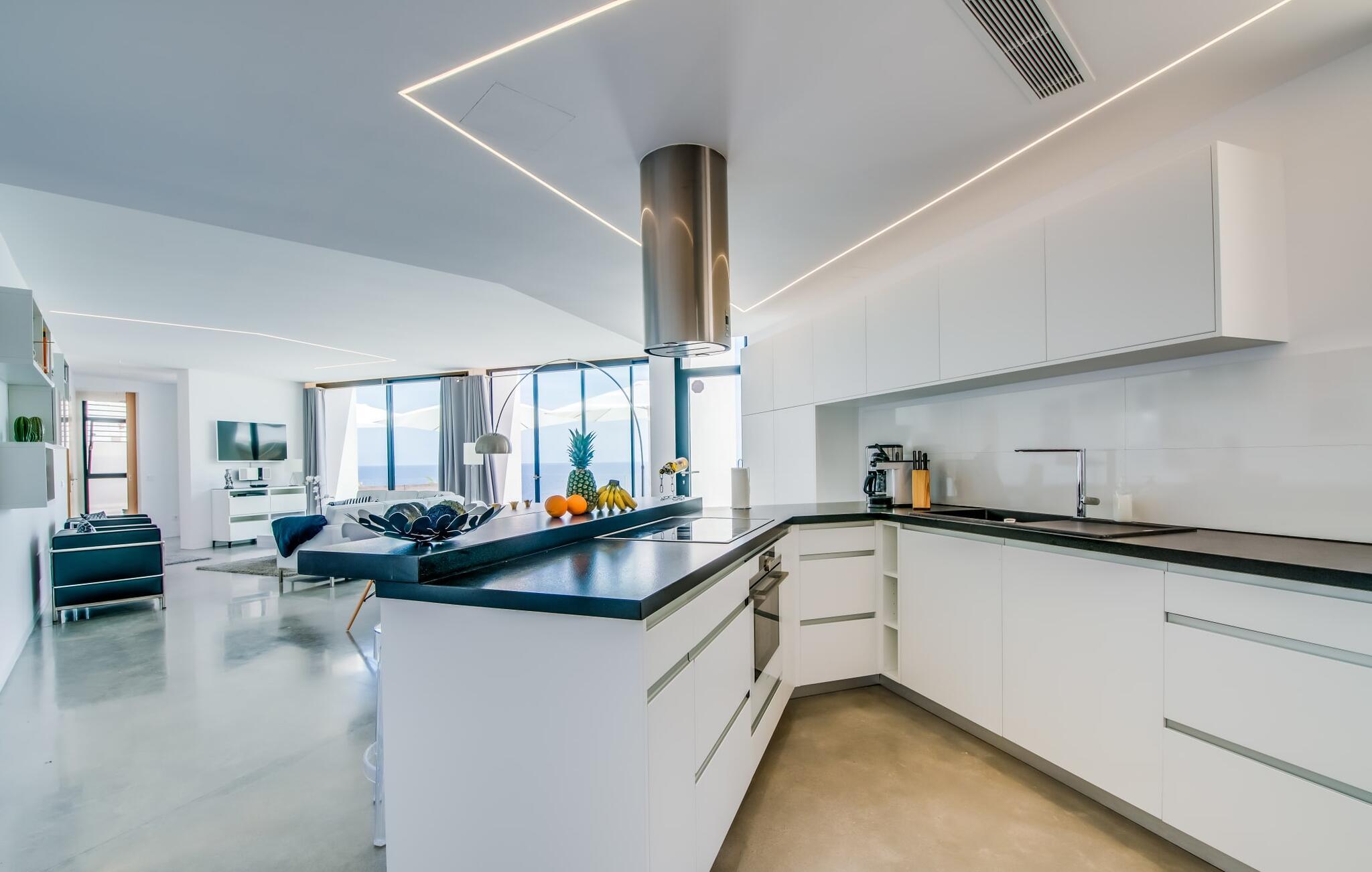 Von der Meerseite aus verleihen die 12 m hohen, vertikalen Säulen der Villa das Aussehen einer äußerst modernen schlossähnlichen Anlage. Gleichzeitig sucht das aufwändige Lichtkonzept seinesgleichen, denn horizontale Lamellen in Gebäudehöhe lassen viel Sonnenlicht aus Ost und West herein und unterstreichen die dominierenden Farben des Innenraums – Grau, Schwarz und Weiß – elegant. Riesige Panorama-Schiebefenster vermitteln auch im stilvollen Wohn-, Ess- und Kochbereich Outdoor-Feeling: Die Küche, die selbst höchste Ansprüche erfüllt, weiß mit Arbeitsplatte und Tresen aus gehämmertem schwarzem Zaire-Granit, einer Espressomaschine, einer professionellen Kaffeemaschine Eine Maschine für acht Personen, ein Geschirrspüler sowie der Kühl-/Gefrierschrank sind nur einige Leckerbissen, die Ihnen das Leben hier erleichtern. Unzählige Designklassiker und elegante Hingucker, darunter auch aus Buchenholz, sorgen für nachhaltige Inspiration. Alle Schlafzimmer, die sich auf zwei Etagen verteilen, verfügen über geschmackvolle En-Suite-Badezimmer, Klimaanlage, einen Fernseher sowie Meerblick, während Kunstwerke an den Wänden dezente Akzente setzen. Im Erdgeschoss befindet sich außerdem ein Gäste-WC.