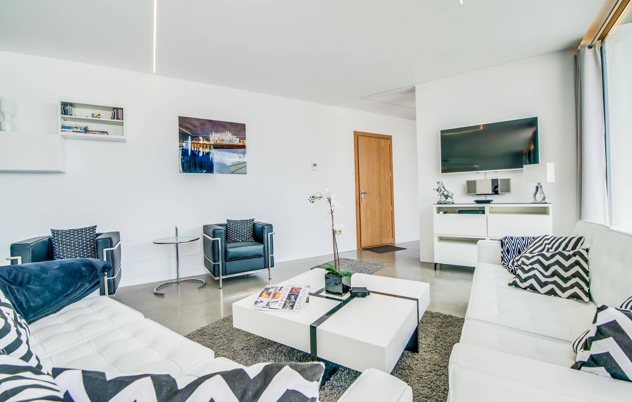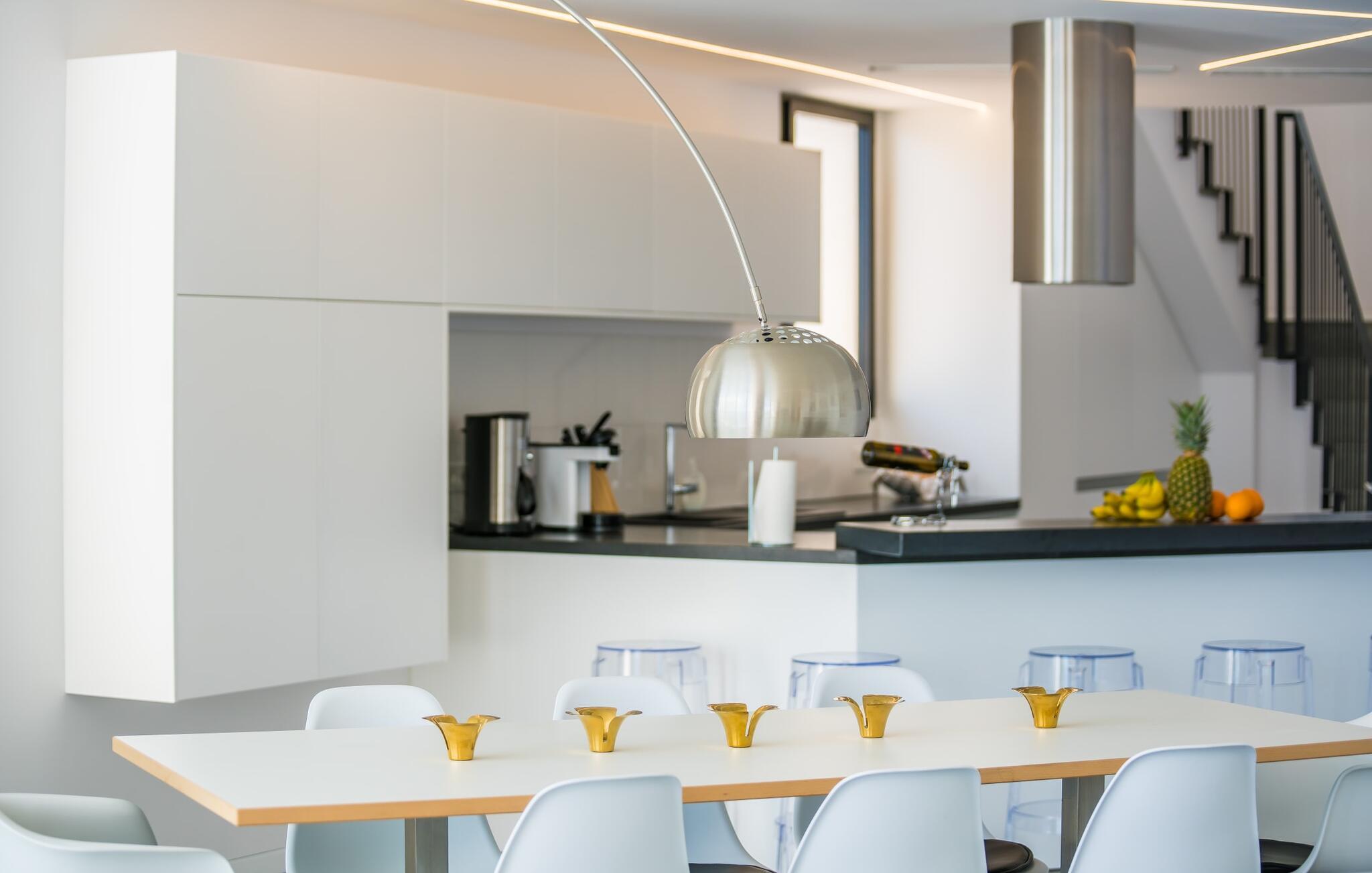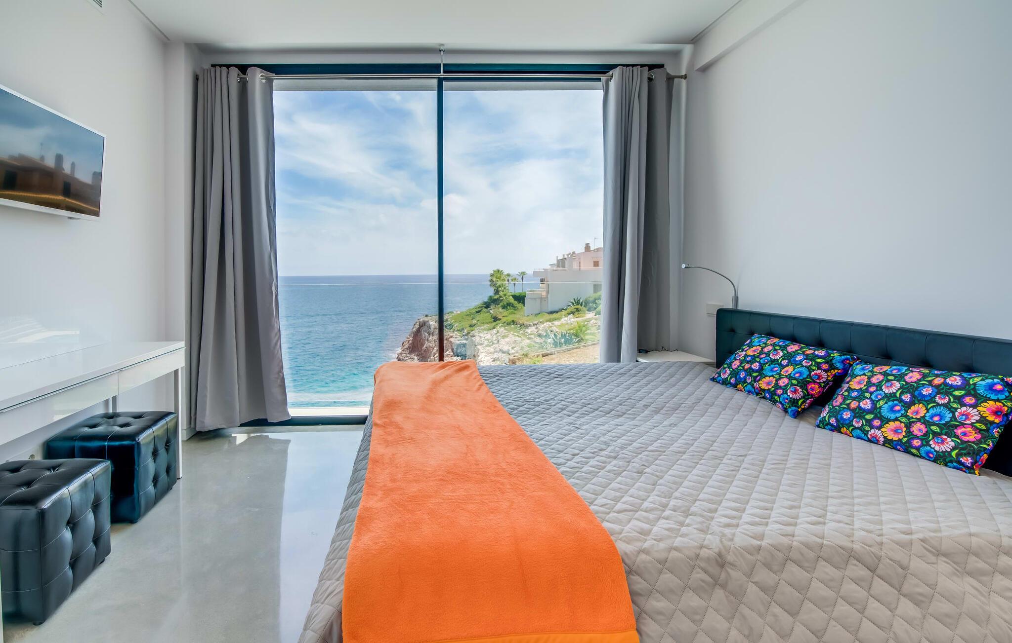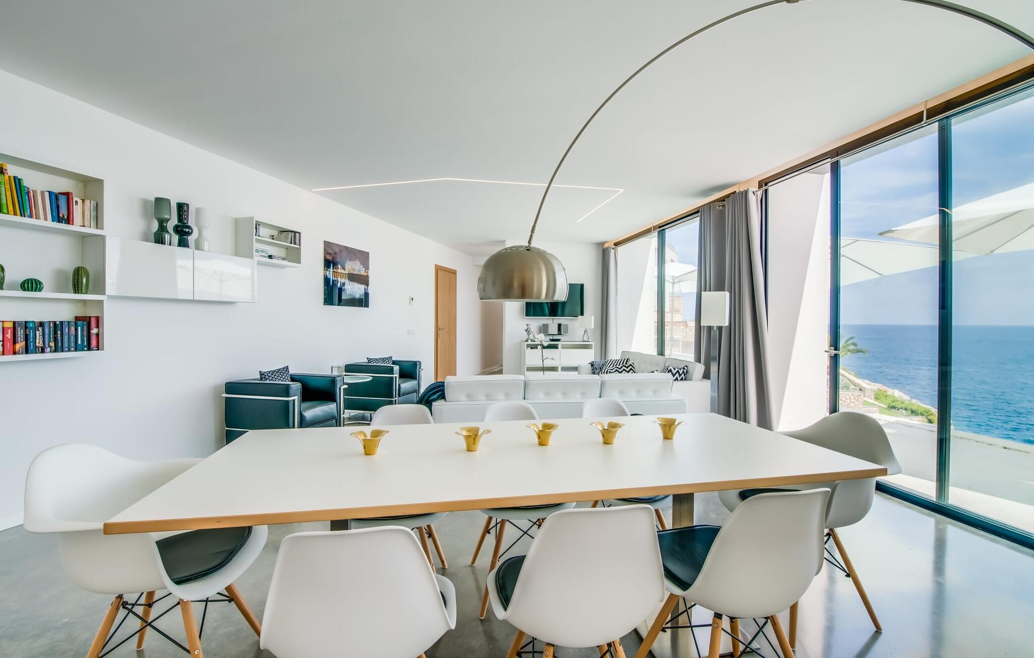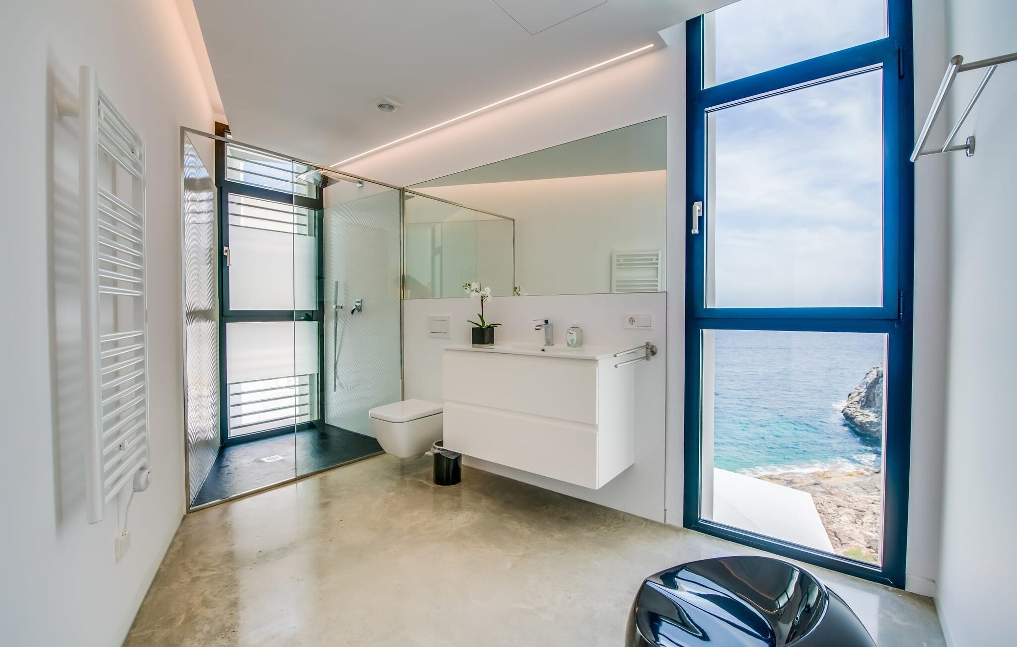 Von der Meerseite aus verleihen die 12 m hohen, vertikalen Säulen der Villa das Aussehen einer äußerst modernen schlossähnlichen Anlage. Gleichzeitig sucht das aufwändige Lichtkonzept seinesgleichen, denn horizontale Lamellen in Gebäudehöhe lassen viel Sonnenlicht aus Ost und West herein und unterstreichen die dominierenden Farben des Innenraums – Grau, Schwarz und Weiß – elegant. Riesige Panorama-Schiebefenster vermitteln auch im stilvollen Wohn-, Ess- und Kochbereich Outdoor-Feeling: Die Küche, die selbst höchste Ansprüche erfüllt, weiß mit Arbeitsplatte und Tresen aus gehämmertem schwarzem Zaire-Granit, einer Espressomaschine, einer professionellen Kaffeemaschine Eine Maschine für acht Personen, ein Geschirrspüler sowie der Kühl-/Gefrierschrank sind nur einige Leckerbissen, die Ihnen das Leben hier erleichtern. Unzählige Designklassiker und elegante Hingucker, darunter auch aus Buchenholz, sorgen für nachhaltige Inspiration. Alle Schlafzimmer, die sich auf zwei Etagen verteilen, verfügen über geschmackvolle En-Suite-Badezimmer, Klimaanlage, einen Fernseher sowie Meerblick, während Kunstwerke an den Wänden dezente Akzente setzen. Im Erdgeschoss befindet sich außerdem ein Gäste-WC.