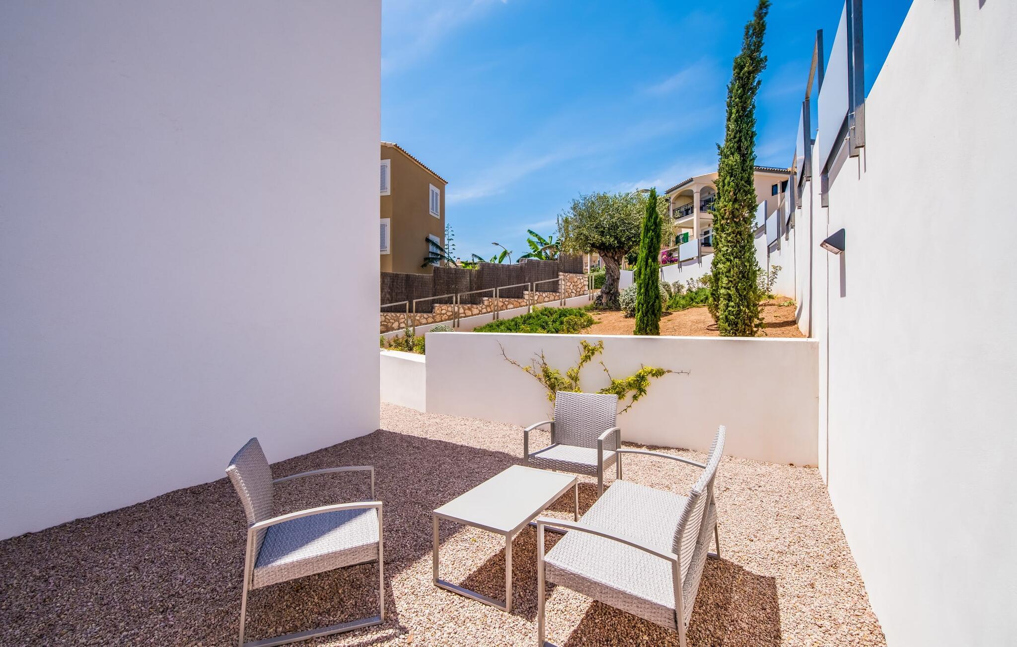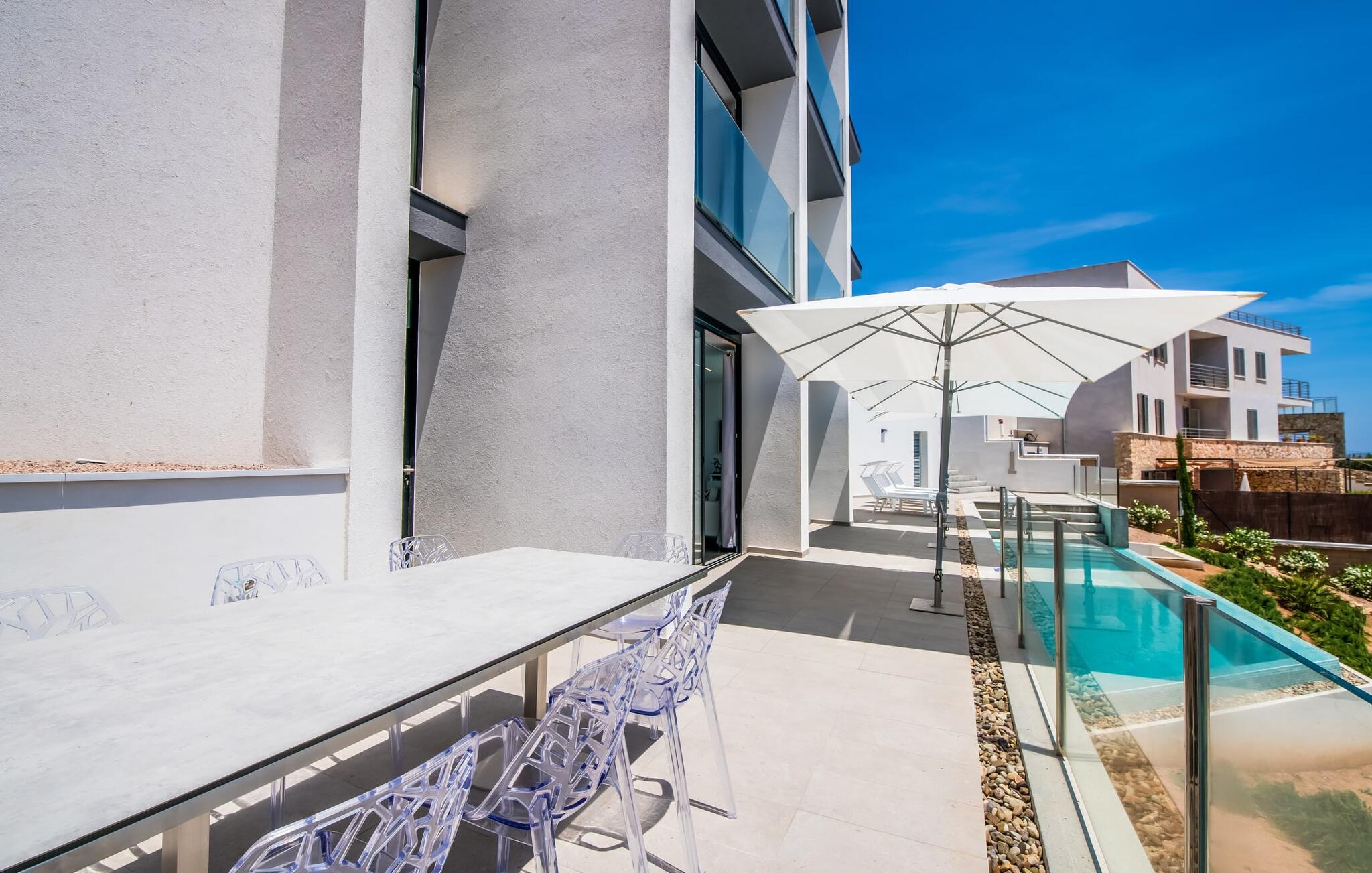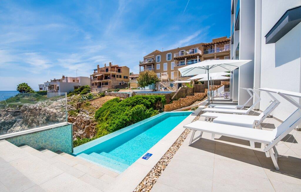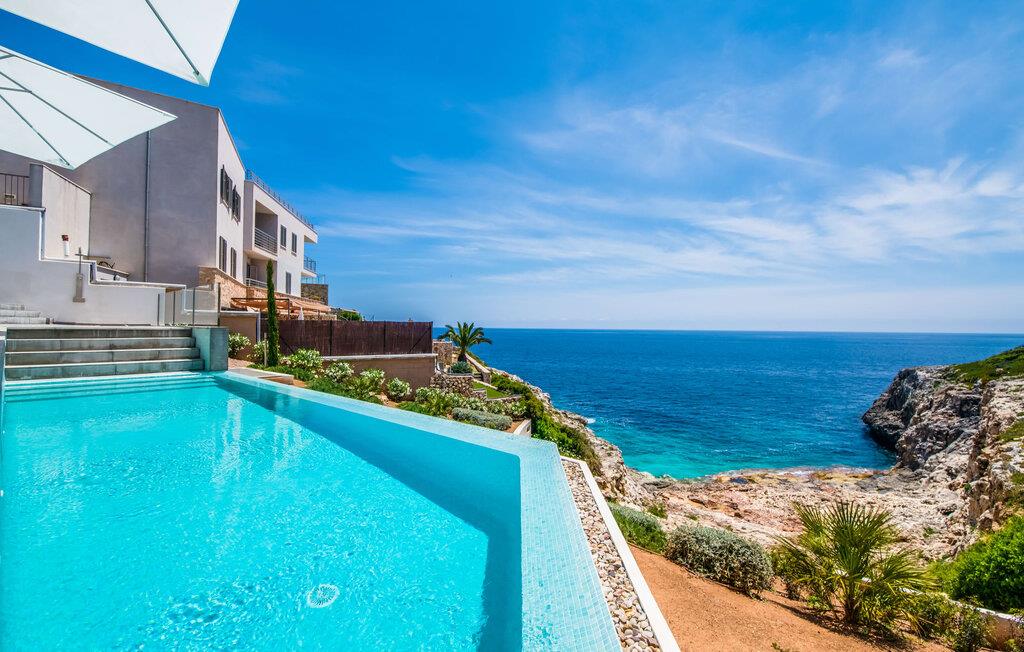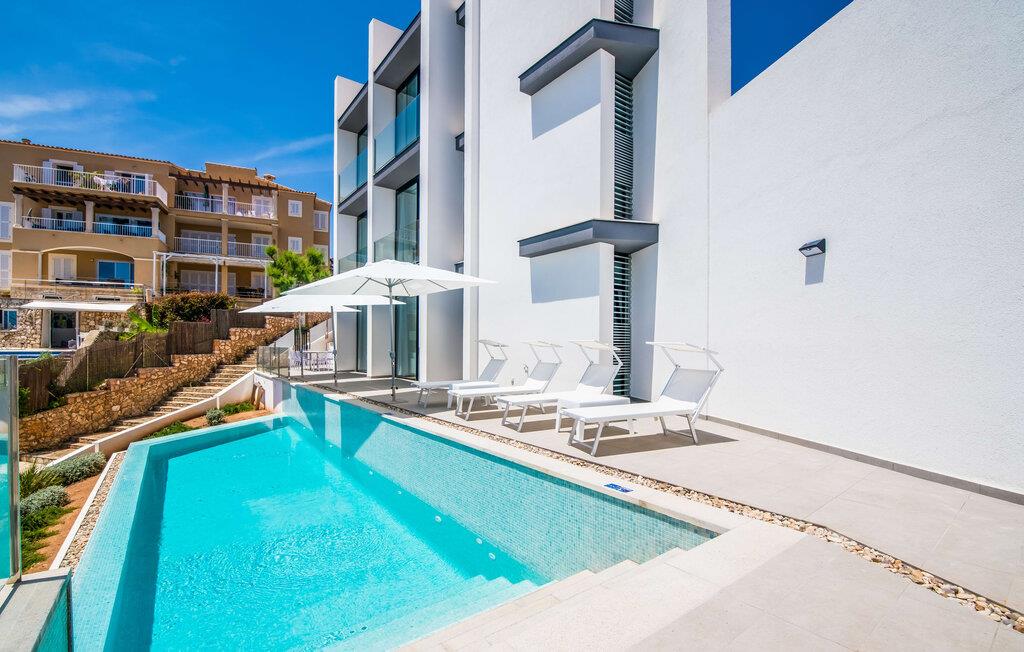 Sie haben sich schon lange auf Ihren Urlaub gefreut; Auf dem Flug nach Mallorca wuchs die Vorfreude noch mehr – und nachdem Sie den Trubel des Flughafens in Palma hinter sich gelassen haben, stehen Sie vor der Ozeanvilla: Rosmarin und Thymian zieren Palmen und Zypressen sowie eine Olive Baumbestandswache am Eingangsbereich. Was sich die Architekten hier in unmittelbarer Nähe (500 m) zu einer üppigen Meeresbucht ausgedacht und verwirklicht haben, wird Sie im Handumdrehen ins Schwärmen bringen: Das Anwesen schmiegt sich an den Hang und verfügt über einen der ozeanähnlichsten Infinity-Pools was die Gegend zu bieten hat: Von hier aus genießt man eine Aussicht, die allein schon belebt. Wenn Sie schwimmen, ein paar entspannte Bahnen ziehen und dabei die Aussicht genießen, durch das Wasser hindurch die türkisfarbenen Mosaikfliesen am Beckenboden bewundern und sich auf die Köstlichkeiten freuen, die Sie später beim Grillen erwarten, wird Ihr Entspannungsfaktor noch einmal steigen wesentlich. Oberhalb des Pools stehen Liegestühle zur Verfügung, die sich nach dem Schwimmen perfekt zum Sonnenbaden eignen.