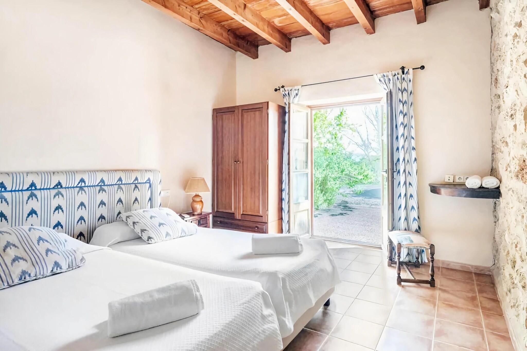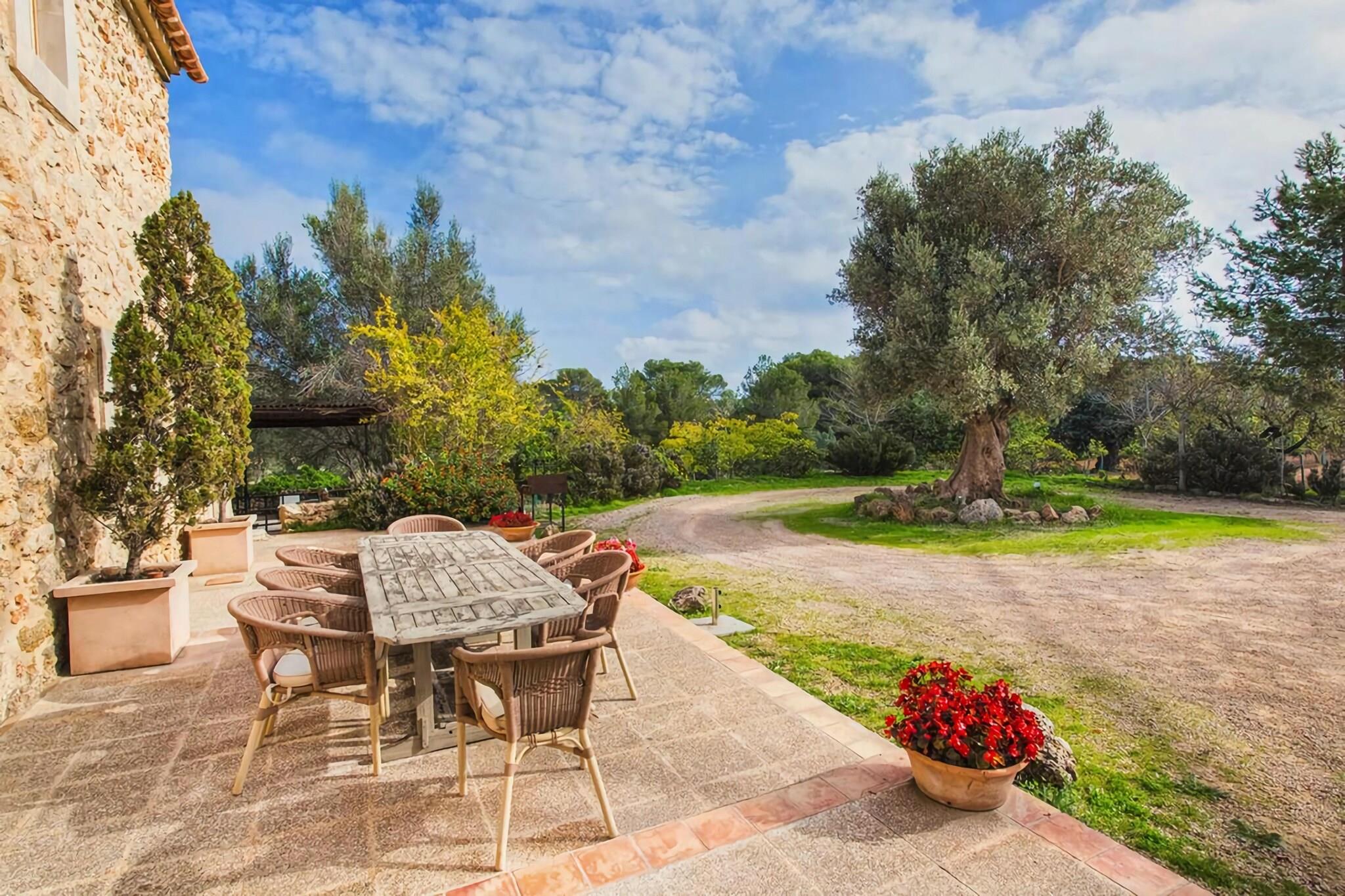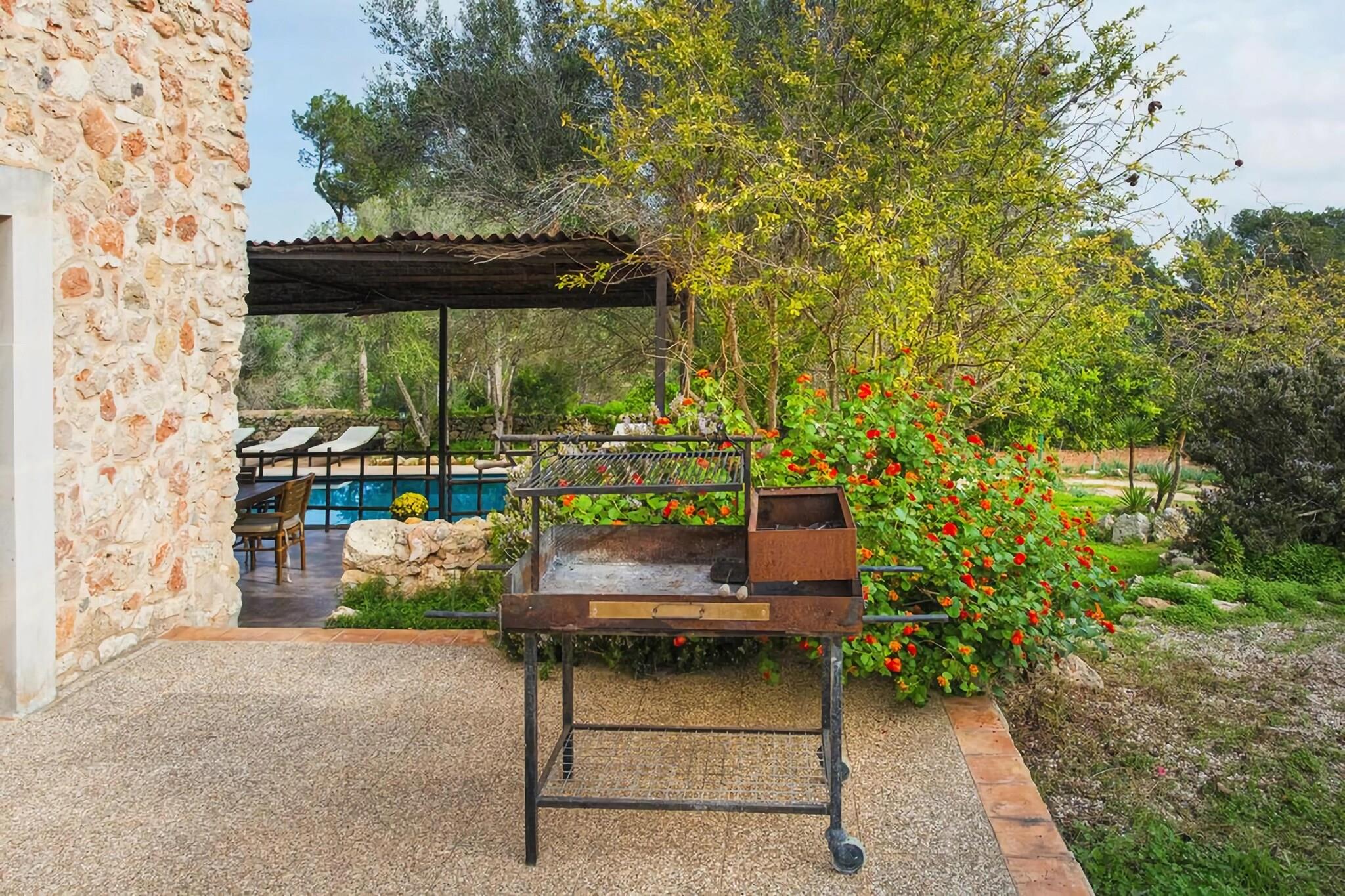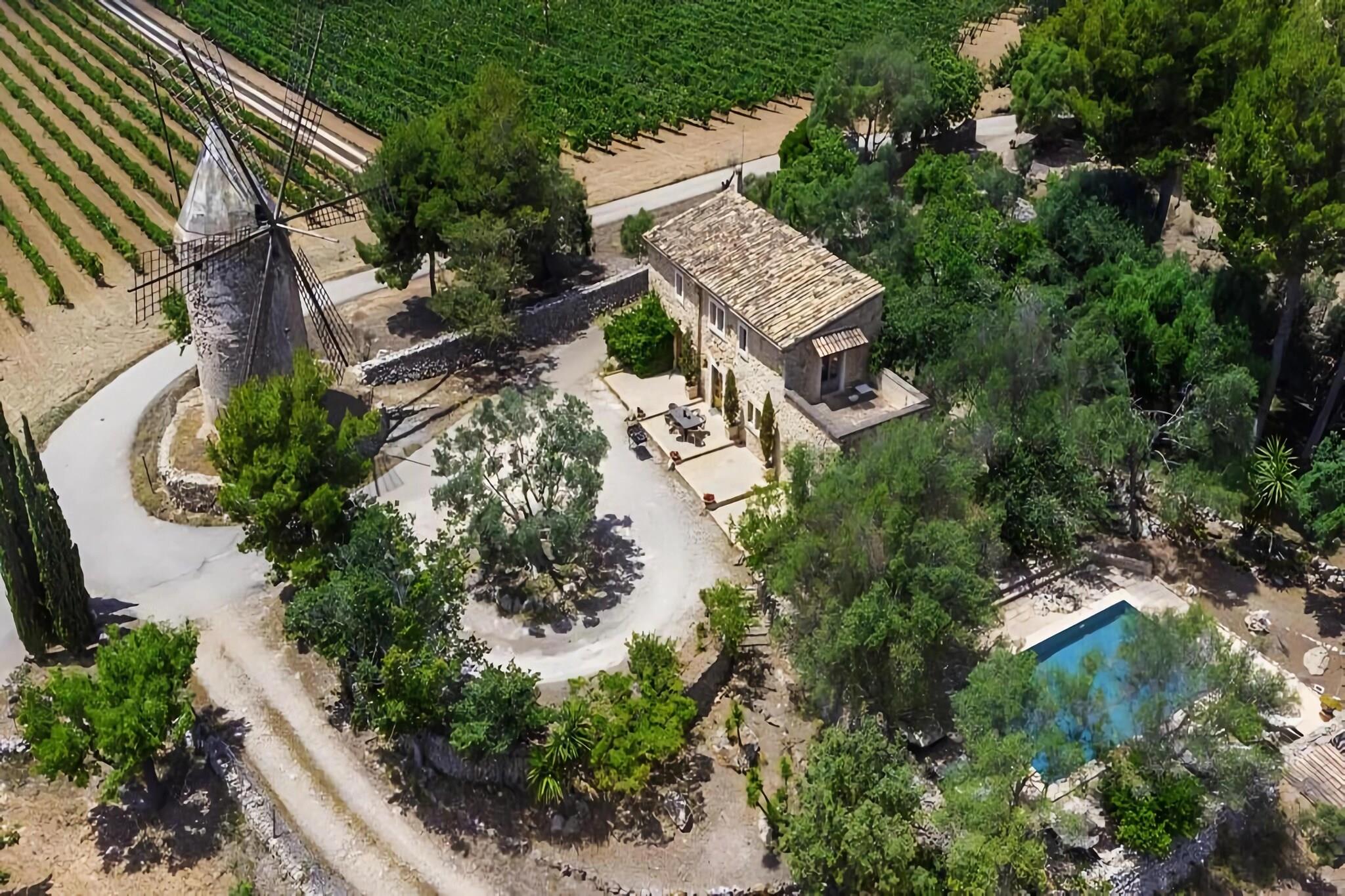 The property is wonderfully located in the middle of a Mallorcan winery on the outskirts of Santa María. The old restored mill in front of the farm is a real eye-catcher! The house itself offers around 250 m² of living space spread over two floors, a total of 4 double bedrooms (three with 2 single beds each and 1 with double bed), four bathrooms (all en suite), all bedrooms have their own air conditioning, living-dining room with satellite TV, WiFi and kitchenette with dishwasher. A guided tour and tasting during your vacation. The town of Santa María is located in the north of the capital Palma de Mallorca and has since become an ideal starting point for all directions of the island. There is a motorway connection nearby. The nearest supermarkets in Santa María or Marratxi are just a stone's throw away. Just a few minutes by car. For more extensive shopping, you can reach the capital Palma in just a few minutes (15 km). For those looking for special offers or just wanting to spend a fun afternoon with the family, we recommend the Mallorca Fashion Outlet shopping center, just 6 km away. By the way: this property can be combined. Perfect with another ranch (up to 8 additional guests) located on the same property, just a few minutes away. Hundreds of meters away. Ask us about this. From the living room you have access to the magical garden laid out like a small forest and therefore offers plenty of shade. Here you will also find the large private pool salt water and the covered terrace to sit right next to it. A dream place to quickly forget the stress of everyday life. There is a mobile barbecue and plenty of parking in the garden. The owner family produces their own wine on this huge 26 hectare estate so you can enjoy.