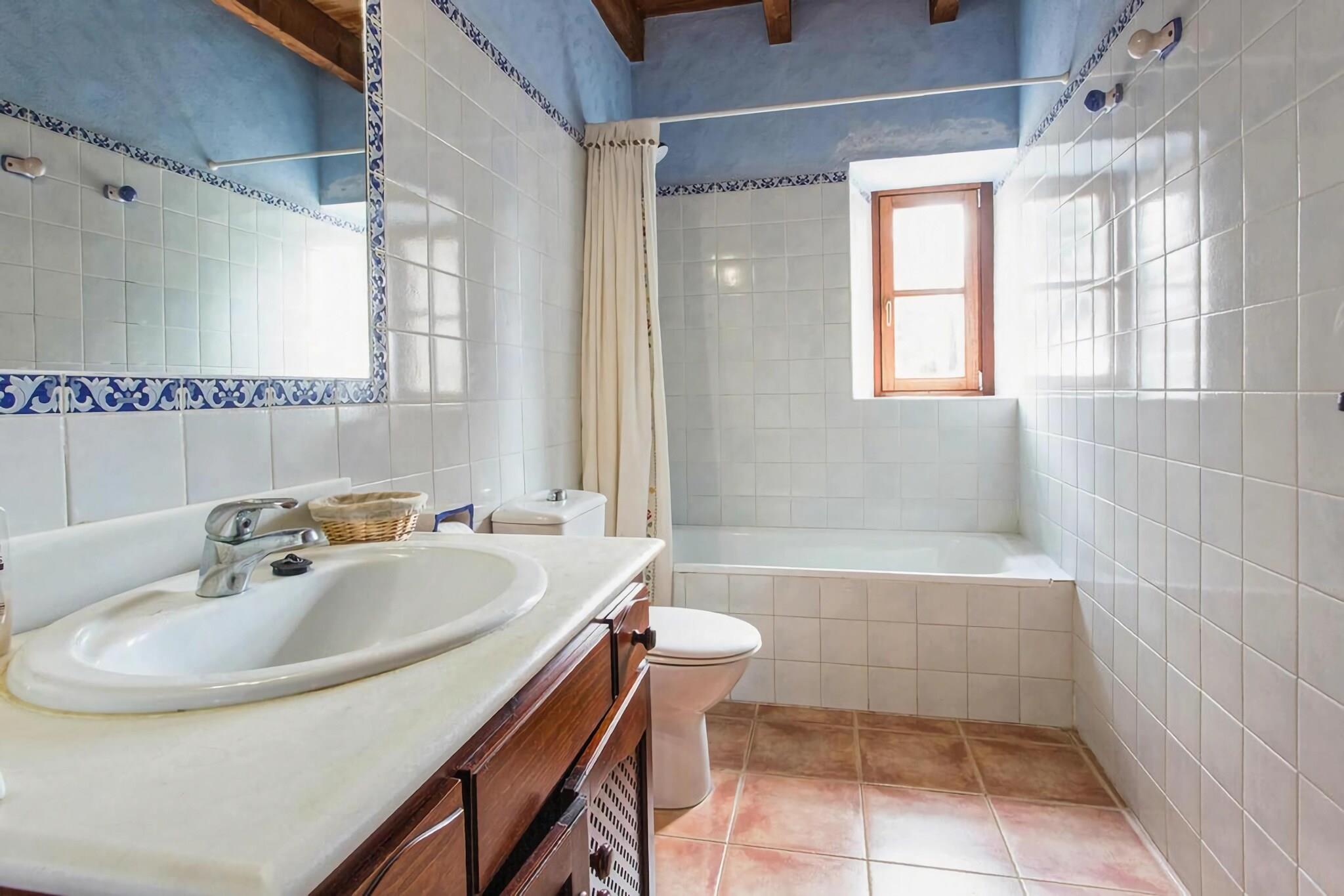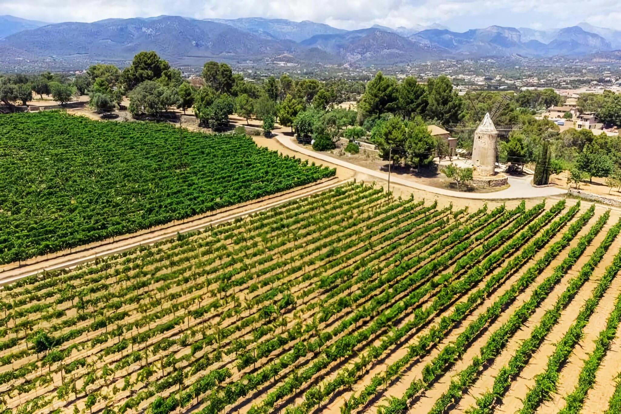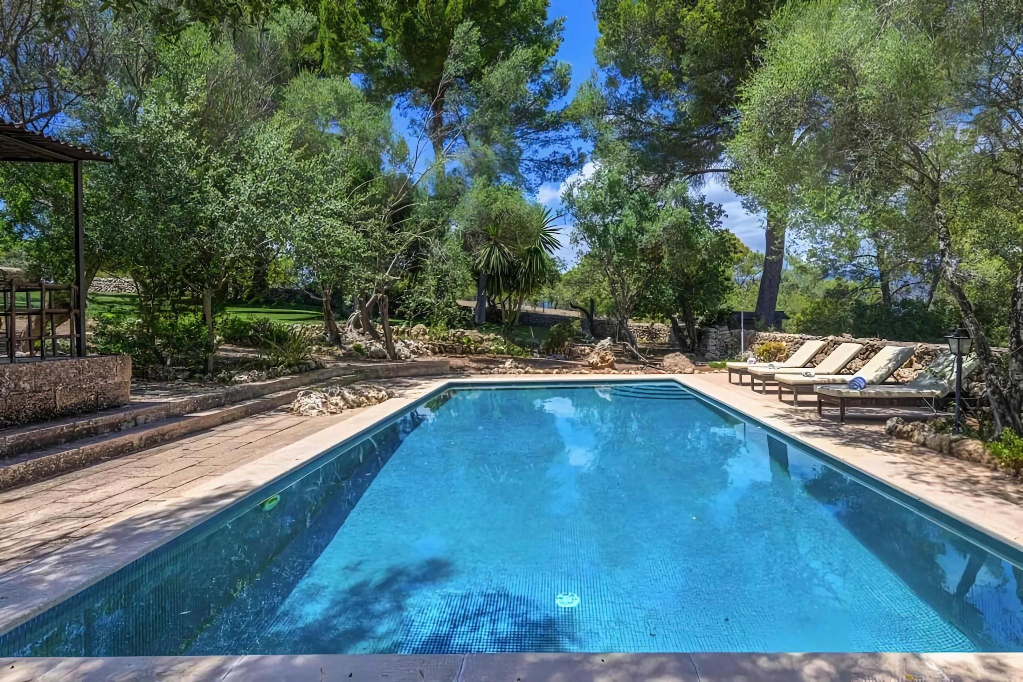 The property is wonderfully located in the middle of a Mallorcan winery on the outskirts of Santa María. The old restored mill in front of the farm is a real eye-catcher! The house itself offers around 250 m² of living space spread over two floors, a total of 4 double bedrooms (three with 2 single beds each and 1 with double bed), four bathrooms (all en suite), all bedrooms have their own air conditioning, living-dining room with satellite TV, WiFi and kitchenette with dishwasher. A guided tour and tasting during your vacation. The town of Santa María is located in the north of the capital Palma de Mallorca and has since become an ideal starting point for all directions of the island. There is a motorway connection nearby. The nearest supermarkets in Santa María or Marratxi are just a stone's throw away. Just a few minutes by car. For more extensive shopping, you can reach the capital Palma in just a few minutes (15 km). For those looking for special offers or just wanting to spend a fun afternoon with the family, we recommend the Mallorca Fashion Outlet shopping center, just 6 km away. By the way: this property can be combined. Perfect with another ranch (up to 8 additional guests) located on the same property, just a few minutes away. Hundreds of meters away. Ask us about this. From the living room you have access to the magical garden laid out like a small forest and therefore offers plenty of shade. Here you will also find the large private pool salt water and the covered terrace to sit right next to it. A dream place to quickly forget the stress of everyday life. There is a mobile barbecue and plenty of parking in the garden. The owner family produces their own wine on this huge 26 hectare estate so you can enjoy.