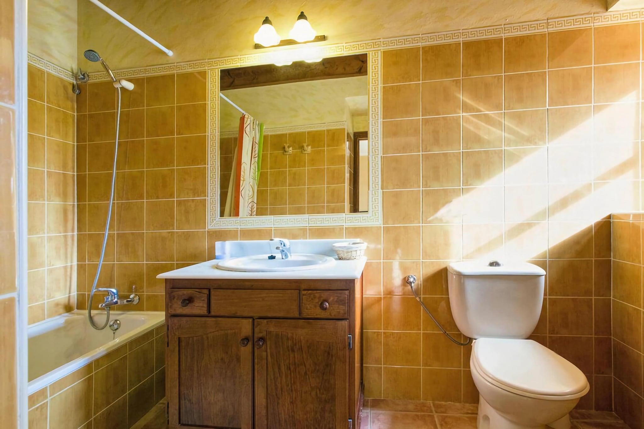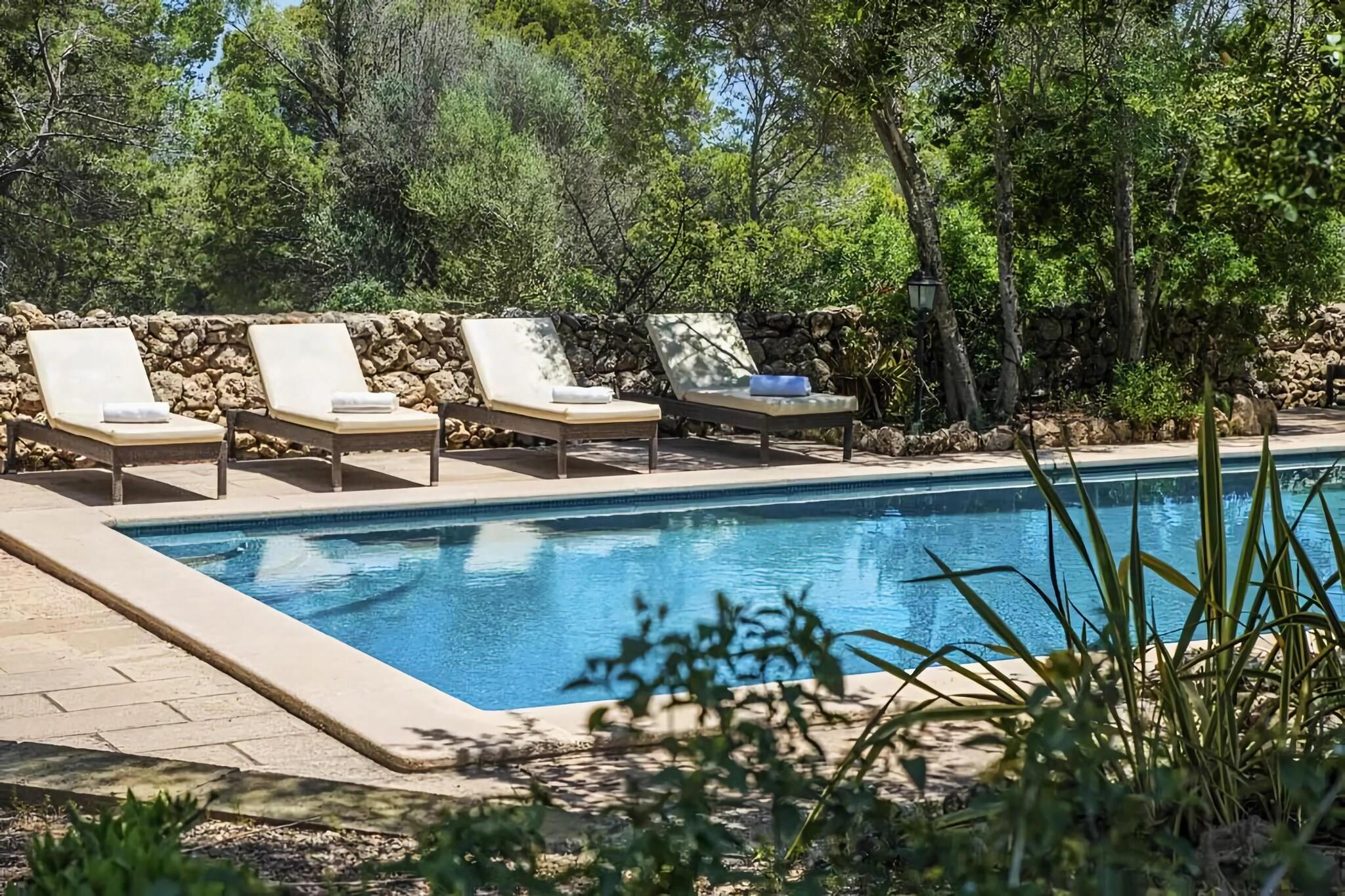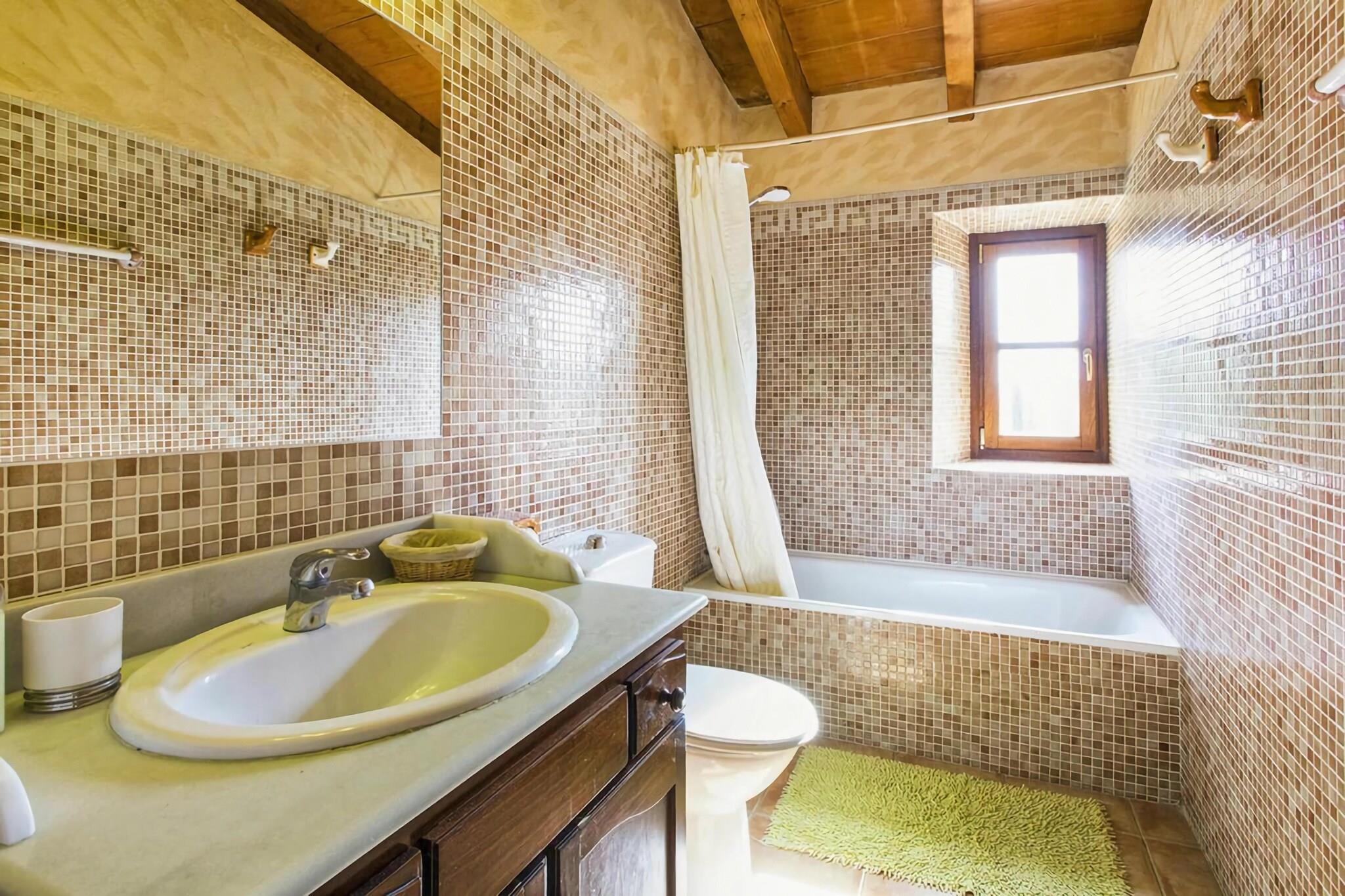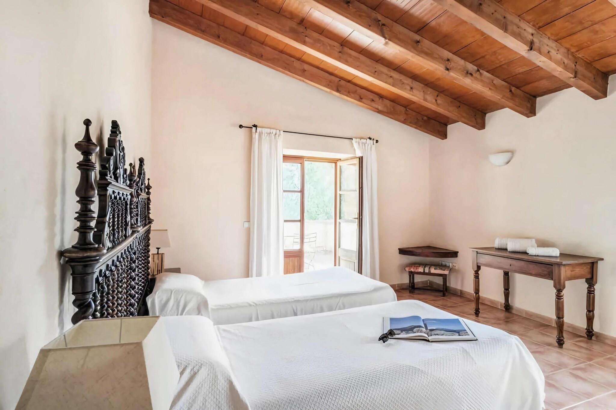The property is wonderfully located in the middle of a Mallorcan winery on the outskirts of Santa María. The old restored mill in front of the farm is a real eye-catcher! The house itself offers around 250 m² of living space spread over two floors, a total of 4 double bedrooms (three with 2 single beds each and 1 with double bed), four bathrooms (all en suite), all bedrooms have their own air conditioning, living-dining room with satellite TV, WiFi and kitchenette with dishwasher. A guided tour and tasting during your vacation. The town of Santa María is located in the north of the capital Palma de Mallorca and has since become an ideal starting point for all directions of the island. There is a motorway connection nearby. The nearest supermarkets in Santa María or Marratxi are just a stone's throw away. Just a few minutes by car. For more extensive shopping, you can reach the capital Palma in just a few minutes (15 km). For those looking for special offers or just wanting to spend a fun afternoon with the family, we recommend the Mallorca Fashion Outlet shopping center, just 6 km away. By the way: this property can be combined. Perfect with another ranch (up to 8 additional guests) located on the same property, just a few minutes away. Hundreds of meters away. Ask us about this. From the living room you have access to the magical garden laid out like a small forest and therefore offers plenty of shade. Here you will also find the large private pool salt water and the covered terrace to sit right next to it. A dream place to quickly forget the stress of everyday life. There is a mobile barbecue and plenty of parking in the garden. The owner family produces their own wine on this huge 26 hectare estate so you can enjoy.