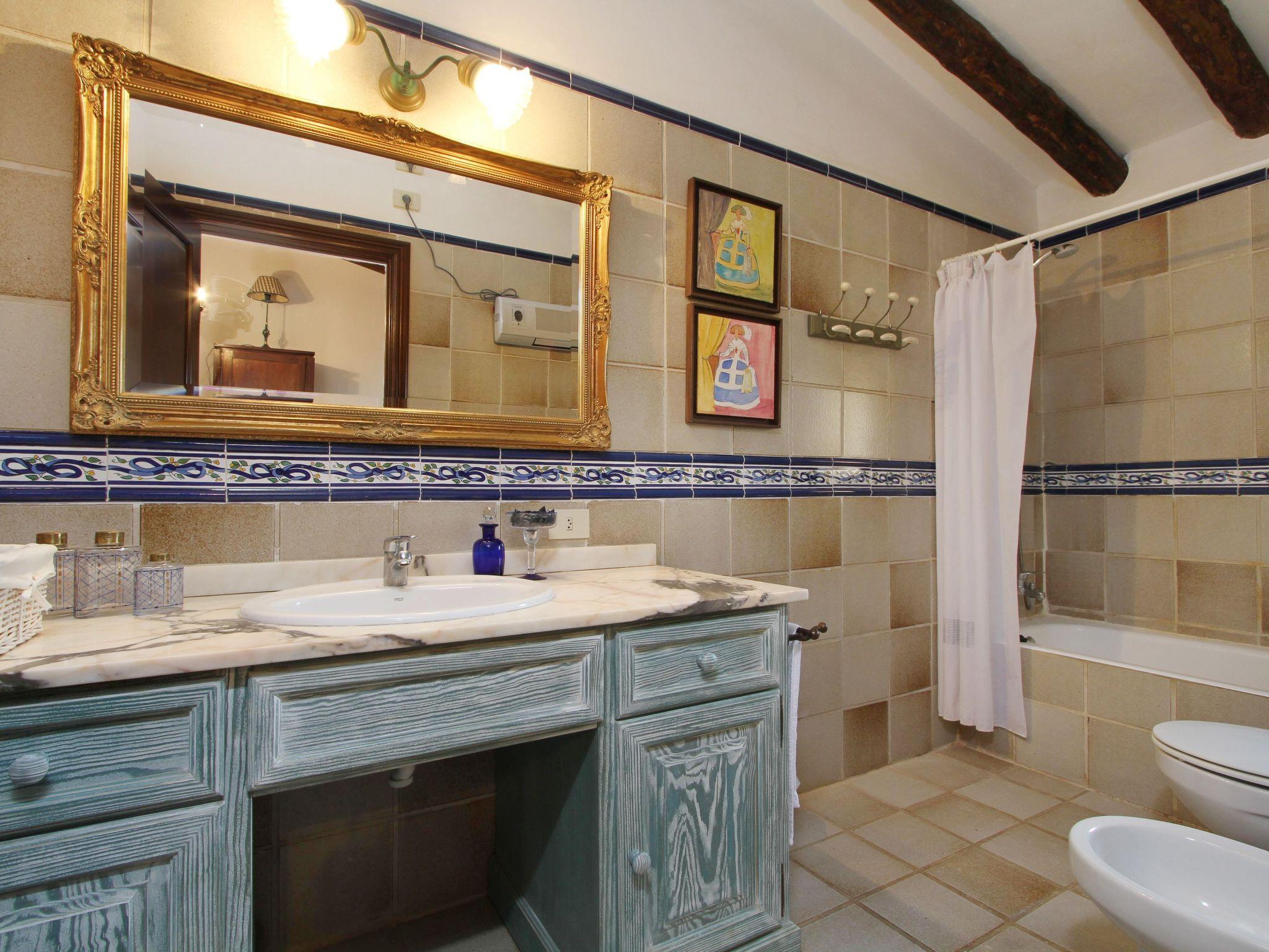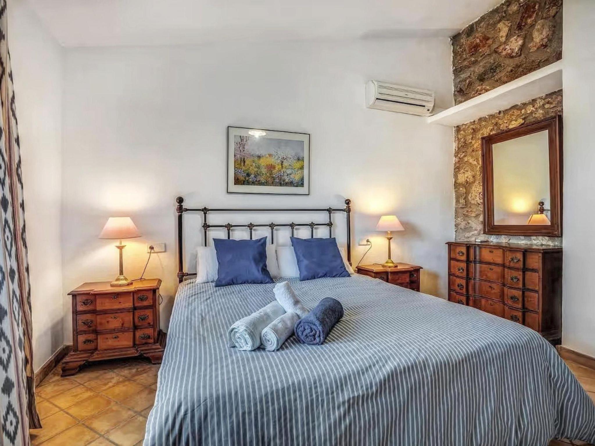The house, which can accommodate 8 persons, offers approximately 280 m² of living space on two floors, a living-dining room, a fully equipped kitchen with dishwasher, four spacious bedrooms ( 2x double bed, 2x single bed ) and a total of three bathrooms ( 1x ensuite bathroom ). Two bedrooms are on the upper floor. All bedrooms and the living room have their own air conditioning. Next to the pool there is also a covered terrace equipped with barbecue, sofas and dining table.