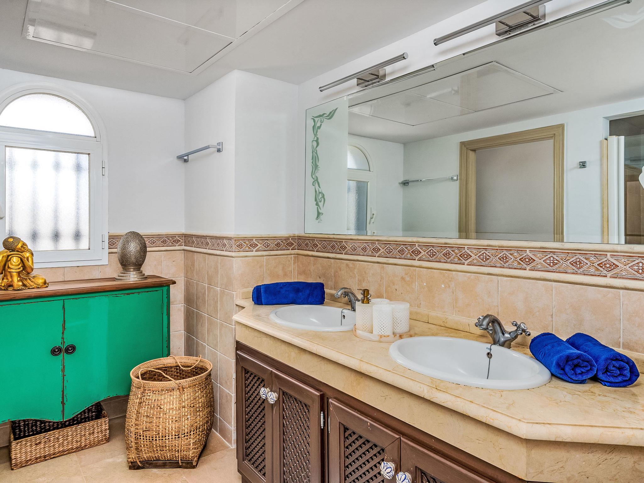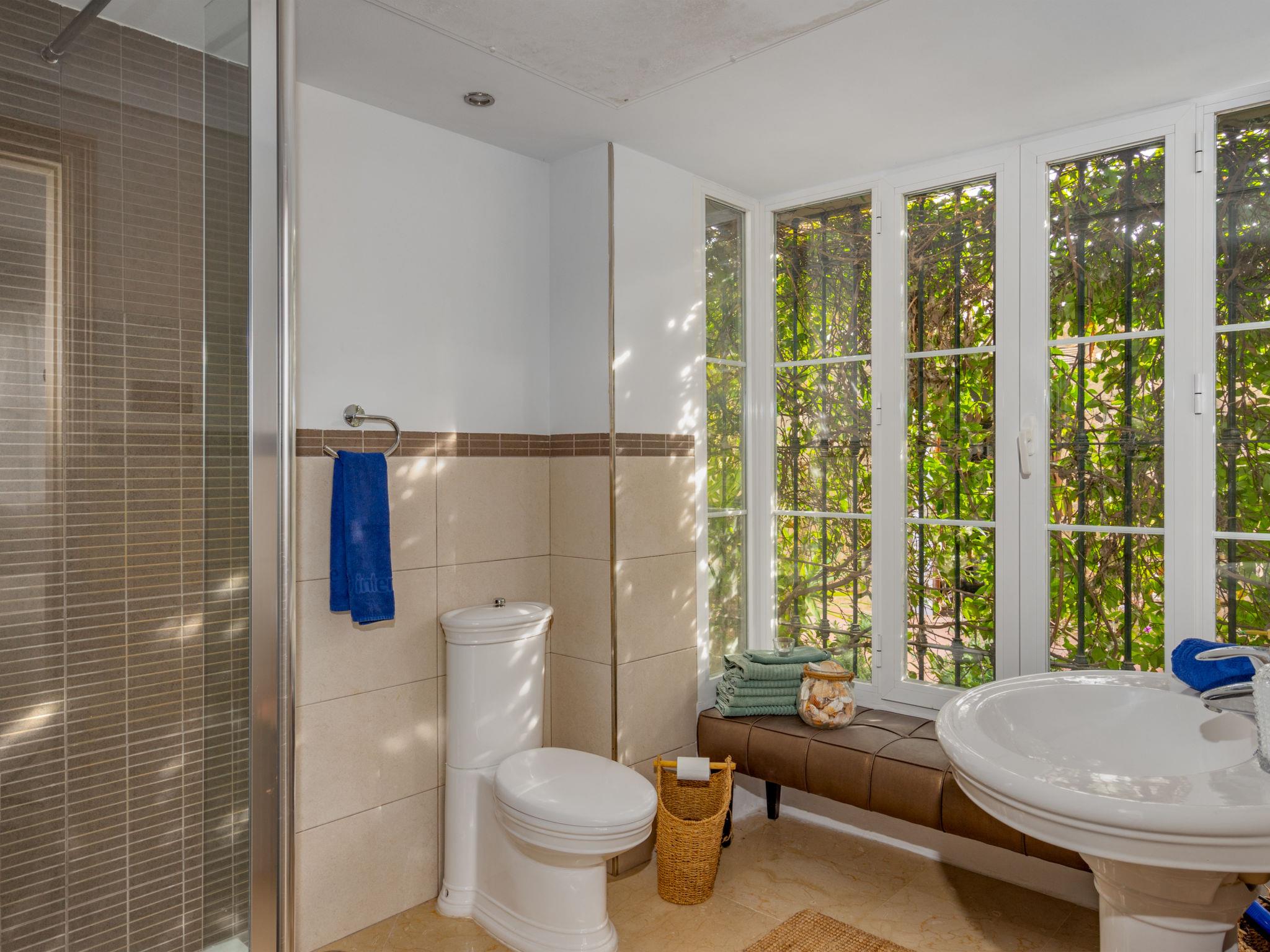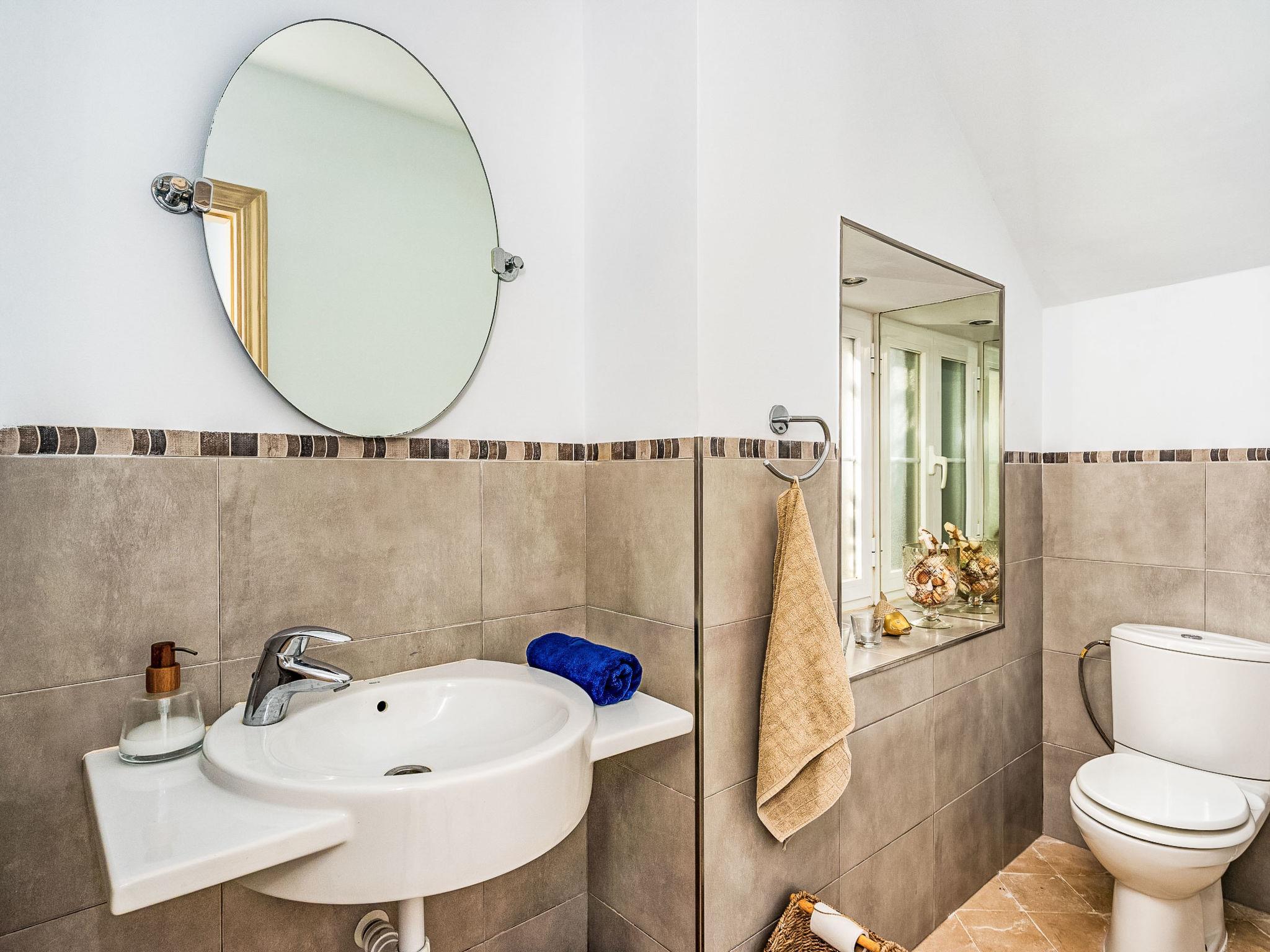 "Villa Sara", 5-room villa 216 m2 on 2 levels. Practical furnishings: living/dining room with open-hearth fireplace, digital TV and international TV channels. Exit to the patio. 1 room with 1 french bed (160 cm, length 200 cm), bath/WC and double hand-basin. Exit to the terrace. 1 room with 2 beds (90 cm, length 200 cm), shower/WC. Exit to the terrace. 1 room with 1 french bed (160 cm, length 200 cm), shower/WC. Open kitchen (oven, dishwasher, 5 gas rings, toaster, kettle, microwave, freezer, electric coffee machine, Capsules for coffee machine (Nespresso) extra) with dining table. Exit to the terrace. Sep. WC. Air-conditioning, forced-air heating. Upper floor: 1 room with 1 french bed (160 cm, length 200 cm), shower/WC, double hand-basin and forced-air heating. Exit to the terrace. Large terrace, patio. Terrace furniture, barbecue, deck chairs (2). View of the sea, the swimming pool and the garden. Facilities: washing machine, iron, children's high chair, baby cot, hair dryer. Internet (WiFi, free). Please note: non-smoking house. Fire extinguisher. VUT/MA/91576 // Reg. Nr.: ESFCTU0000290400002609480000000000000000VUT/MA/915767