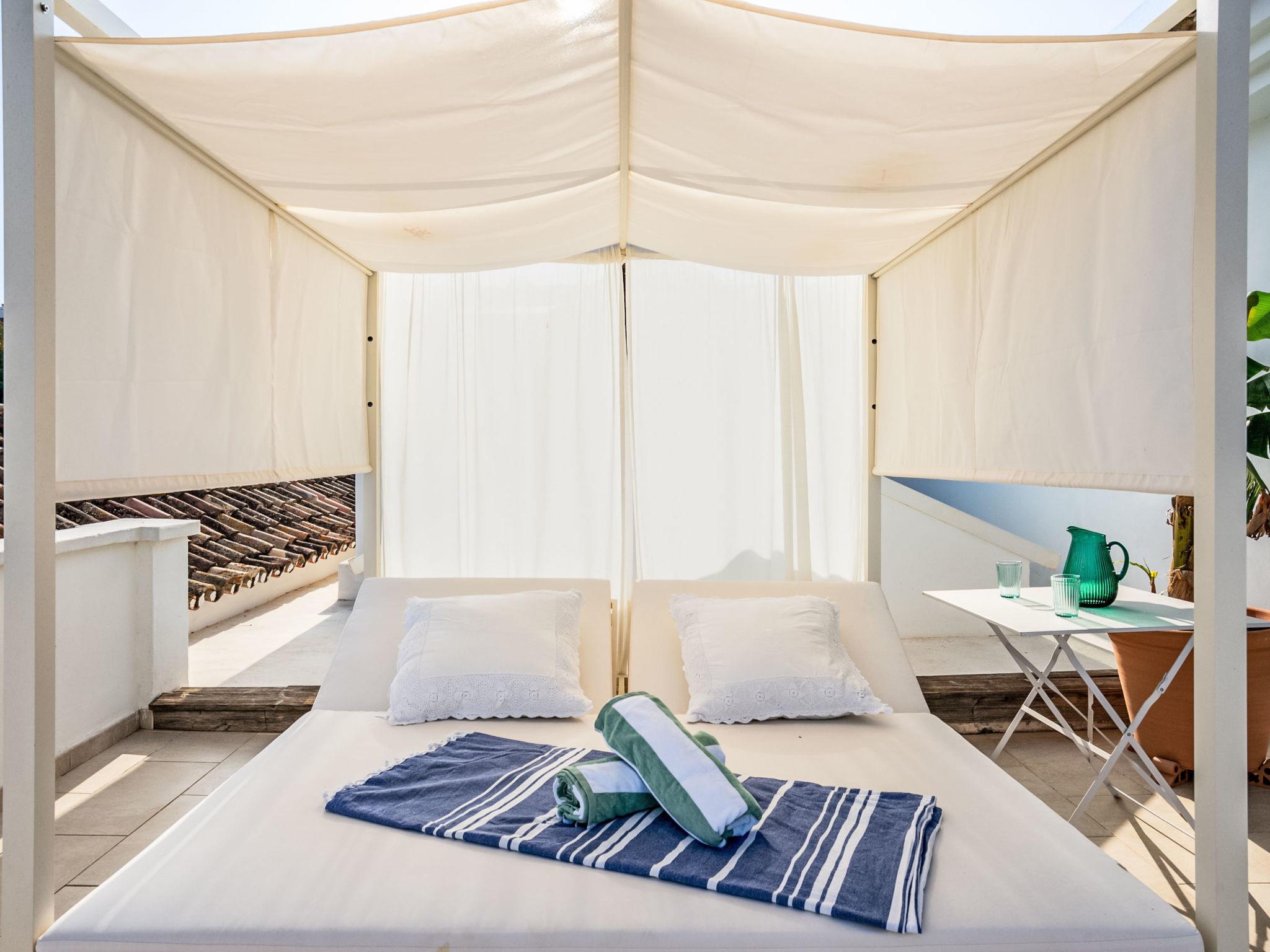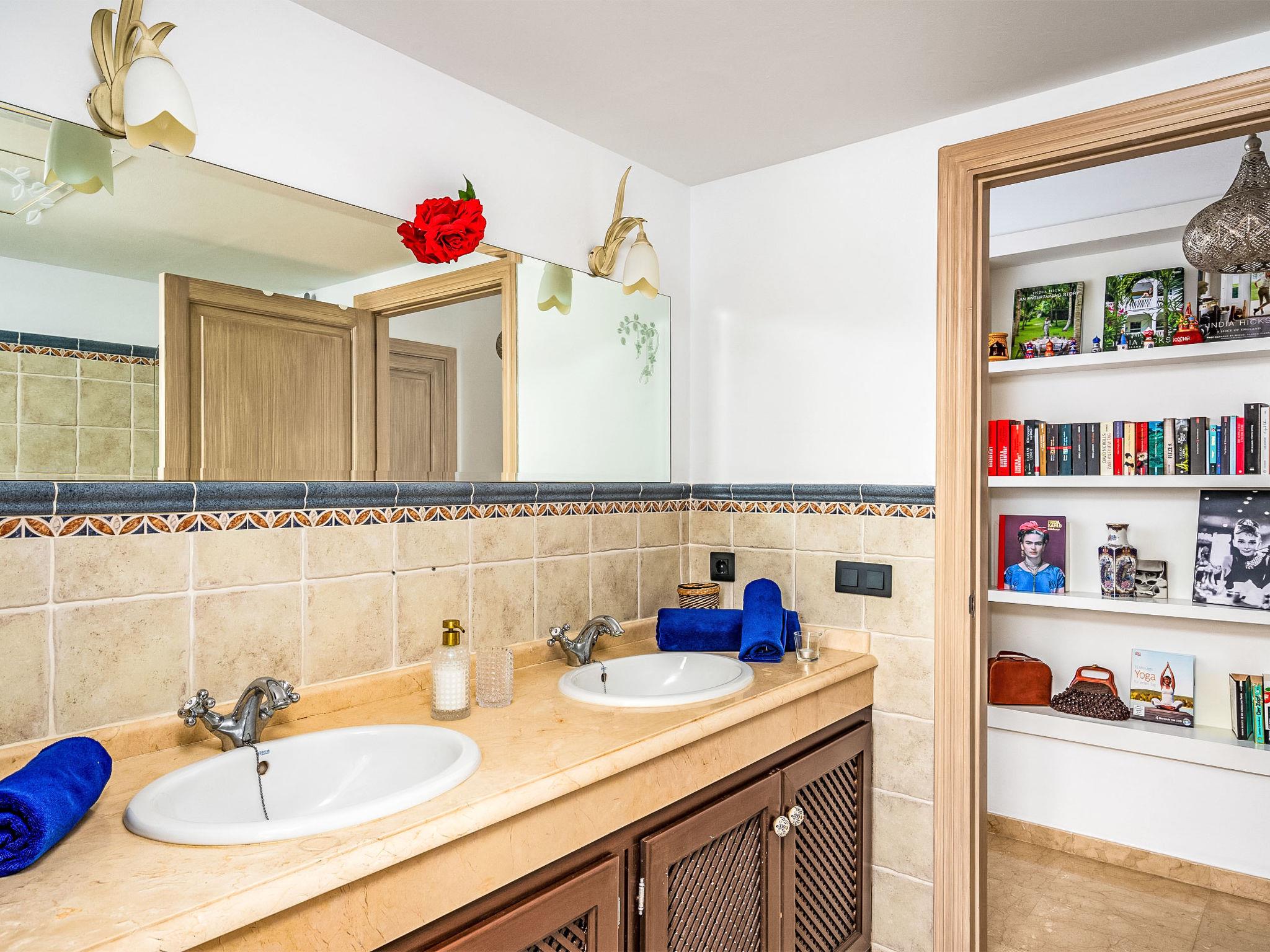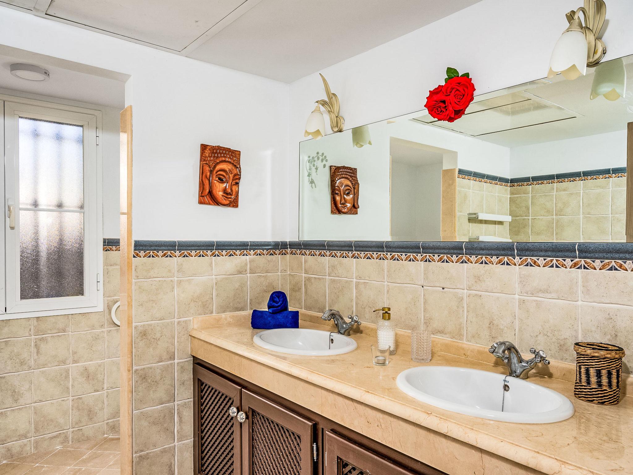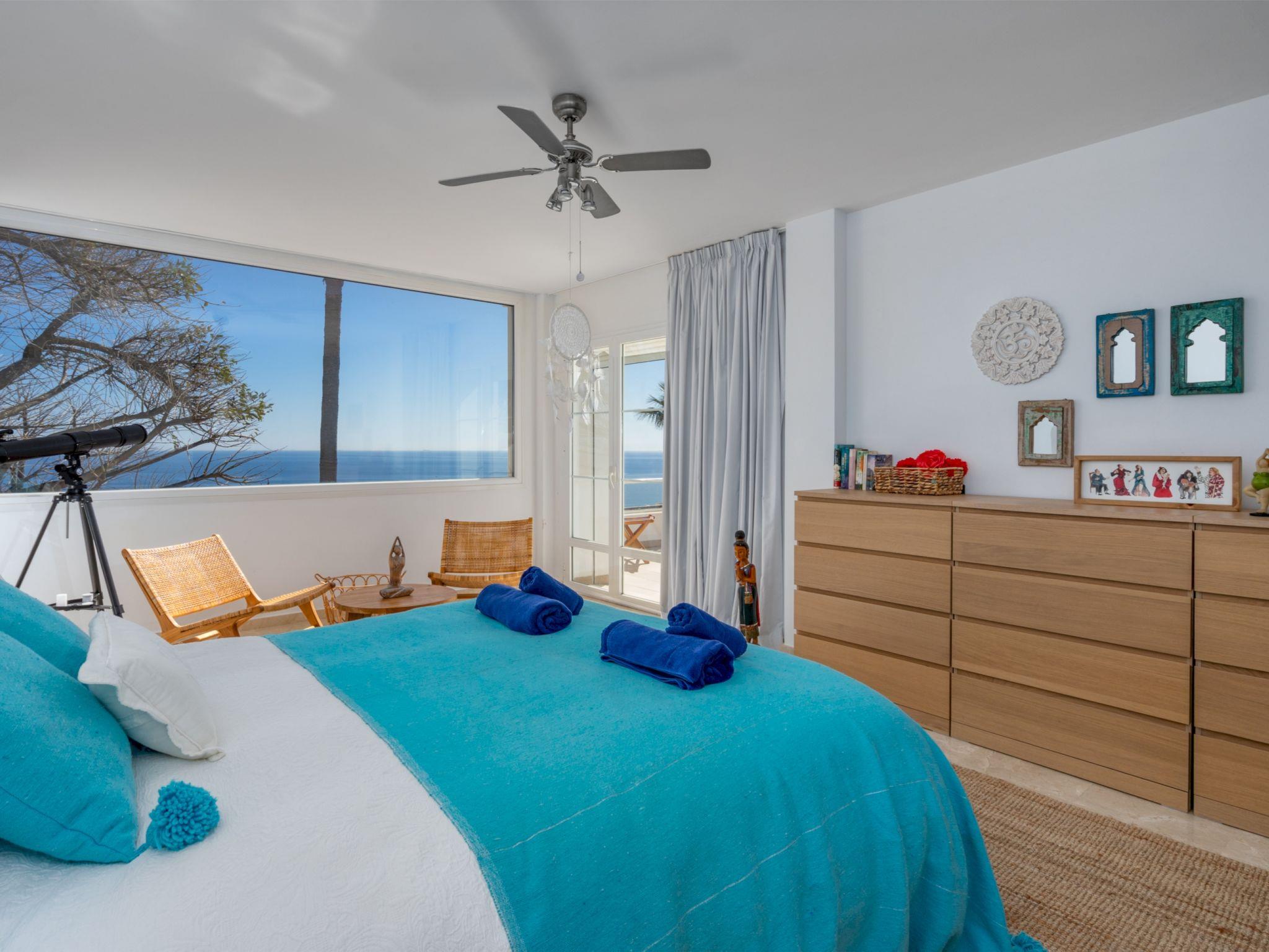 "Villa Sara", 5-room villa 216 m2 on 2 levels. Practical furnishings: living/dining room with open-hearth fireplace, digital TV and international TV channels. Exit to the patio. 1 room with 1 french bed (160 cm, length 200 cm), bath/WC and double hand-basin. Exit to the terrace. 1 room with 2 beds (90 cm, length 200 cm), shower/WC. Exit to the terrace. 1 room with 1 french bed (160 cm, length 200 cm), shower/WC. Open kitchen (oven, dishwasher, 5 gas rings, toaster, kettle, microwave, freezer, electric coffee machine, Capsules for coffee machine (Nespresso) extra) with dining table. Exit to the terrace. Sep. WC. Air-conditioning, forced-air heating. Upper floor: 1 room with 1 french bed (160 cm, length 200 cm), shower/WC, double hand-basin and forced-air heating. Exit to the terrace. Large terrace, patio. Terrace furniture, barbecue, deck chairs (2). View of the sea, the swimming pool and the garden. Facilities: washing machine, iron, children's high chair, baby cot, hair dryer. Internet (WiFi, free). Please note: non-smoking house. Fire extinguisher. VUT/MA/91576 // Reg. Nr.: ESFCTU0000290400002609480000000000000000VUT/MA/915767