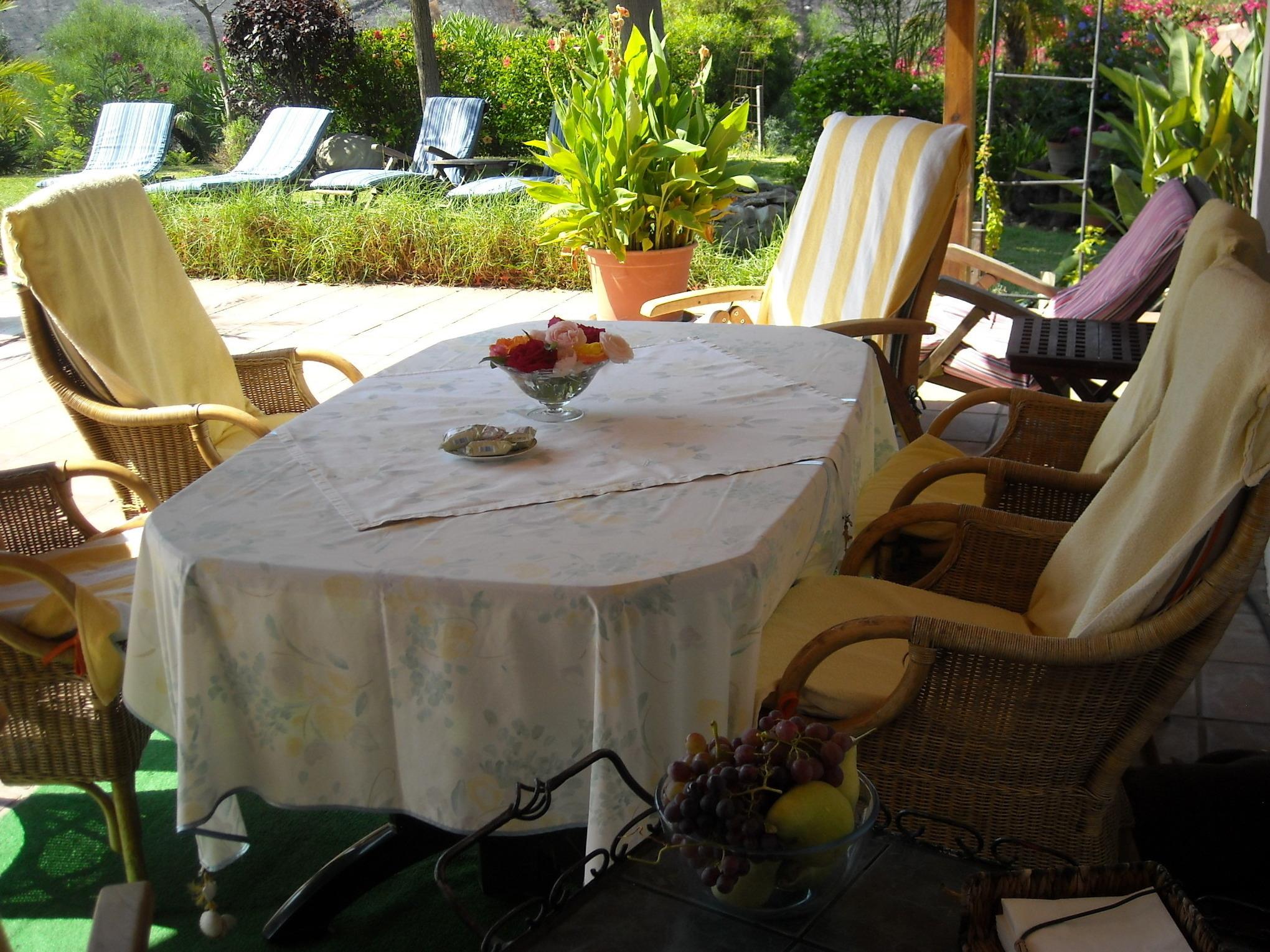 Die Poolterrasse hat einen direkten Zugang zur Küche und einen überdachten Essbereich, zusätzlich gibt es noch eine überdachte Terrasse zur Westseite und eine Teilweise Sonnengeschützte Sitzgelegenheit nach Südosten.