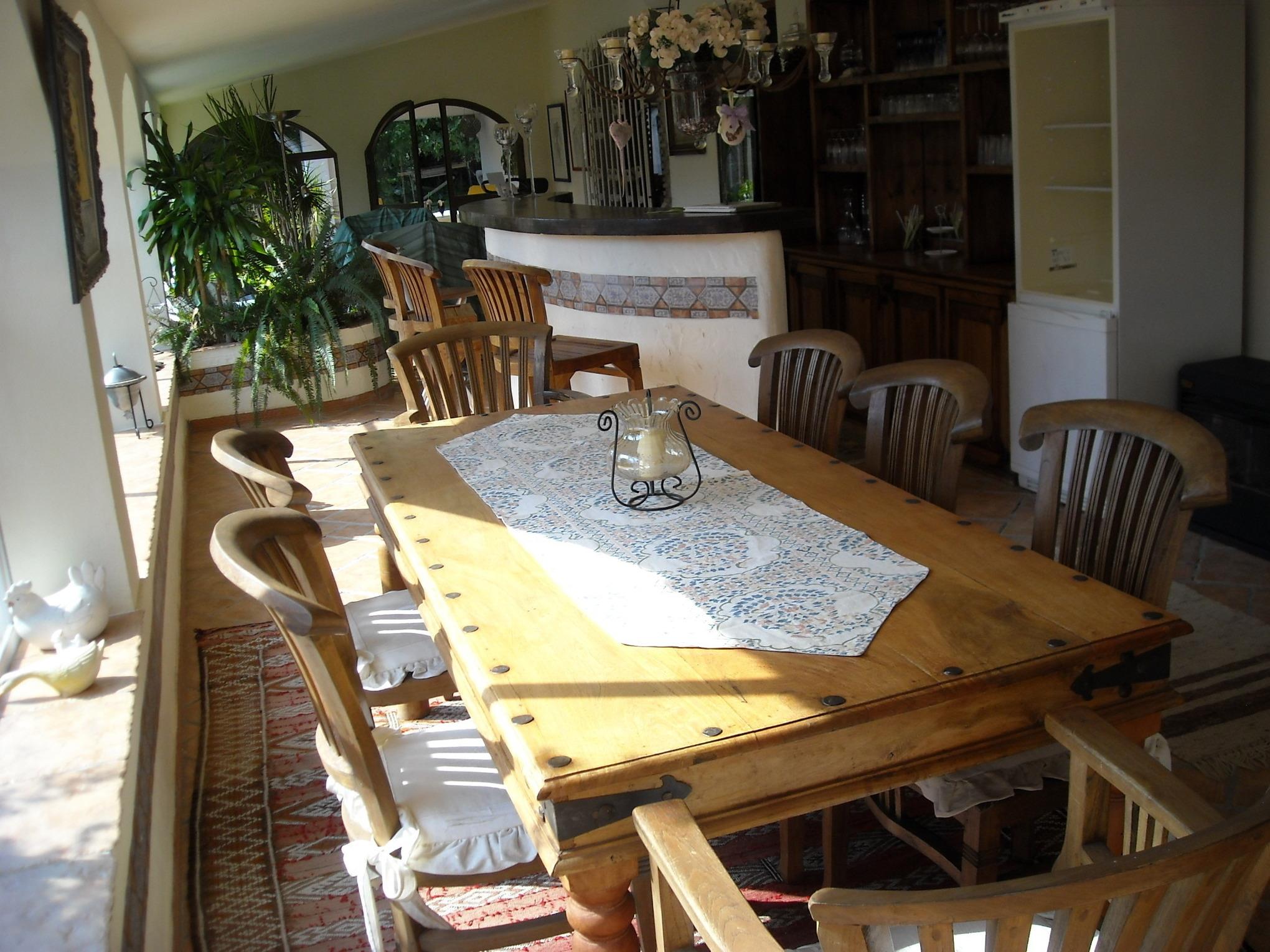 Die Finca hat ca. 150 m² und liegt auf einer Ebene mit jeweils einer Stufe zum Wintergarten und von der Küche zur Poolterasse: einen Wintergarten mit Bar, Getränkekühlschrank, Sitzecke und Essbereich, mit direkter Verbindung zu Wohnzimmer und Küche.