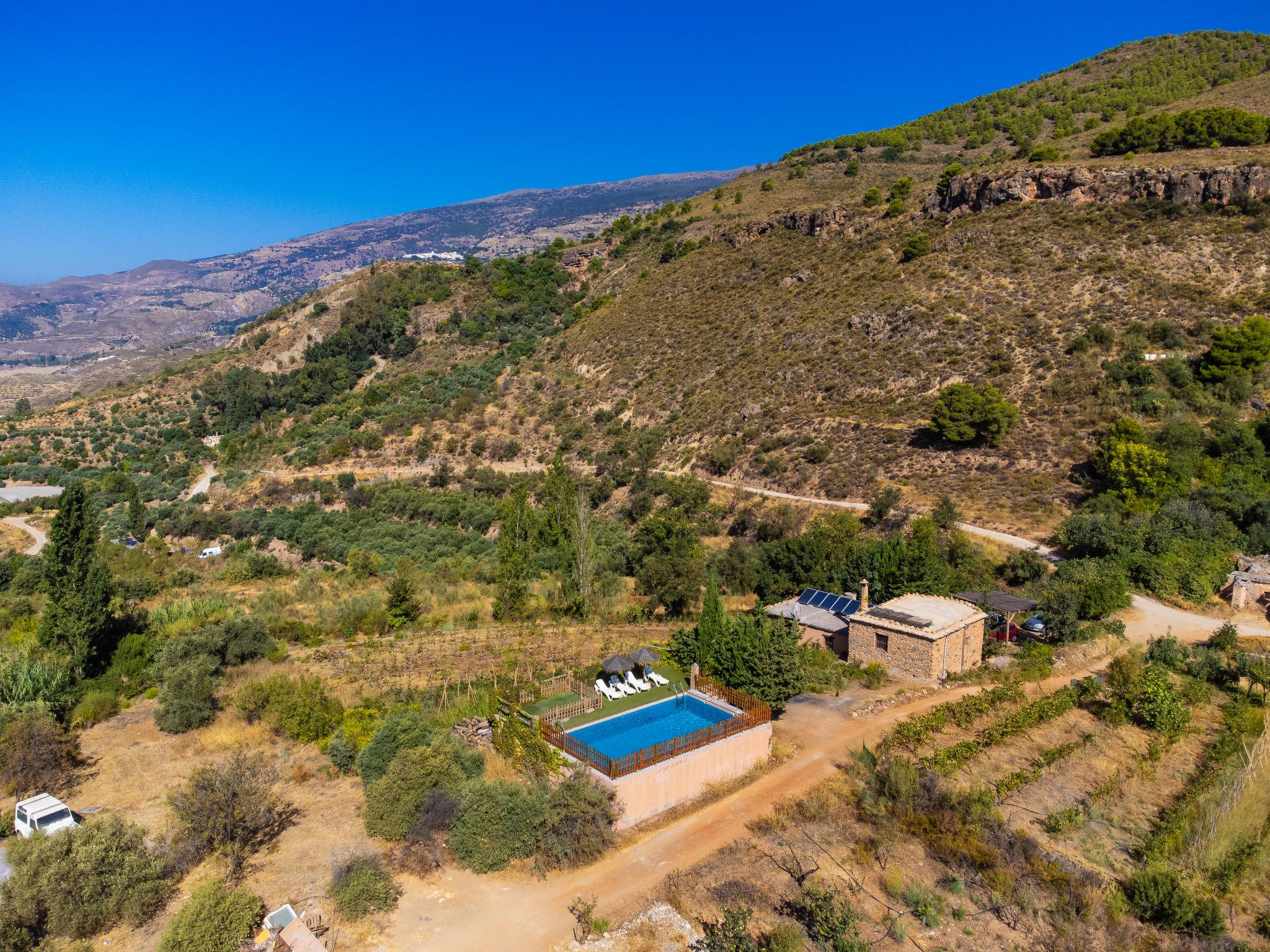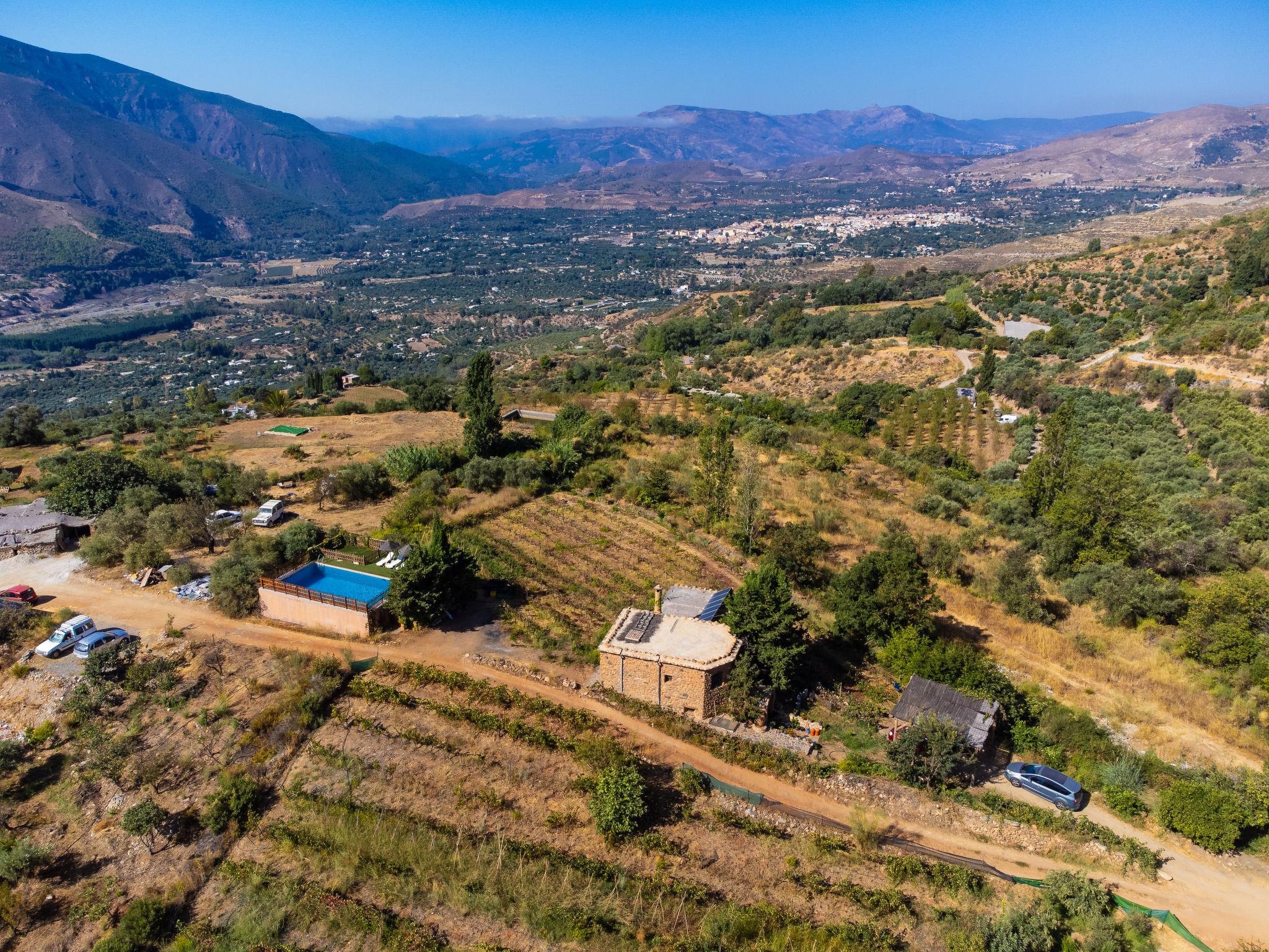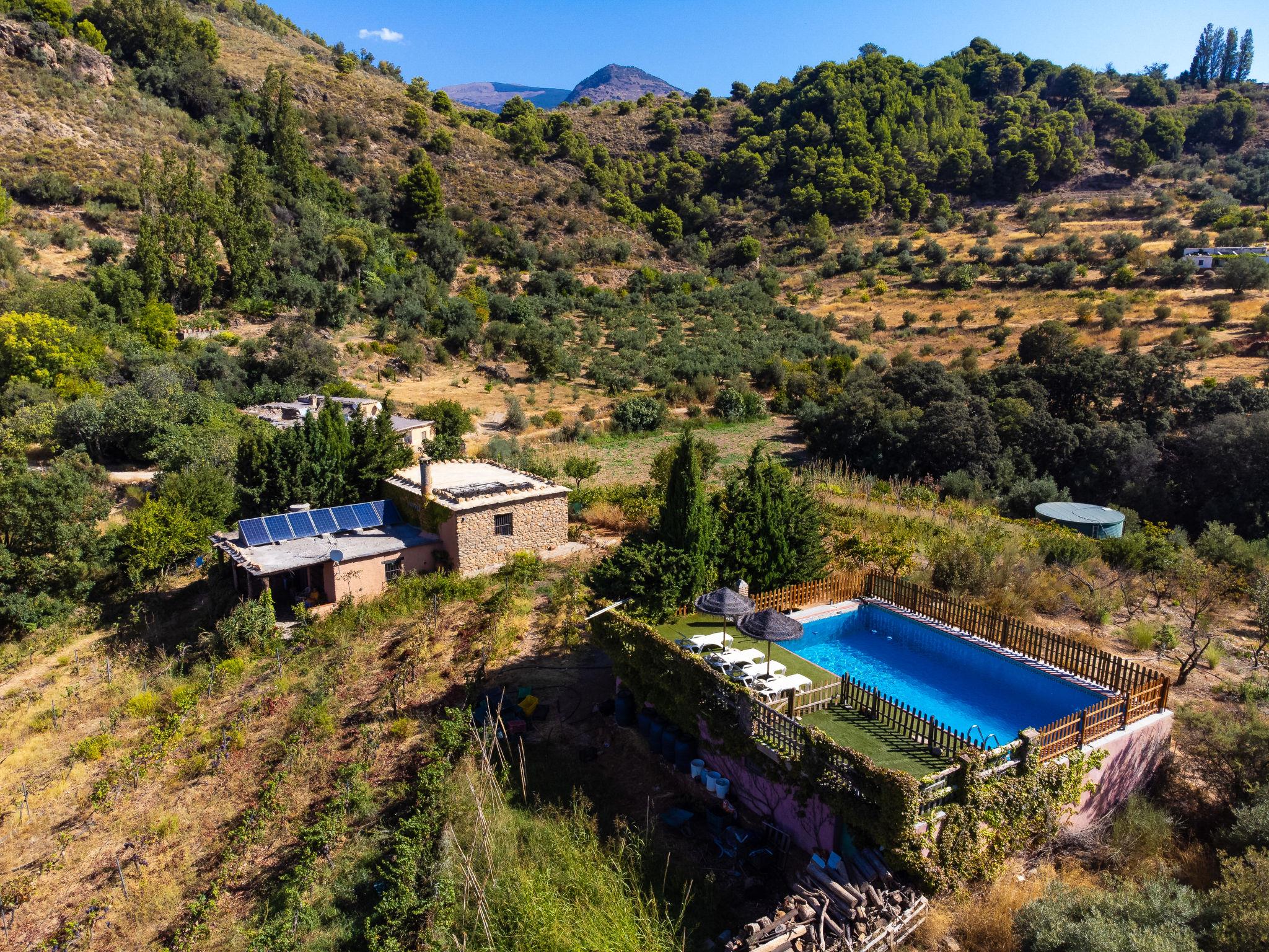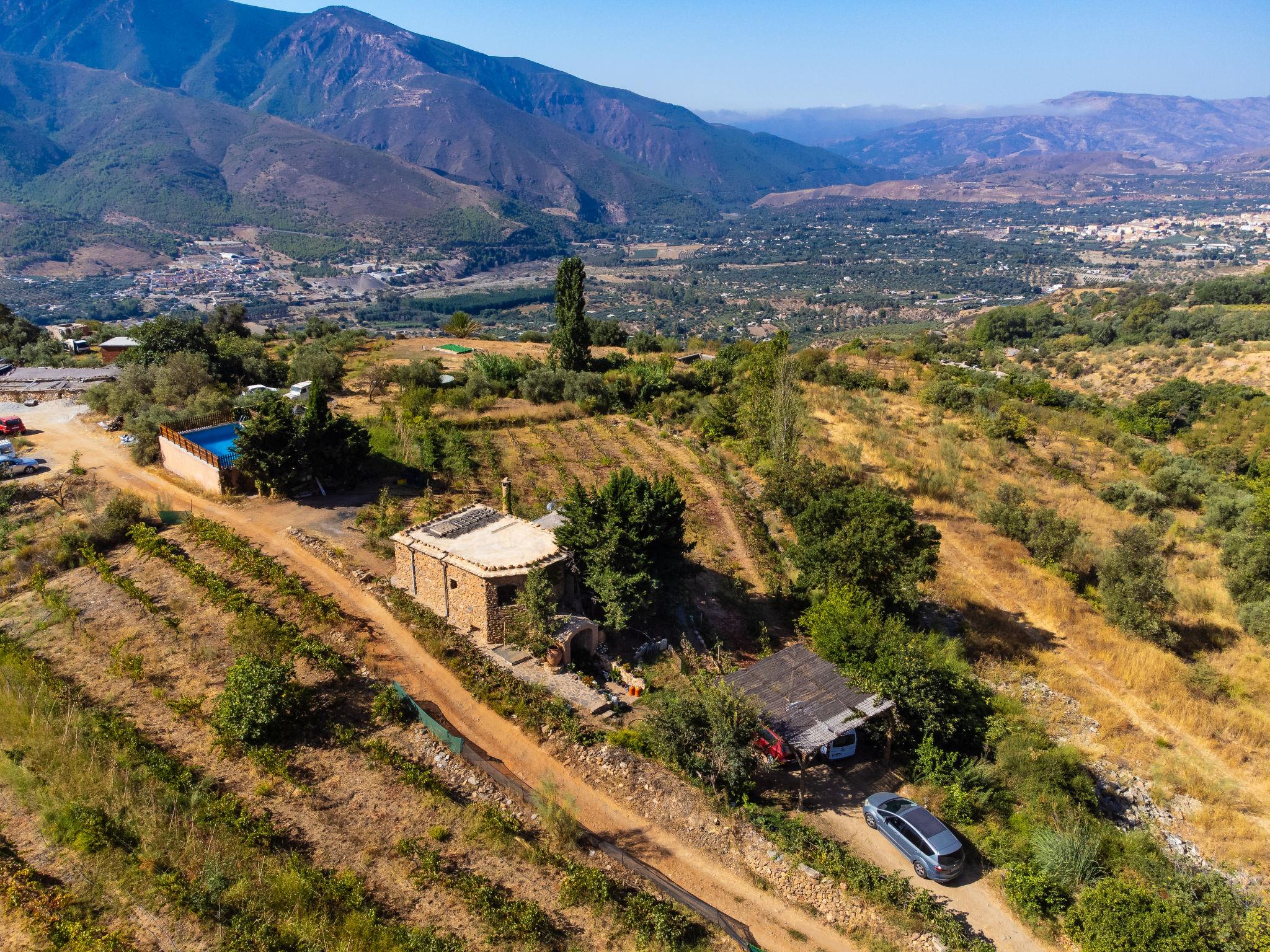Orgiva: Cosy, simple, comfortable house "Cortijo el Cerrillo", built in 1998, renovated in 2018, surrounded by vineyards. In a secluded, quiet position, in the countryside. Private: natural state property 5'000 m2, swimming pool (11 x 5 m, depth 225 cm, seasonal availability: 01.Apr. - 01.Oct.). Paddling pool. Bumpy, steep motor access (300 m via unmade road). Parking at the house. Grocery 5 km, supermarket 5 km, restaurant 5 km, bus stop 5 km. Nearby attractions: Parque Natural Sierra Nevada Cara Sur 200 m, Aeropuerto Granada 70 km, Granada 58 km, Costa Tropical 30 km. Please note: car recommended. Suitable for families. The owner has a dog.