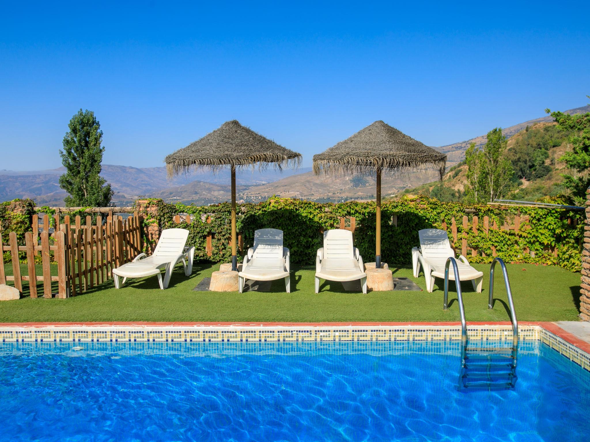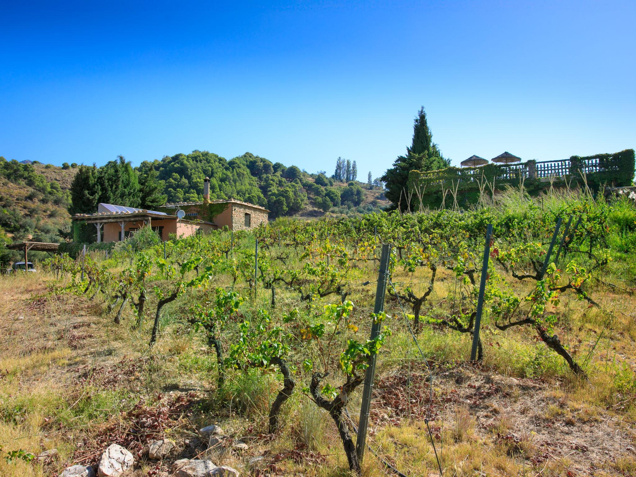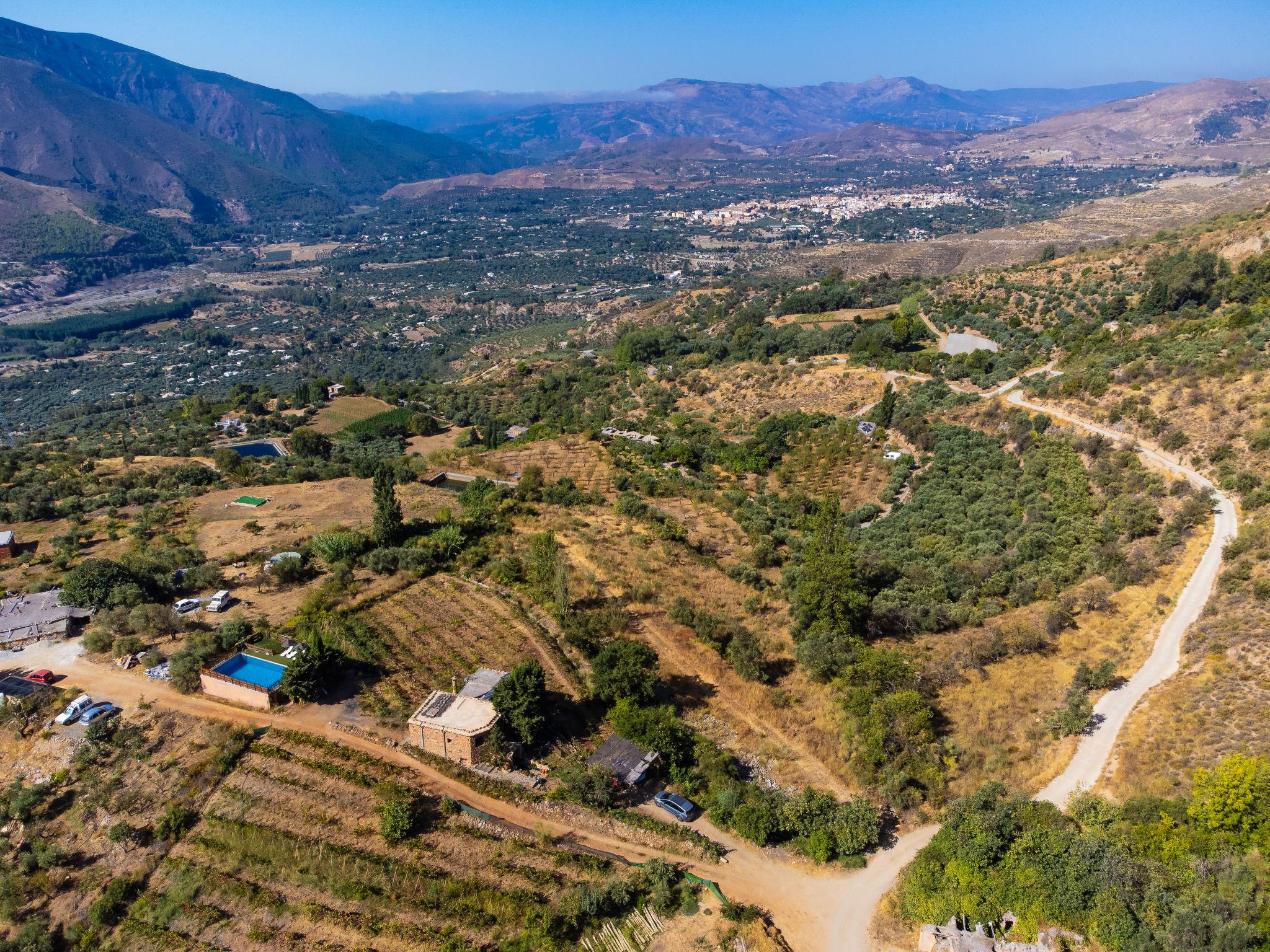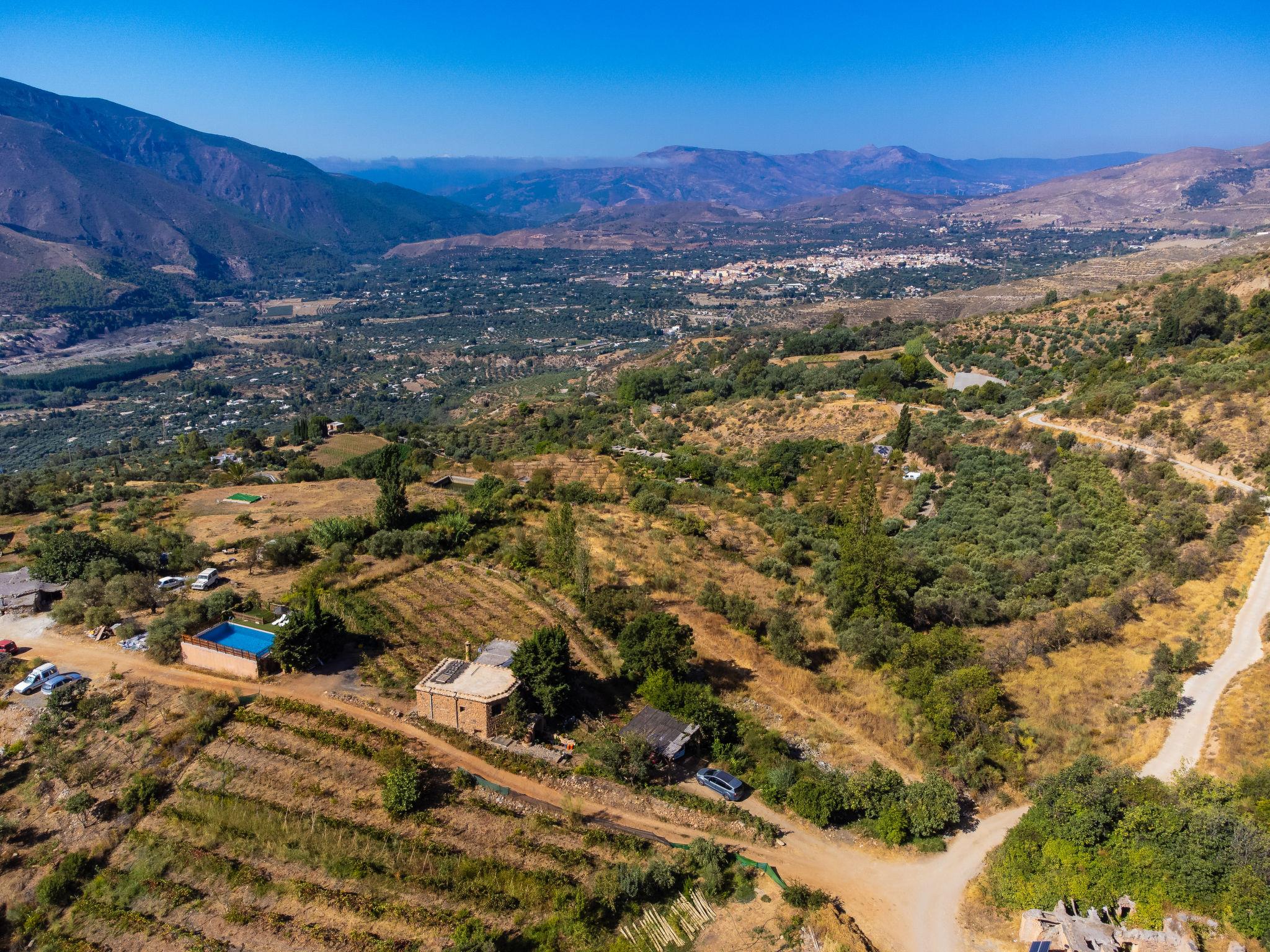 Orgiva: Cosy, simple, comfortable house "Cortijo el Cerrillo", built in 1998, renovated in 2018, surrounded by vineyards. In a secluded, quiet position, in the countryside. Private: natural state property 5'000 m2, swimming pool (11 x 5 m, depth 225 cm, seasonal availability: 01.Apr. - 01.Oct.). Paddling pool. Bumpy, steep motor access (300 m via unmade road). Parking at the house. Grocery 5 km, supermarket 5 km, restaurant 5 km, bus stop 5 km. Nearby attractions: Parque Natural Sierra Nevada Cara Sur 200 m, Aeropuerto Granada 70 km, Granada 58 km, Costa Tropical 30 km. Please note: car recommended. Suitable for families. The owner has a dog.