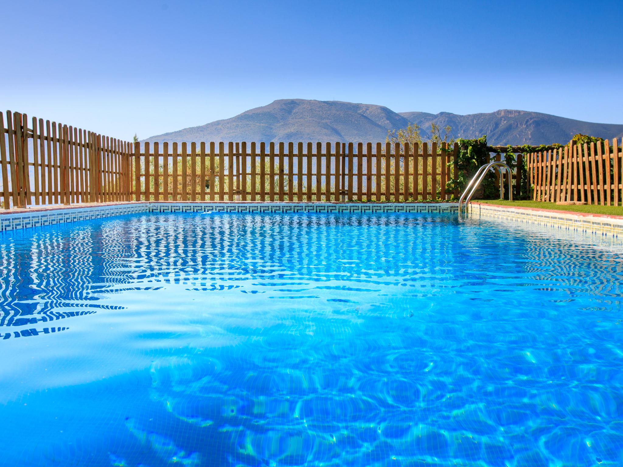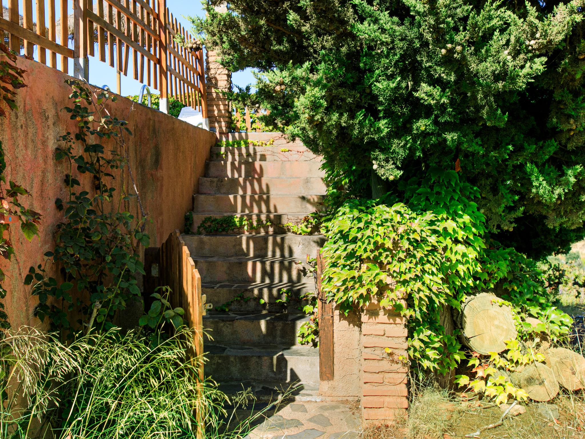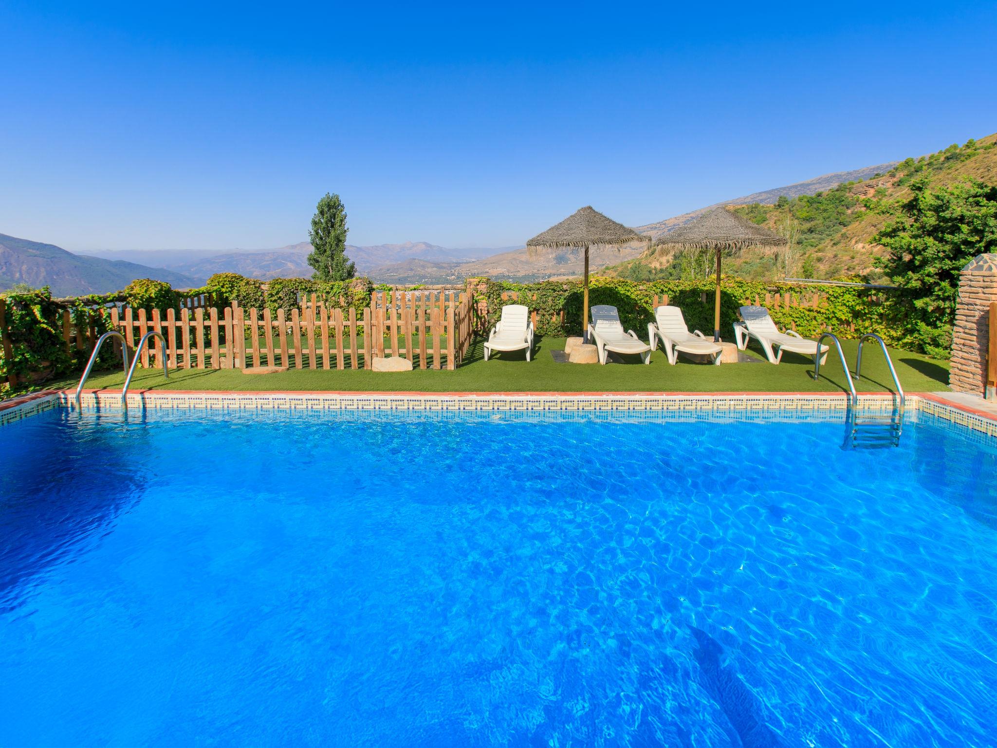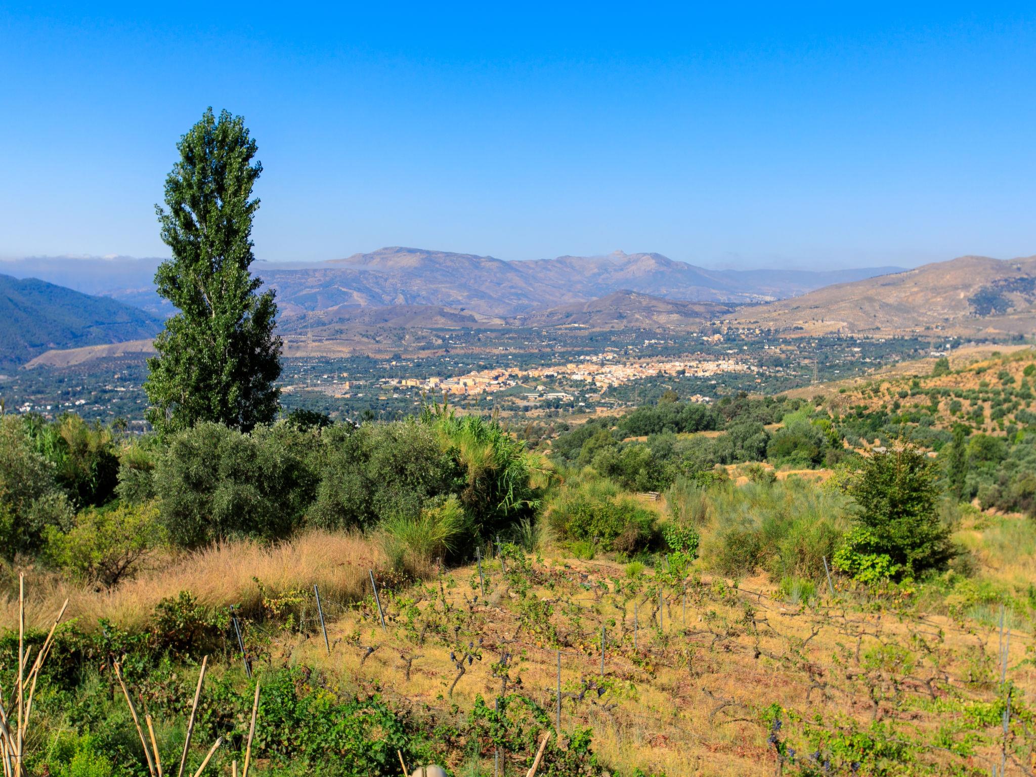Orgiva: Cosy, simple, comfortable house "Cortijo el Cerrillo", built in 1998, renovated in 2018, surrounded by vineyards. In a secluded, quiet position, in the countryside. Private: natural state property 5'000 m2, swimming pool (11 x 5 m, depth 225 cm, seasonal availability: 01.Apr. - 01.Oct.). Paddling pool. Bumpy, steep motor access (300 m via unmade road). Parking at the house. Grocery 5 km, supermarket 5 km, restaurant 5 km, bus stop 5 km. Nearby attractions: Parque Natural Sierra Nevada Cara Sur 200 m, Aeropuerto Granada 70 km, Granada 58 km, Costa Tropical 30 km. Please note: car recommended. Suitable for families. The owner has a dog.