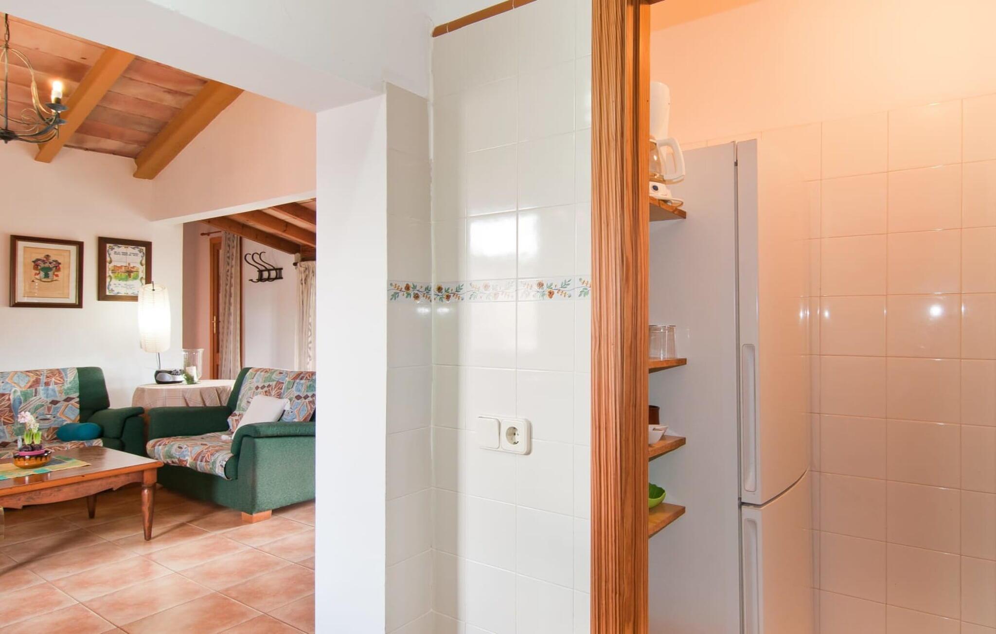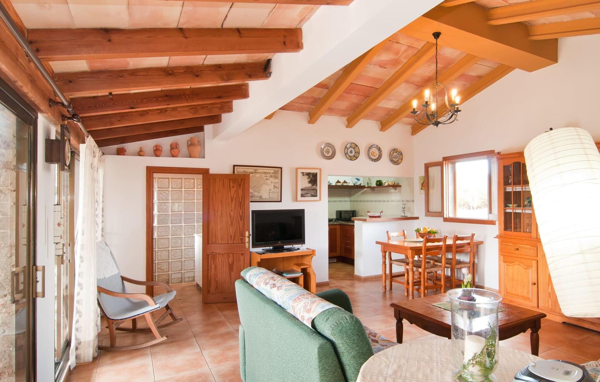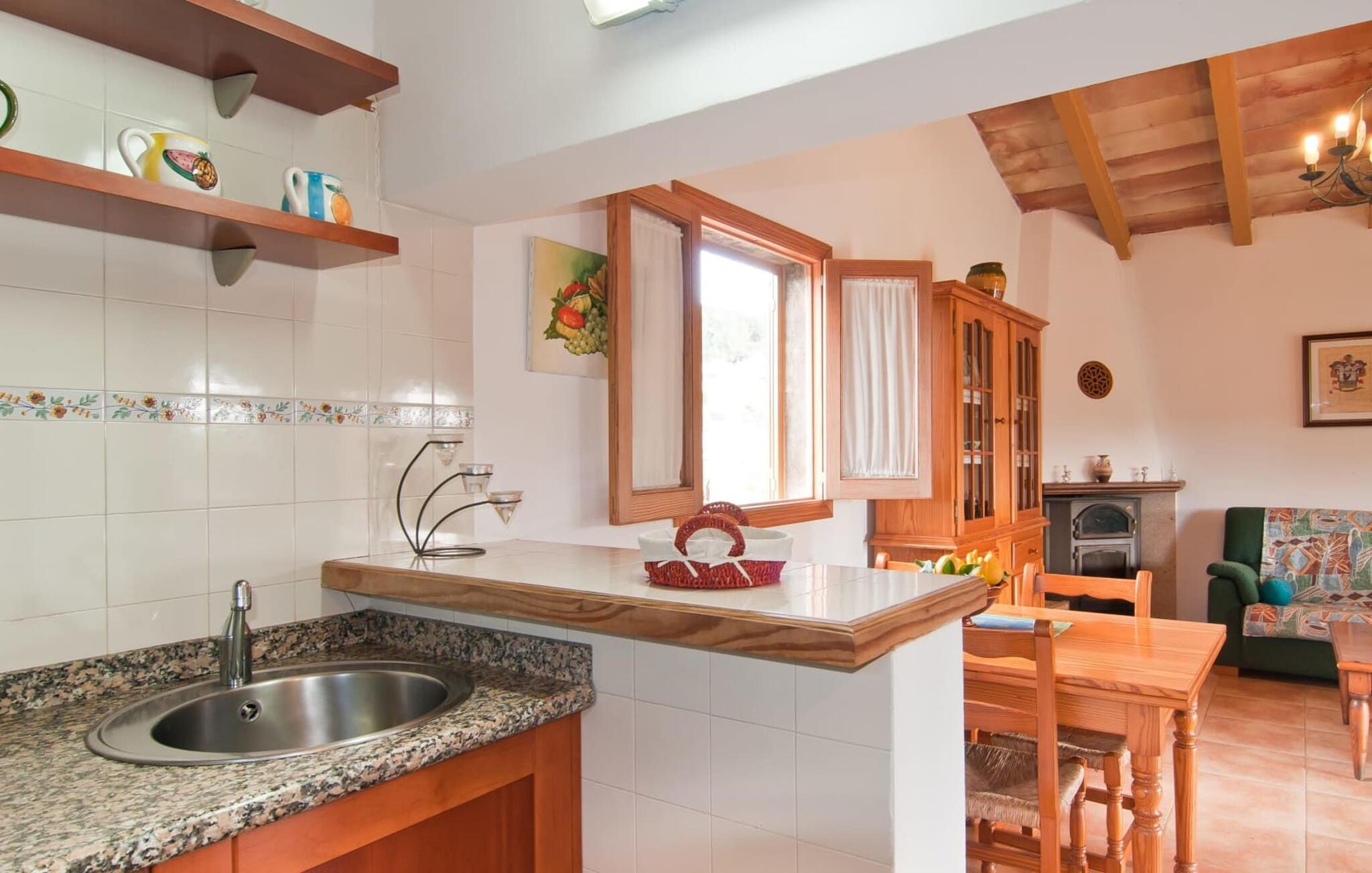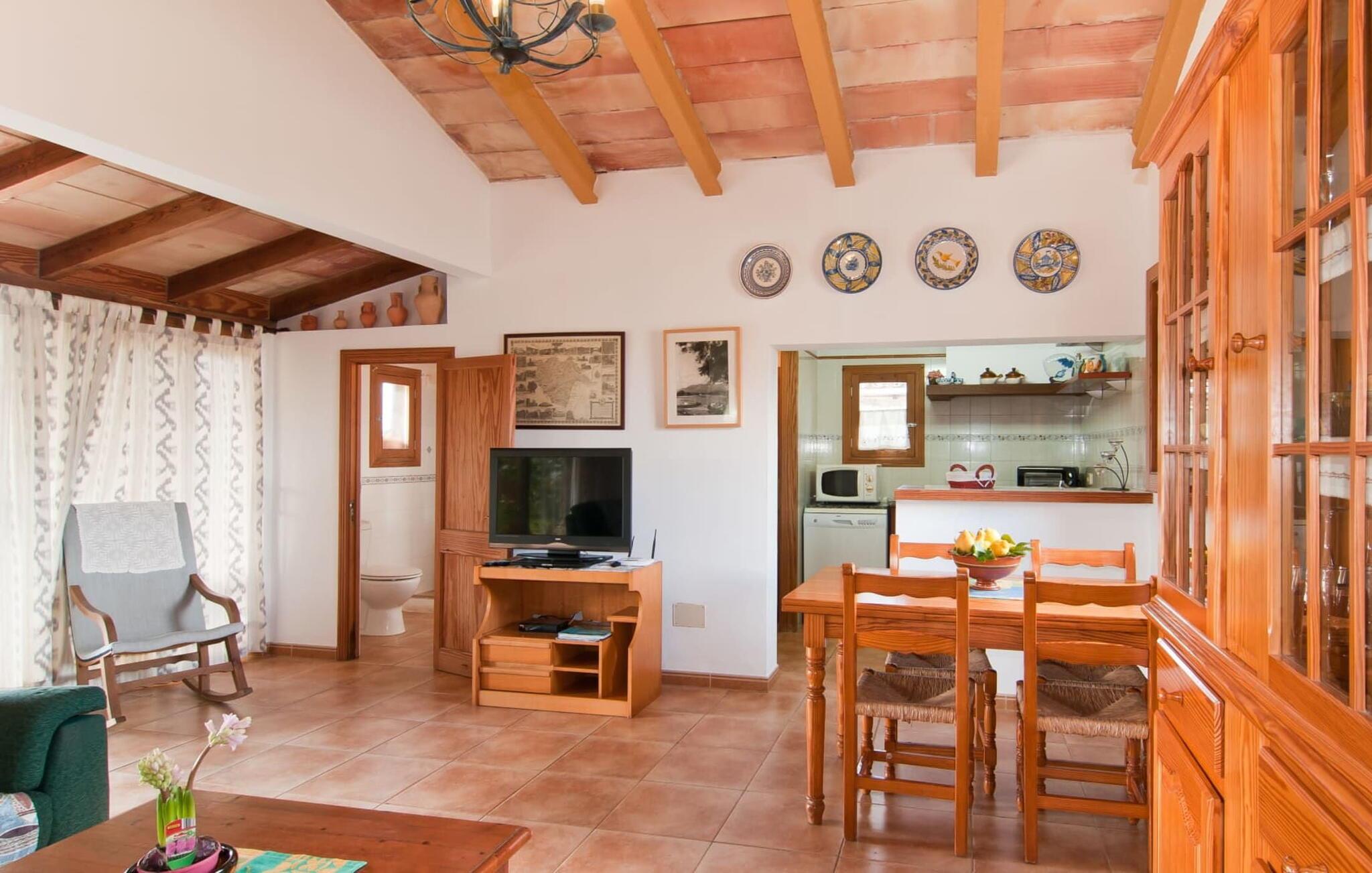 Von hier aus gelangt man durch große, bodenlange Glasschiebetüren in die schön angelegte Villa. Die Inneneinrichtung ist modern, hat jedoch nicht den Bezug zum ursprünglichen Mallorca verloren, was sich in den charmanten Details zeigt. Leben in Innenräumen bedeutet einen offenen Raum, der alle Funktionsbereiche Essen, Kochen und Wohnen vereint. Der gemütliche Wohnbereich mit Sitzecke liegt direkt vor dem gemauerten Kamin. Für Unterhaltung sorgen eine Musikanlage sowie ein smarter LCD-TV und DVD-Player. Das mit Holzmöbeln eingerichtete Esszimmer teilt die gemütliche Atmosphäre des heimeligen, knisternden Feuers. Dahinter befindet sich eine kleine, aber gut ausgestattete Küche, die durch eine Theke optisch vom Essbereich getrennt ist. Es gibt auch zwei Doppelzimmer im Haus. Das ideale Kinderzimmer verfügt über zwei getrennte Einzelbetten, das andere über ein französisches Bett in den Maßen 1,40 x 1,90 m. Die Schlafzimmer teilen sich ein weißes Badezimmer mit modernen Details wie einem großen, begehbaren Duschbereich. Neben der offensichtlich familienfreundlichen Gestaltung empfehlen wir diese Villa vor allem Paaren, die einen romantischen Urlaub zu zweit verbringen möchten.