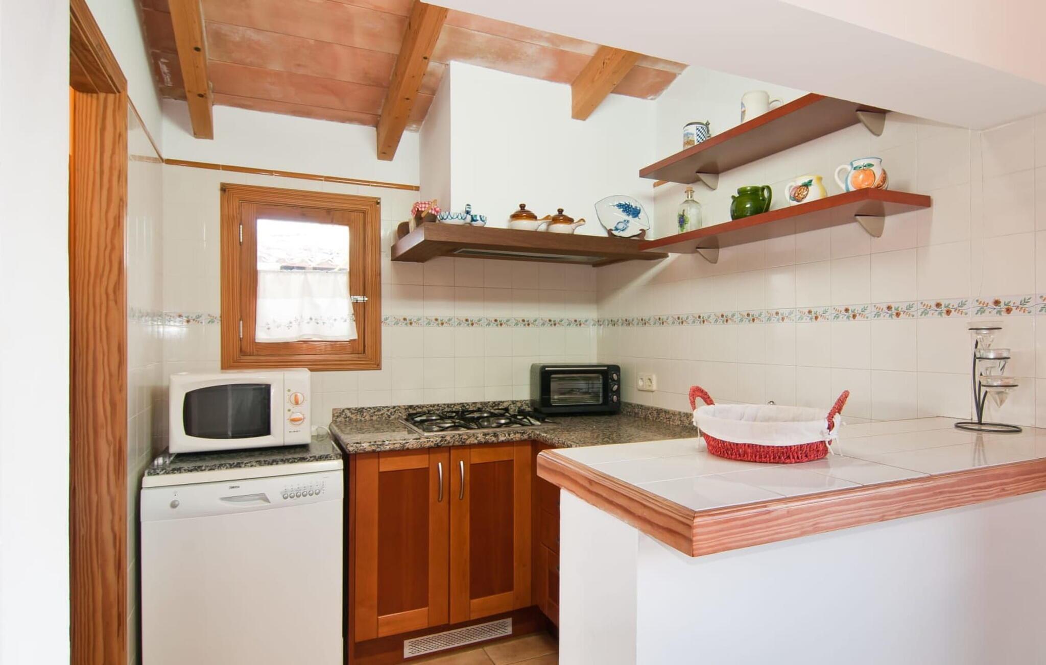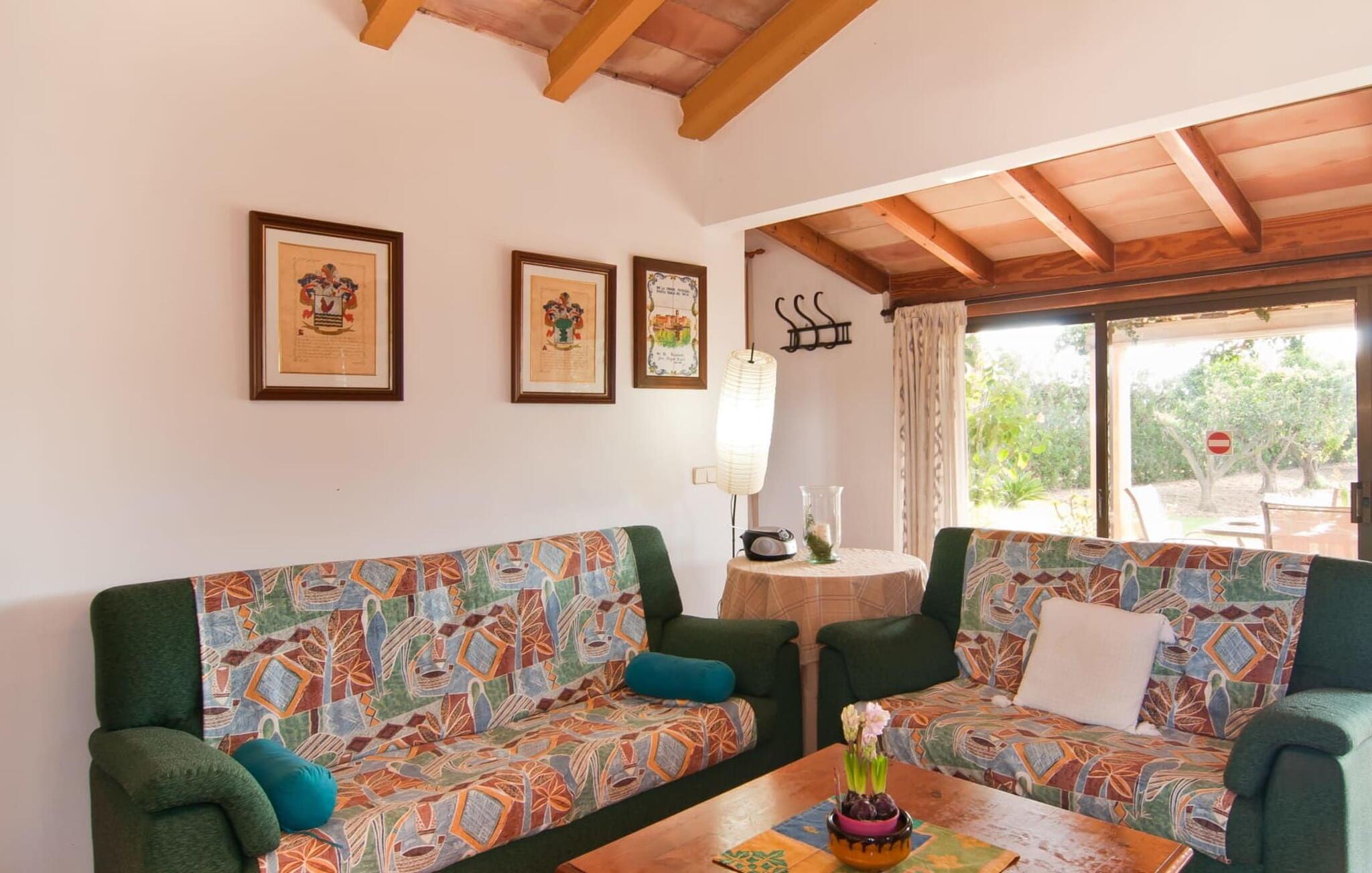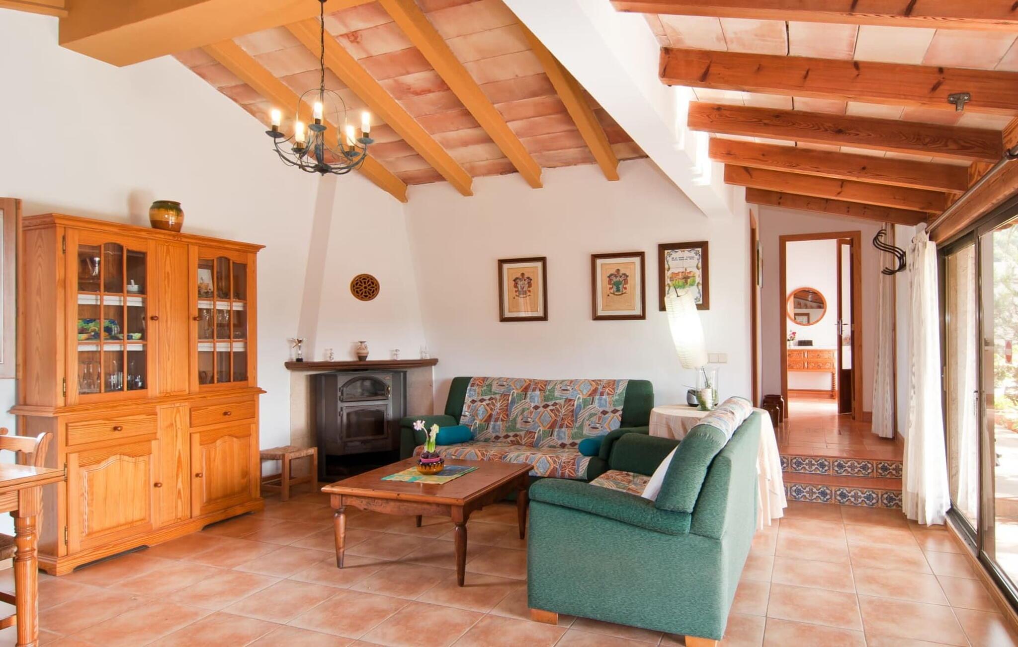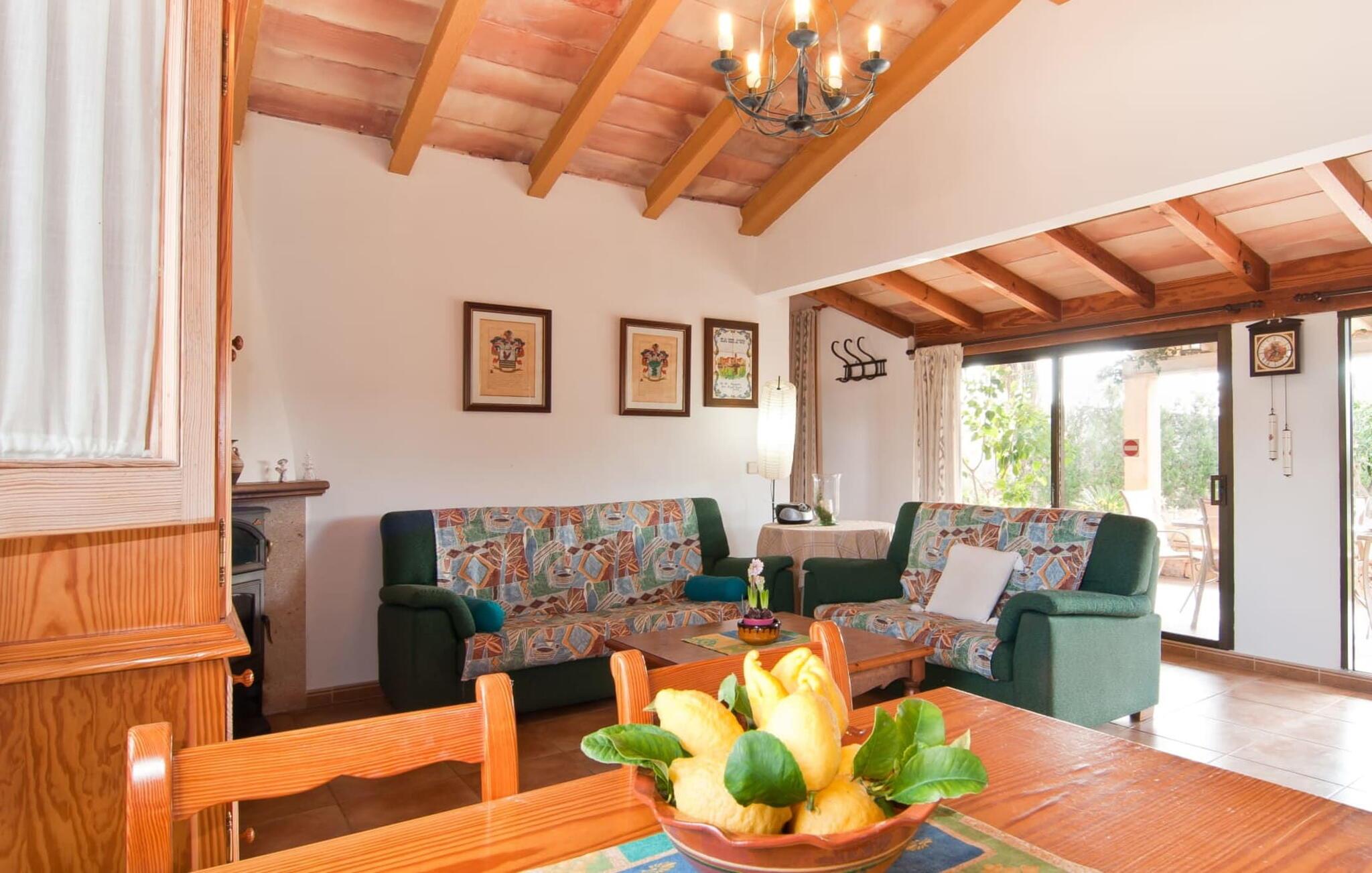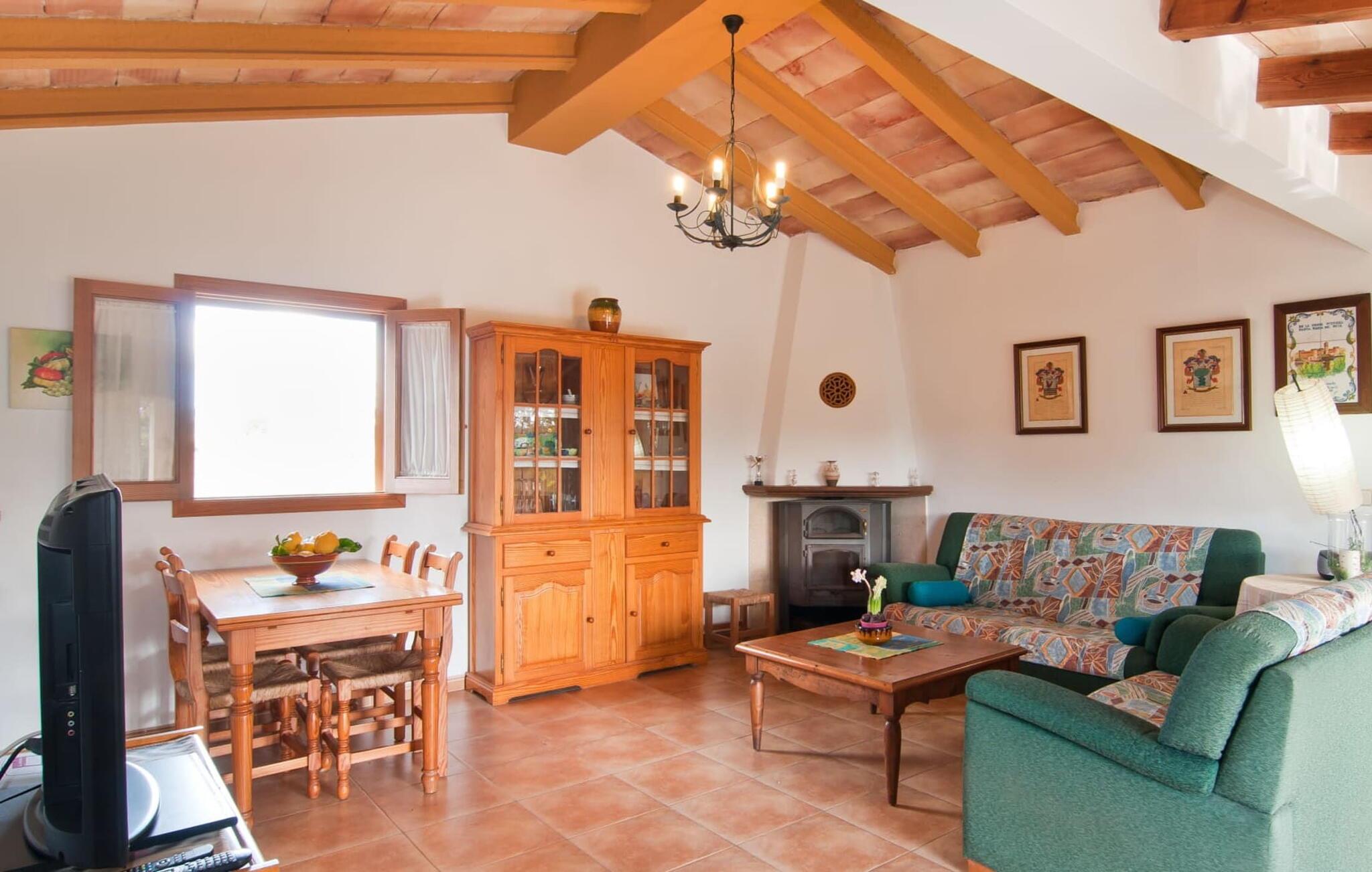Von hier aus gelangt man durch große, bodenlange Glasschiebetüren in die schön angelegte Villa. Die Inneneinrichtung ist modern, hat jedoch nicht den Bezug zum ursprünglichen Mallorca verloren, was sich in den charmanten Details zeigt. Leben in Innenräumen bedeutet einen offenen Raum, der alle Funktionsbereiche Essen, Kochen und Wohnen vereint. Der gemütliche Wohnbereich mit Sitzecke liegt direkt vor dem gemauerten Kamin. Für Unterhaltung sorgen eine Musikanlage sowie ein smarter LCD-TV und DVD-Player. Das mit Holzmöbeln eingerichtete Esszimmer teilt die gemütliche Atmosphäre des heimeligen, knisternden Feuers. Dahinter befindet sich eine kleine, aber gut ausgestattete Küche, die durch eine Theke optisch vom Essbereich getrennt ist. Es gibt auch zwei Doppelzimmer im Haus. Das ideale Kinderzimmer verfügt über zwei getrennte Einzelbetten, das andere über ein französisches Bett in den Maßen 1,40 x 1,90 m. Die Schlafzimmer teilen sich ein weißes Badezimmer mit modernen Details wie einem großen, begehbaren Duschbereich. Neben der offensichtlich familienfreundlichen Gestaltung empfehlen wir diese Villa vor allem Paaren, die einen romantischen Urlaub zu zweit verbringen möchten.
