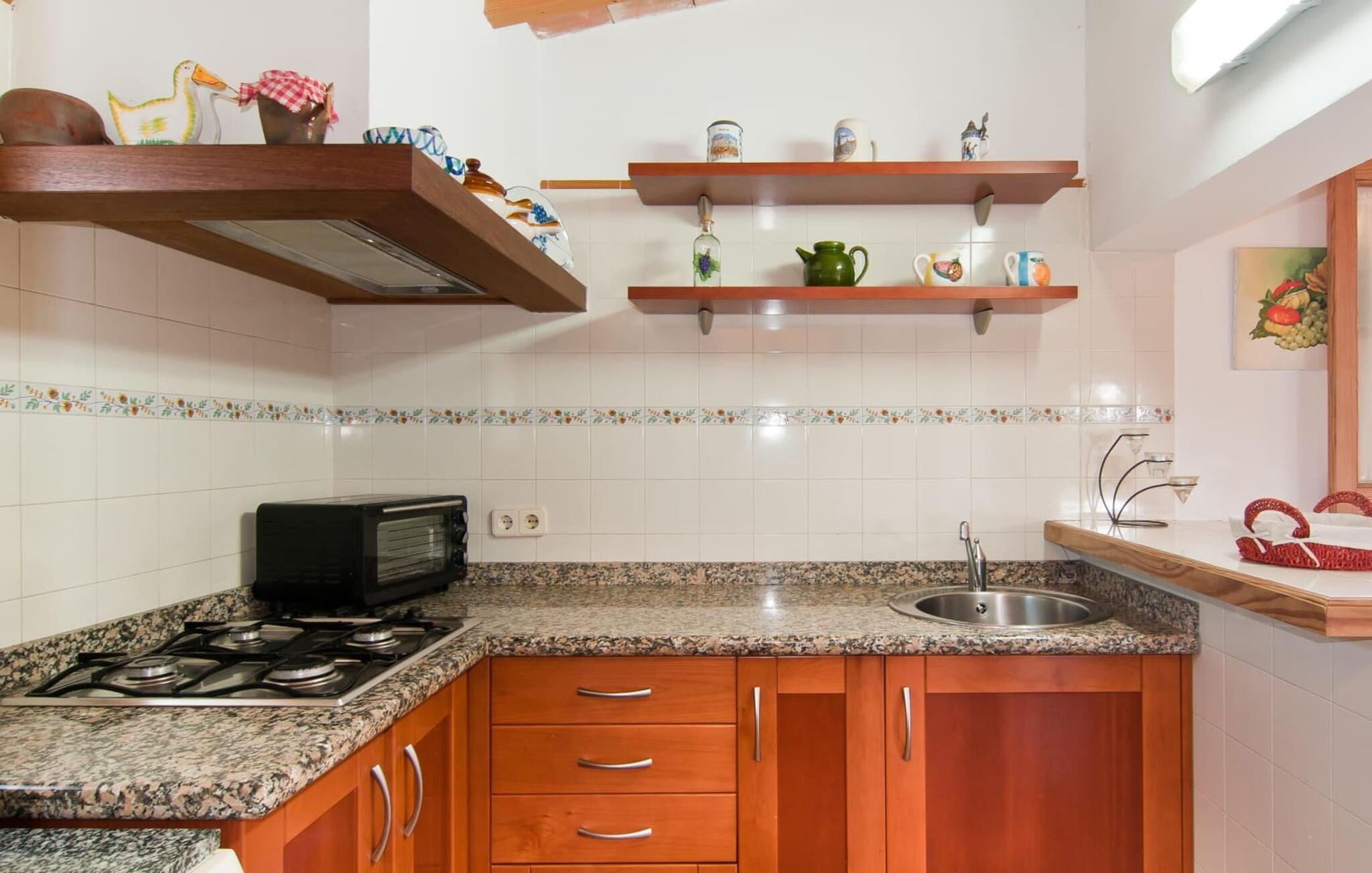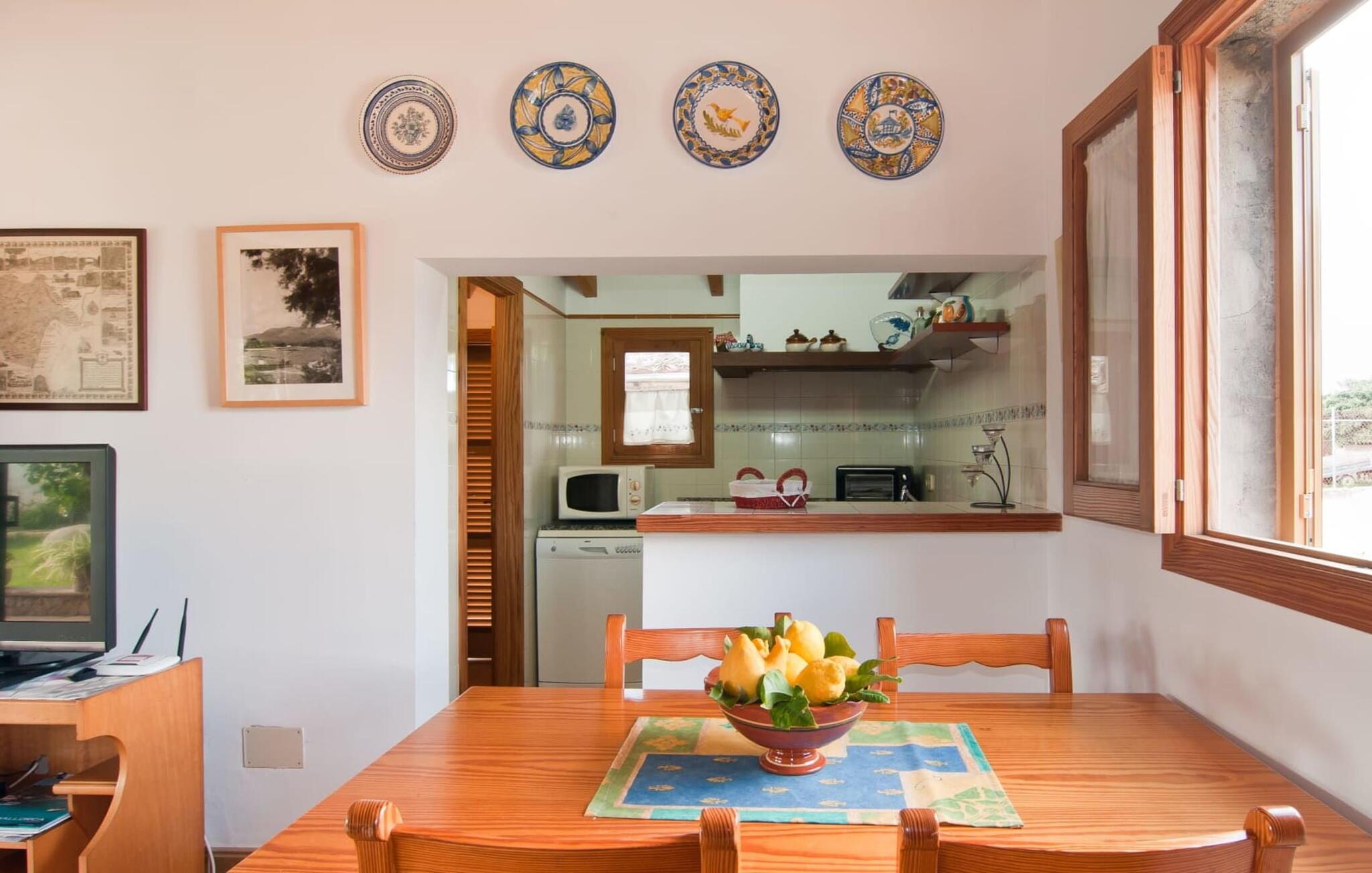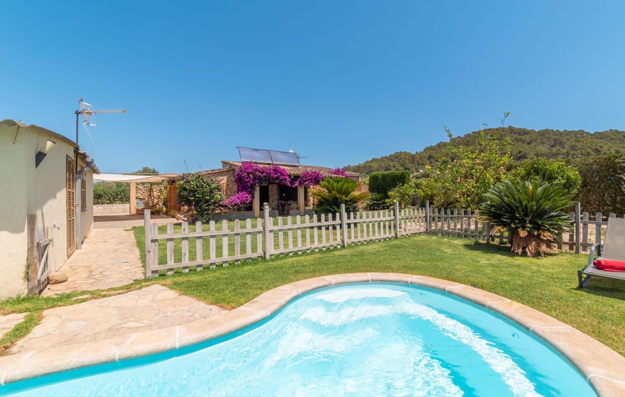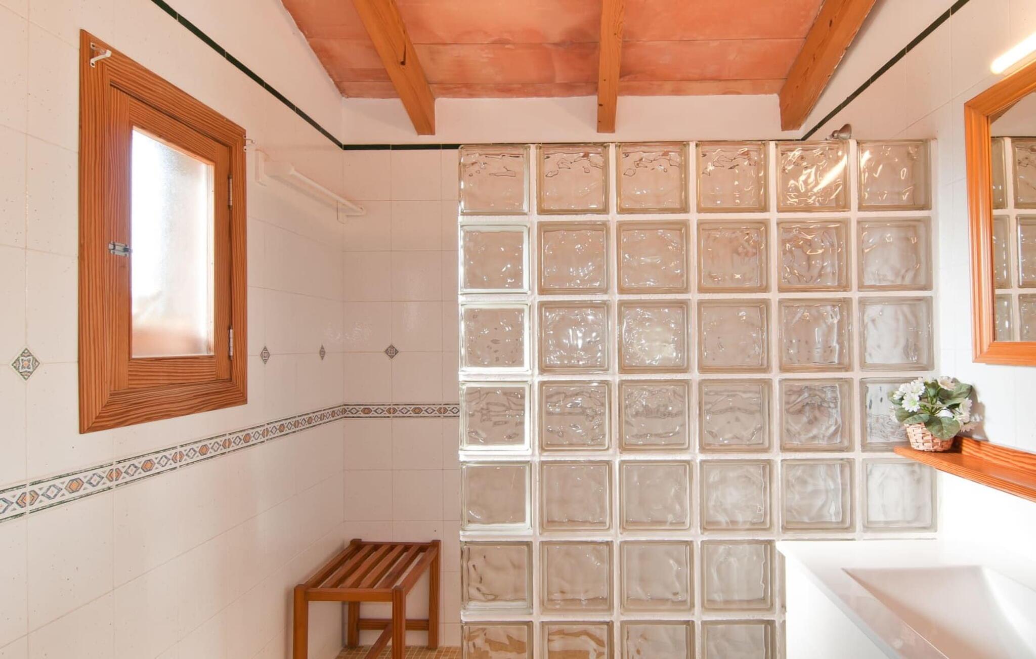 Von hier aus gelangt man durch große, bodenlange Glasschiebetüren in die schön angelegte Villa. Die Inneneinrichtung ist modern, hat jedoch nicht den Bezug zum ursprünglichen Mallorca verloren, was sich in den charmanten Details zeigt. Leben in Innenräumen bedeutet einen offenen Raum, der alle Funktionsbereiche Essen, Kochen und Wohnen vereint. Der gemütliche Wohnbereich mit Sitzecke liegt direkt vor dem gemauerten Kamin. Für Unterhaltung sorgen eine Musikanlage sowie ein smarter LCD-TV und DVD-Player. Das mit Holzmöbeln eingerichtete Esszimmer teilt die gemütliche Atmosphäre des heimeligen, knisternden Feuers. Dahinter befindet sich eine kleine, aber gut ausgestattete Küche, die durch eine Theke optisch vom Essbereich getrennt ist. Es gibt auch zwei Doppelzimmer im Haus. Das ideale Kinderzimmer verfügt über zwei getrennte Einzelbetten, das andere über ein französisches Bett in den Maßen 1,40 x 1,90 m. Die Schlafzimmer teilen sich ein weißes Badezimmer mit modernen Details wie einem großen, begehbaren Duschbereich. Neben der offensichtlich familienfreundlichen Gestaltung empfehlen wir diese Villa vor allem Paaren, die einen romantischen Urlaub zu zweit verbringen möchten.