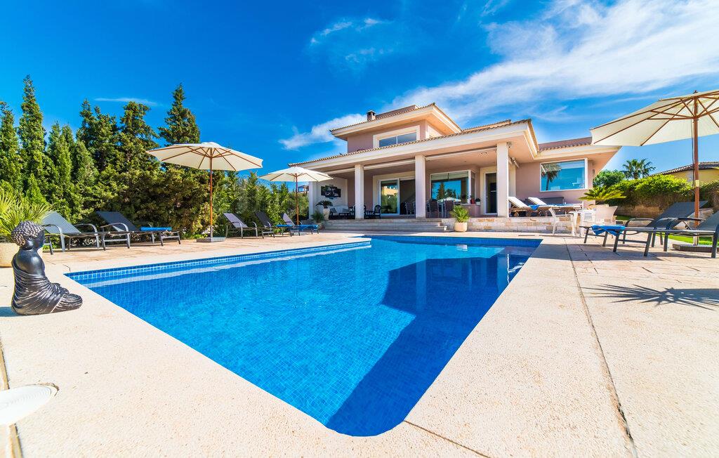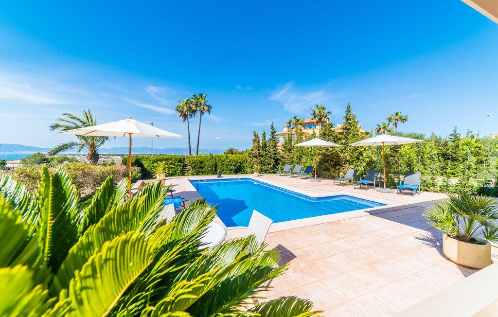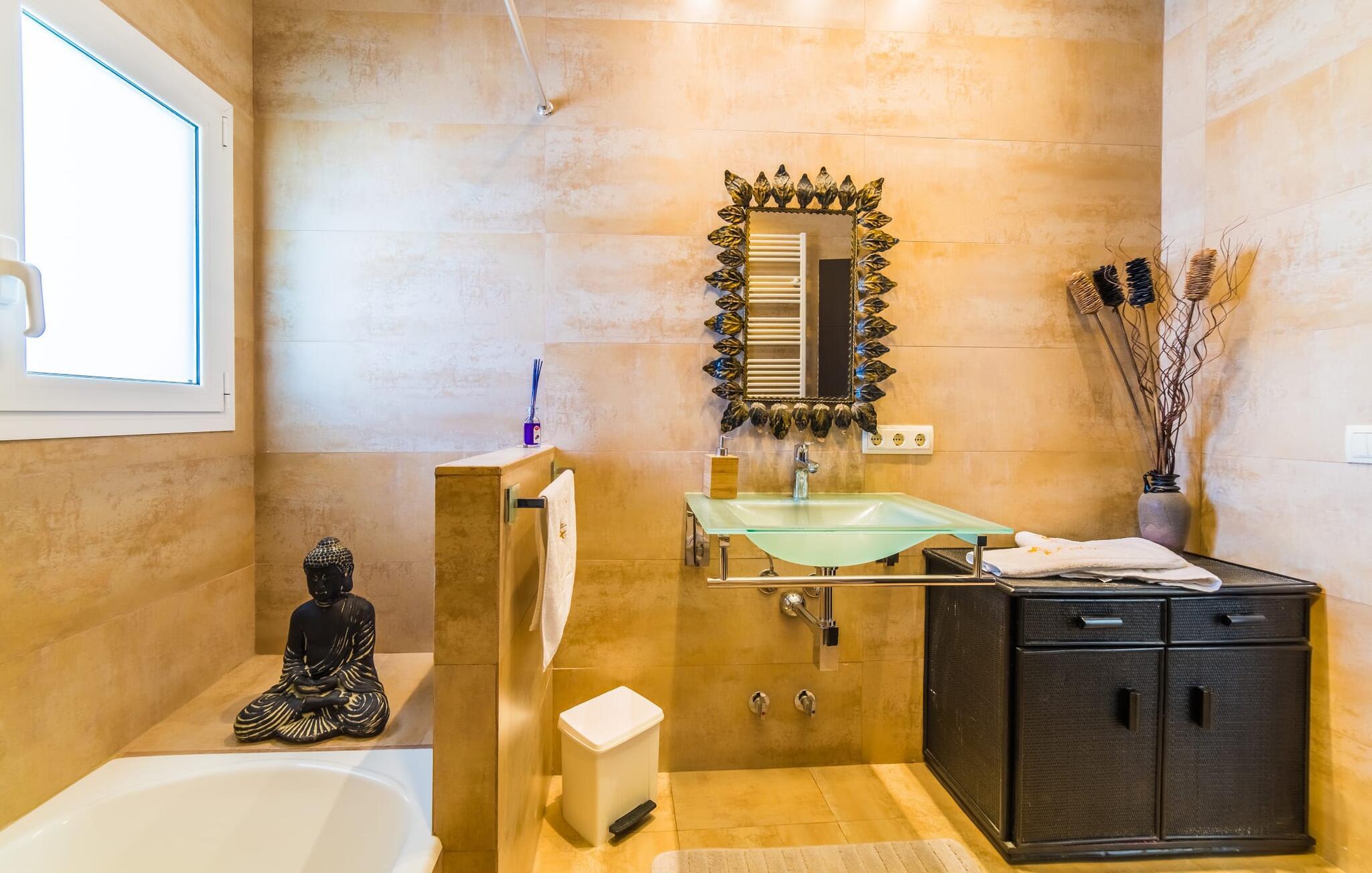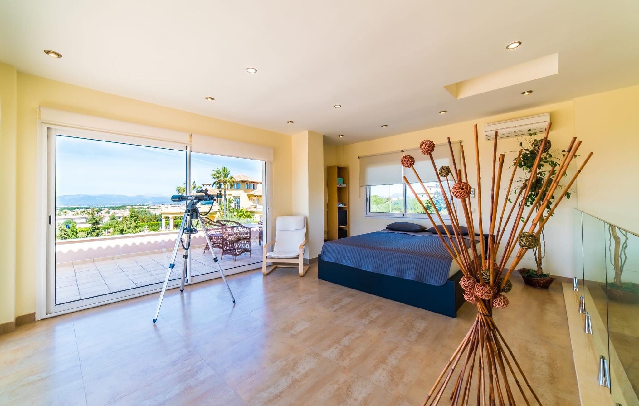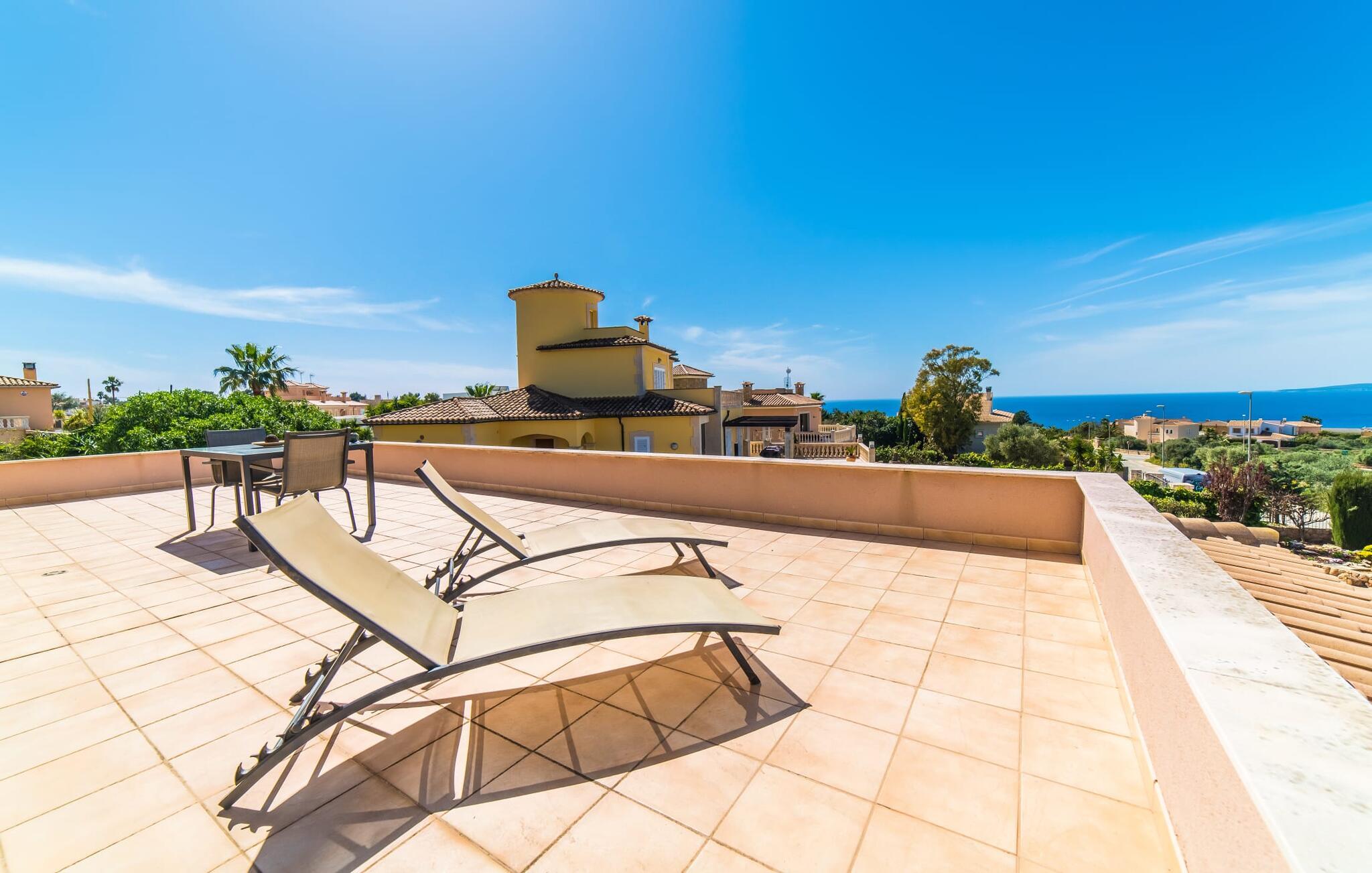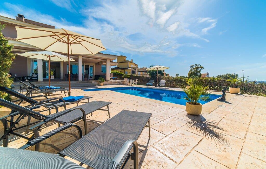 Das blaue Meer in Sichtweite und das Gefühl eines Strandtuchs auf der Haut: Diese moderne, zweistöckige Villa hat überall große Fenster, versteckt aber gleichzeitig den schönen Pool und seine Loungebereiche gekonnt hinter Bäumen und Hecken. Privatsphäre wird im Villenviertel großgeschrieben. Wenn die Terrassenmarkisen ausgefahren sind, fühlen Sie sich im gemütlichen Wohnraum im Freien wirklich von Ihren Nachbarn getrennt. Hier können Sie nach Herzenslust grillen, chillen oder schlemmen. Die gesamte Meereslandschaft liegt den Sonnenanbetern zu Füßen, die sich auf der weitläufigen Dachterrasse sonnen. Wenn Sie möchten, können Sie auch ab und zu Ihre gesamte Kleidung hier abgeben. Die Bucht von Palma zeigt sich in ihrer ganzen Schönheit. Nachts funkeln die Lichter der Hauptstadt und man fragt sich, ob man später noch hinfahren möchte, um einen Cocktail zu trinken oder einen Spaziergang zu machen. Am Haus befindet sich ein asphaltierter Parkplatz, auf dem Sie Ihren Mietwagen sicher und bequem abstellen können, und auch rund um die Tischtennisplatte ist ausreichend Bewegungsraum vorhanden. Villa „Redrema“ verspricht nicht nur rosarote Zeiten, auch Buddha durchdringt das Haus und bringt Harmonie und Urlaubsglück.
