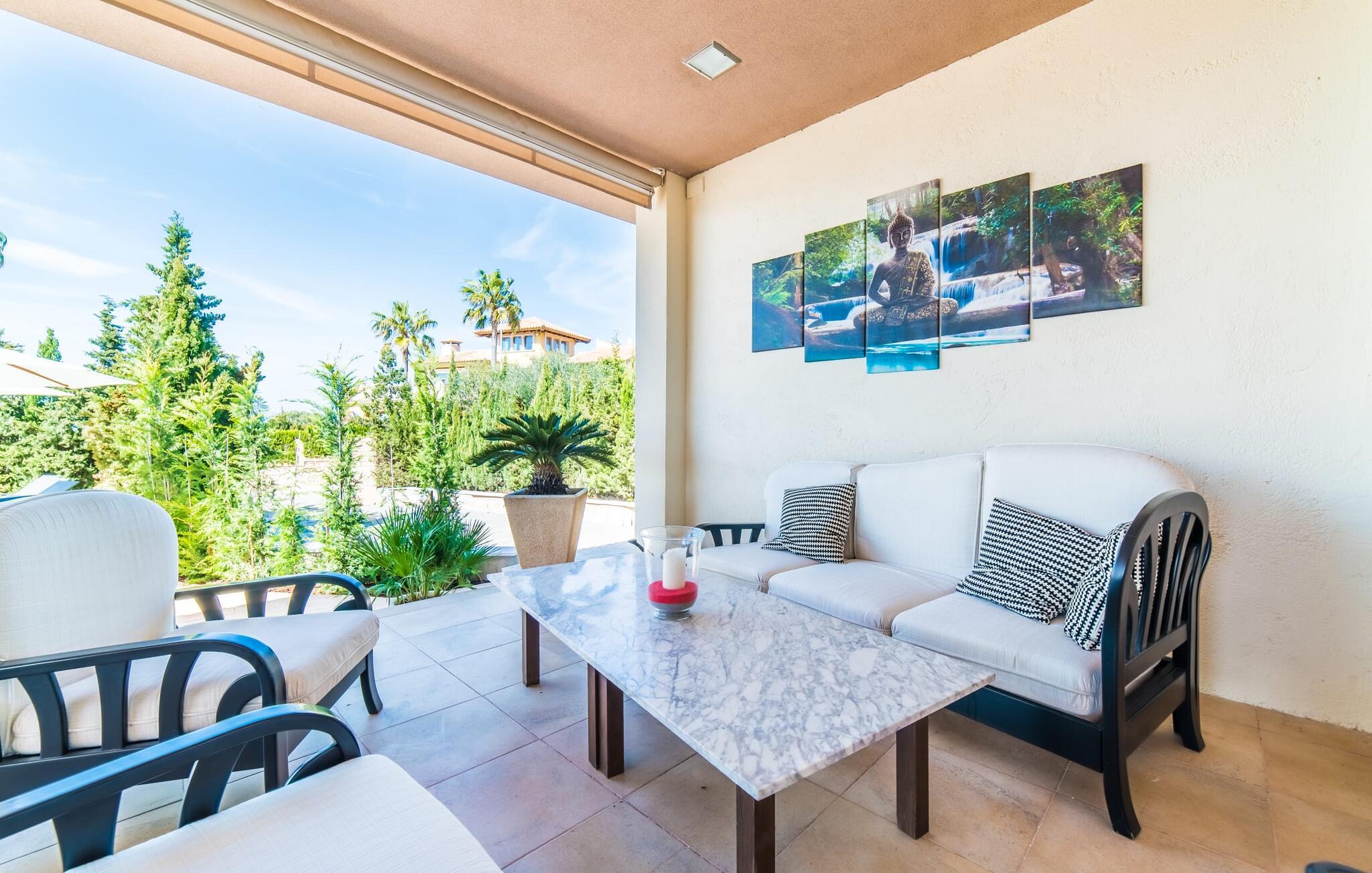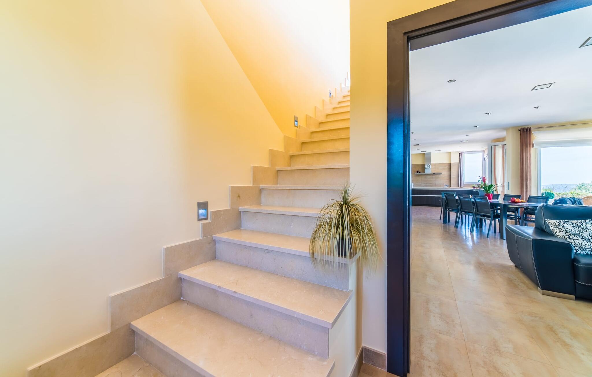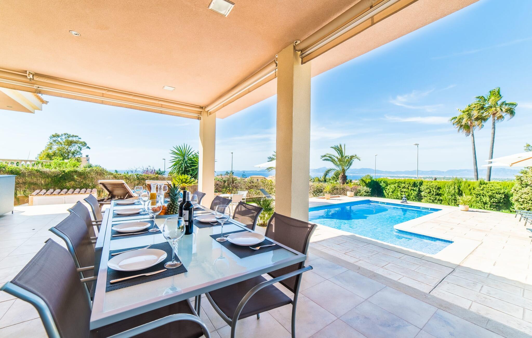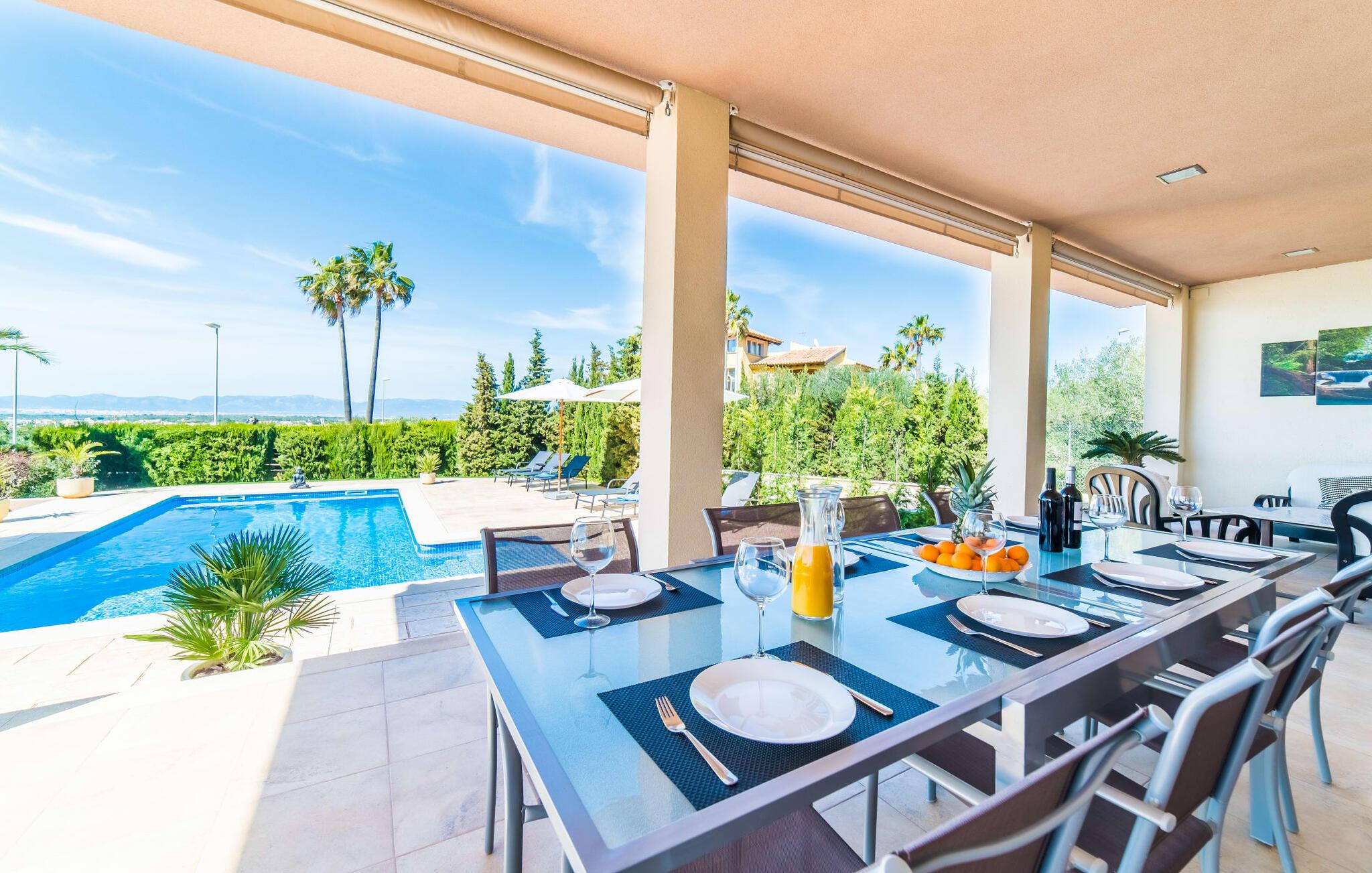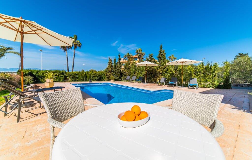 Das blaue Meer in Sichtweite und das Gefühl eines Strandtuchs auf der Haut: Diese moderne, zweistöckige Villa hat überall große Fenster, versteckt aber gleichzeitig den schönen Pool und seine Loungebereiche gekonnt hinter Bäumen und Hecken. Privatsphäre wird im Villenviertel großgeschrieben. Wenn die Terrassenmarkisen ausgefahren sind, fühlen Sie sich im gemütlichen Wohnraum im Freien wirklich von Ihren Nachbarn getrennt. Hier können Sie nach Herzenslust grillen, chillen oder schlemmen. Die gesamte Meereslandschaft liegt den Sonnenanbetern zu Füßen, die sich auf der weitläufigen Dachterrasse sonnen. Wenn Sie möchten, können Sie auch ab und zu Ihre gesamte Kleidung hier abgeben. Die Bucht von Palma zeigt sich in ihrer ganzen Schönheit. Nachts funkeln die Lichter der Hauptstadt und man fragt sich, ob man später noch hinfahren möchte, um einen Cocktail zu trinken oder einen Spaziergang zu machen. Am Haus befindet sich ein asphaltierter Parkplatz, auf dem Sie Ihren Mietwagen sicher und bequem abstellen können, und auch rund um die Tischtennisplatte ist ausreichend Bewegungsraum vorhanden. Villa „Redrema“ verspricht nicht nur rosarote Zeiten, auch Buddha durchdringt das Haus und bringt Harmonie und Urlaubsglück.