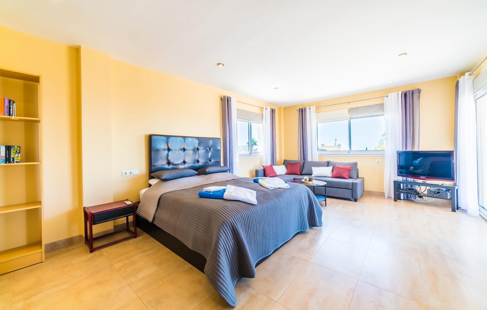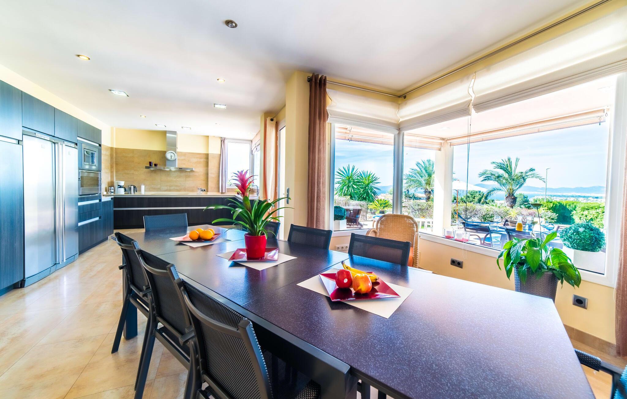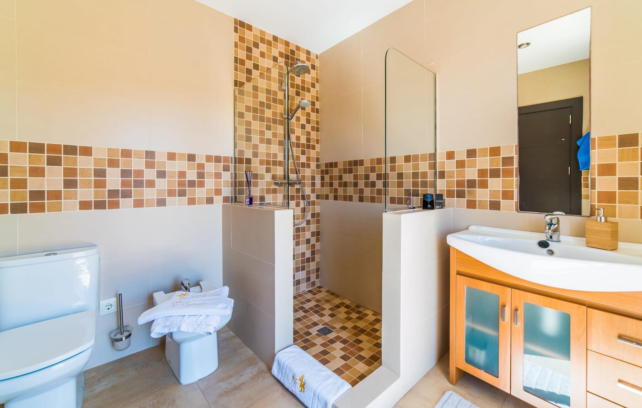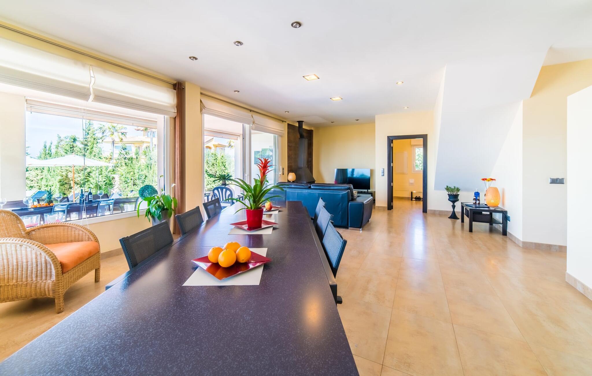 Das blaue Meer in Sichtweite und das Gefühl eines Strandtuchs auf der Haut: Diese moderne, zweistöckige Villa hat überall große Fenster, versteckt aber gleichzeitig den schönen Pool und seine Loungebereiche gekonnt hinter Bäumen und Hecken. Privatsphäre wird im Villenviertel großgeschrieben. Wenn die Terrassenmarkisen ausgefahren sind, fühlen Sie sich im gemütlichen Wohnraum im Freien wirklich von Ihren Nachbarn getrennt. Hier können Sie nach Herzenslust grillen, chillen oder schlemmen. Die gesamte Meereslandschaft liegt den Sonnenanbetern zu Füßen, die sich auf der weitläufigen Dachterrasse sonnen. Wenn Sie möchten, können Sie auch ab und zu Ihre gesamte Kleidung hier abgeben. Die Bucht von Palma zeigt sich in ihrer ganzen Schönheit. Nachts funkeln die Lichter der Hauptstadt und man fragt sich, ob man später noch hinfahren möchte, um einen Cocktail zu trinken oder einen Spaziergang zu machen. Am Haus befindet sich ein asphaltierter Parkplatz, auf dem Sie Ihren Mietwagen sicher und bequem abstellen können, und auch rund um die Tischtennisplatte ist ausreichend Bewegungsraum vorhanden. Villa „Redrema“ verspricht nicht nur rosarote Zeiten, auch Buddha durchdringt das Haus und bringt Harmonie und Urlaubsglück.