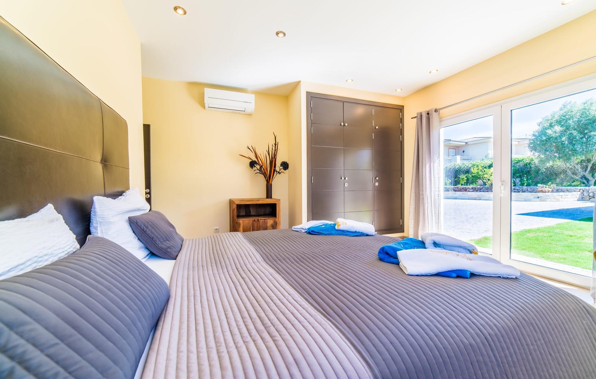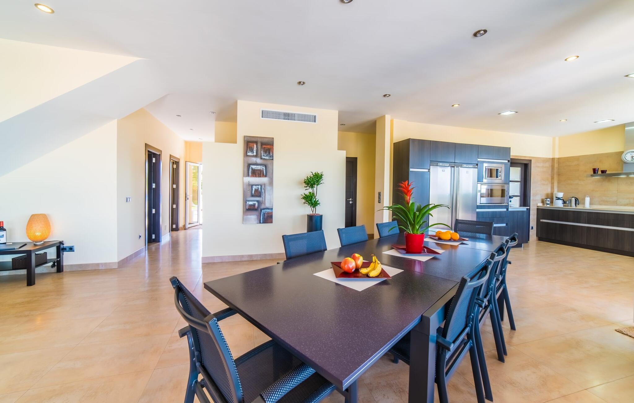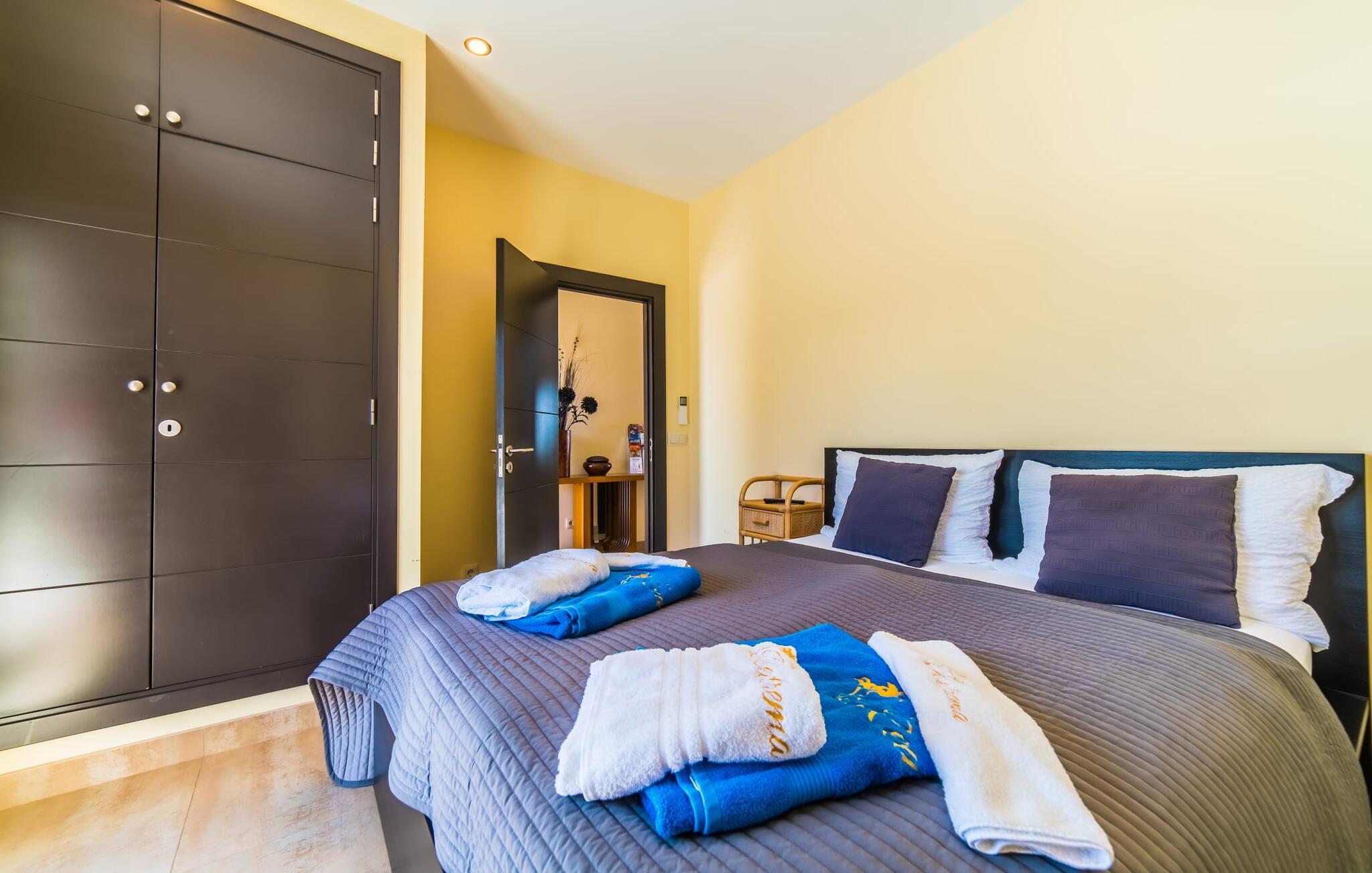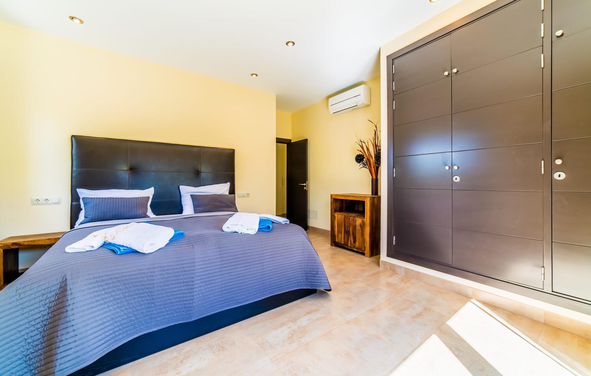 Der Wohnbereich ist eher zurückhaltend eingerichtet und akzentuiert gestaltet mit TV-Ecke, Esstisch und Einbauküche, deren extragroßer Kühlschrank ideal für heiße Tage und die Vielfalt der Angebote auf den Bauernmärkten ist. Nicht nur Allergiker werden sich über die teppichfreien Marmorböden freuen. Villa „Redrema“ möchte möglichst viel Licht in die Räume lassen und setzt dabei auf die große Glasfassade zum Pool und Meer hin. Fenster und Terrassentüren spielen im Haus eine entscheidende Rolle. Von allen vier Gästezimmern besteht ein direkter Zugang nach draußen; von den beiden unten und den beiden oben. Große Einbauschränke helfen Ihnen dabei, selbst das größte Gepäck zu verstauen. Das Erdgeschoss und der Balkon müssen jedoch in Ruhe mitbenutzt werden. Die geräumige Master-Suite mit einem 1,8 x 2 m großen Doppelbett, eigenem Duschbad und Ankleidebereich geht in die offene Galerie über, die ebenfalls über ein Doppelbett verfügt und Ihren Gästen eingeschränkte Privatsphäre, aber eine fantastische Aussicht bietet. Beim Sonnenbaden und einem gemütlichen Fernsehabend rückt die Familie hier ganz leicht näher zusammen. Im Erdgeschoss gibt es zwei weitere elegante Badezimmer, eines davon mit Badewanne, sodass jedes Gästezimmer über ein eigenes verfügt – nicht ganz en-suite wie im Obergeschoss, aber dennoch ein Badezimmer in der Nähe...