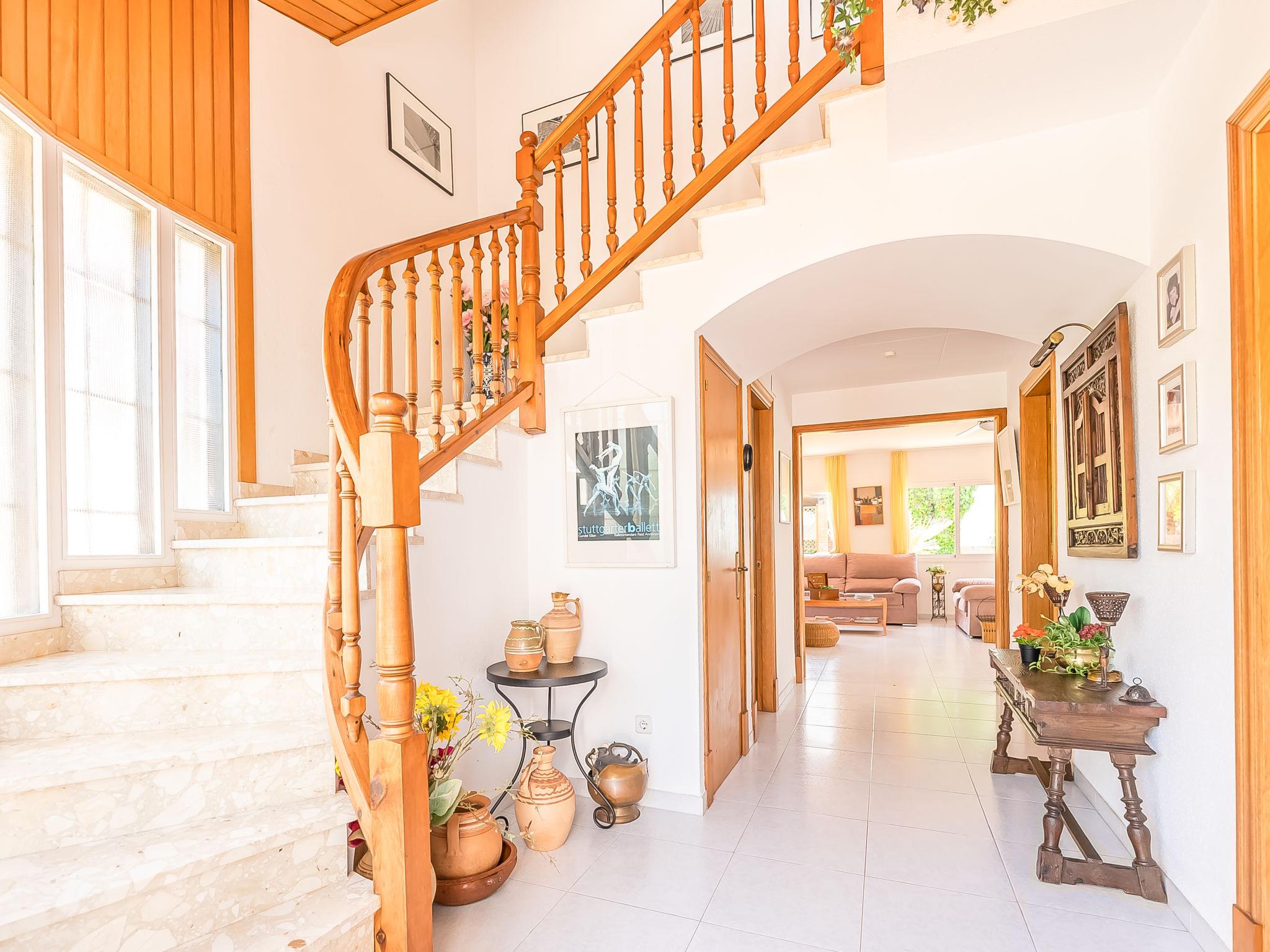 "Santiago", 4-room house 160 m2 on 2 levels. Comfortable and cosy furnishings: living/dining room with open-hearth fireplace, dining table, satellite TV and digital TV. Exit to the terrace. Kitchen (oven, dishwasher, 3 ceramic glass hob hotplates, toaster, kettle, microwave, freezer, electric coffee machine) with small dining table. Exit to the terrace. Sep. WC. Upper floor: 1 double bedroom with (180 cm, length 190 cm), shower/WC. Exit to the balcony. 1 double bedroom (180 cm, length 190 cm). 1 room with 1 french bed (150 cm, length 190 cm). Bath/WC. No heating option. Balcony, terrace partly roofed, small terrace 4 m2, roofed. Terrace furniture, deck chairs (4), box-room. Facilities: washing machine, iron, children's high chair, baby cot. Internet (WiFi, free). Please note: non-smoking house. HUTT-014496 // Reg. Nr.: ESFCTU00004302800009830300000000000000000HUTT-0144968