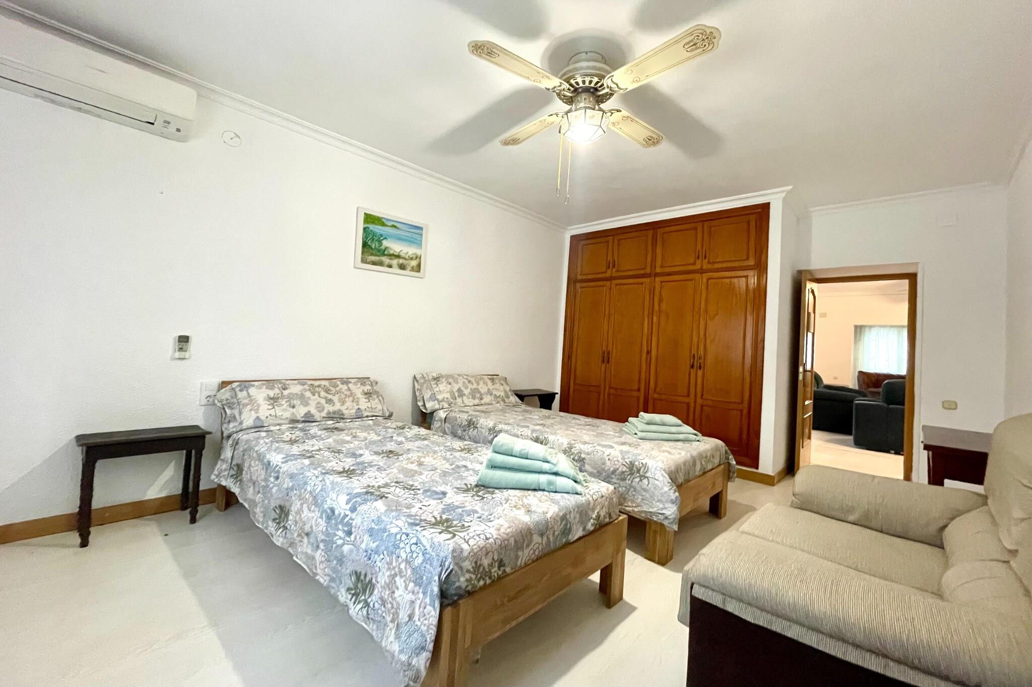 Ground floor: (Entrance(reachable from the outside), Large kitchen(hob, boiling water tap, toaster, hood, coffee machine, oven, microwave, dishwasher, fridge-freezer, Juicer), Living/diningroom(single sofa bed, TV(flatscreen, international television channels), dining table, fireplace, seating area), bedroom(double king size bed), bedroom(double king size bed), bedroom(single bed, single bed), bedroom(single bed), bathroom(massage shower, washbasin, toilet), bathroom(shower, washbasin, toilet), heating, air conditioning, terrace) bathroom(shower, washbasin, toilet), washing room(tumble dryer, washing machine, ironing board, iron), garden doors, garden, garden furniture, parking lot(public), swimming pool(private, outside, opened from Jan upto and including Dec), hammock, hammock, hammock, hammock, hammock, hammock, hammock
