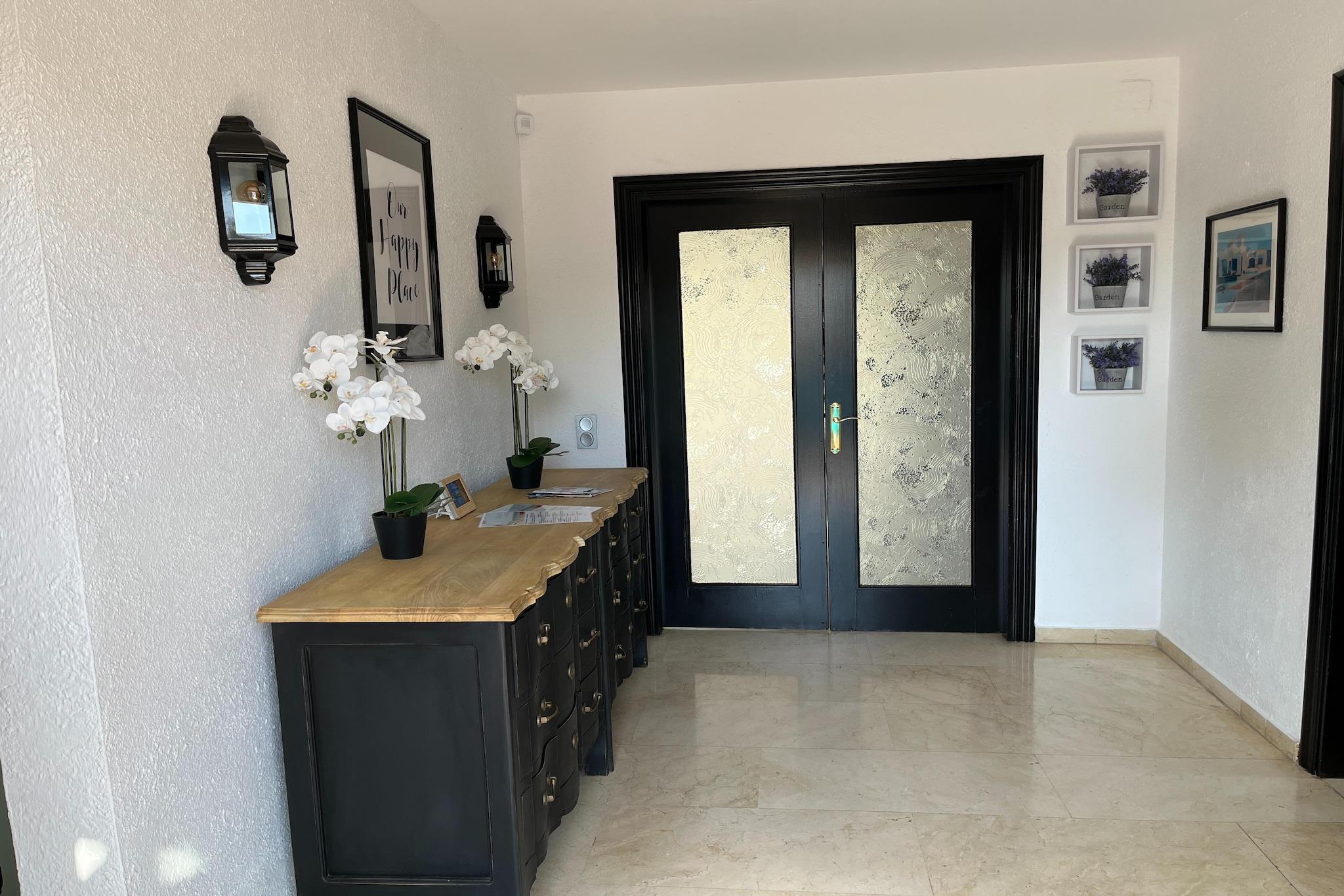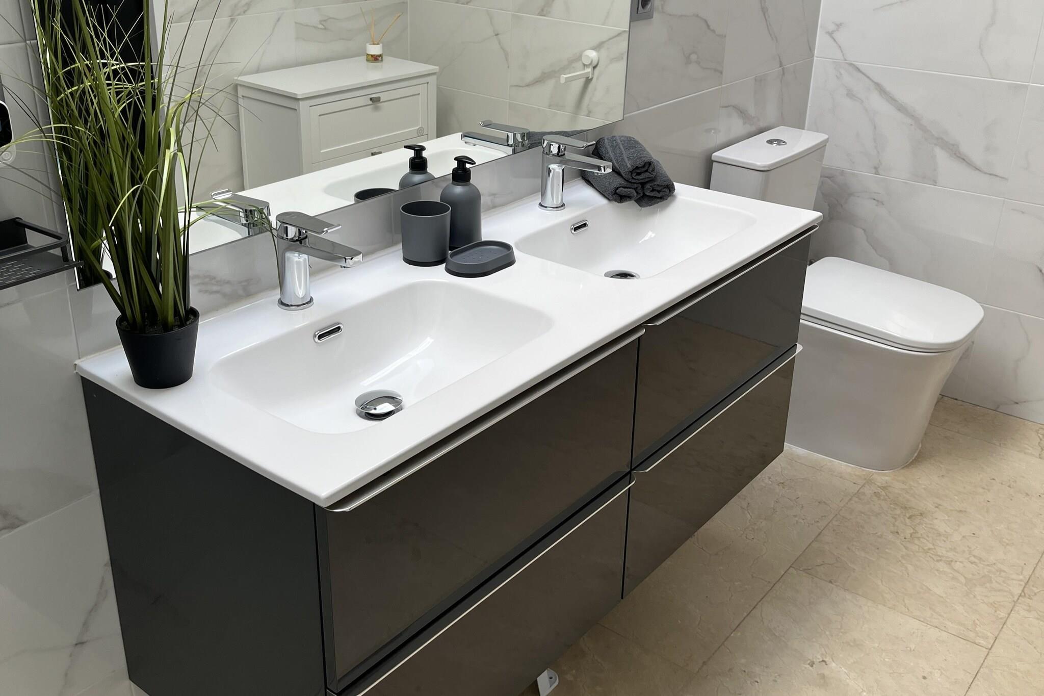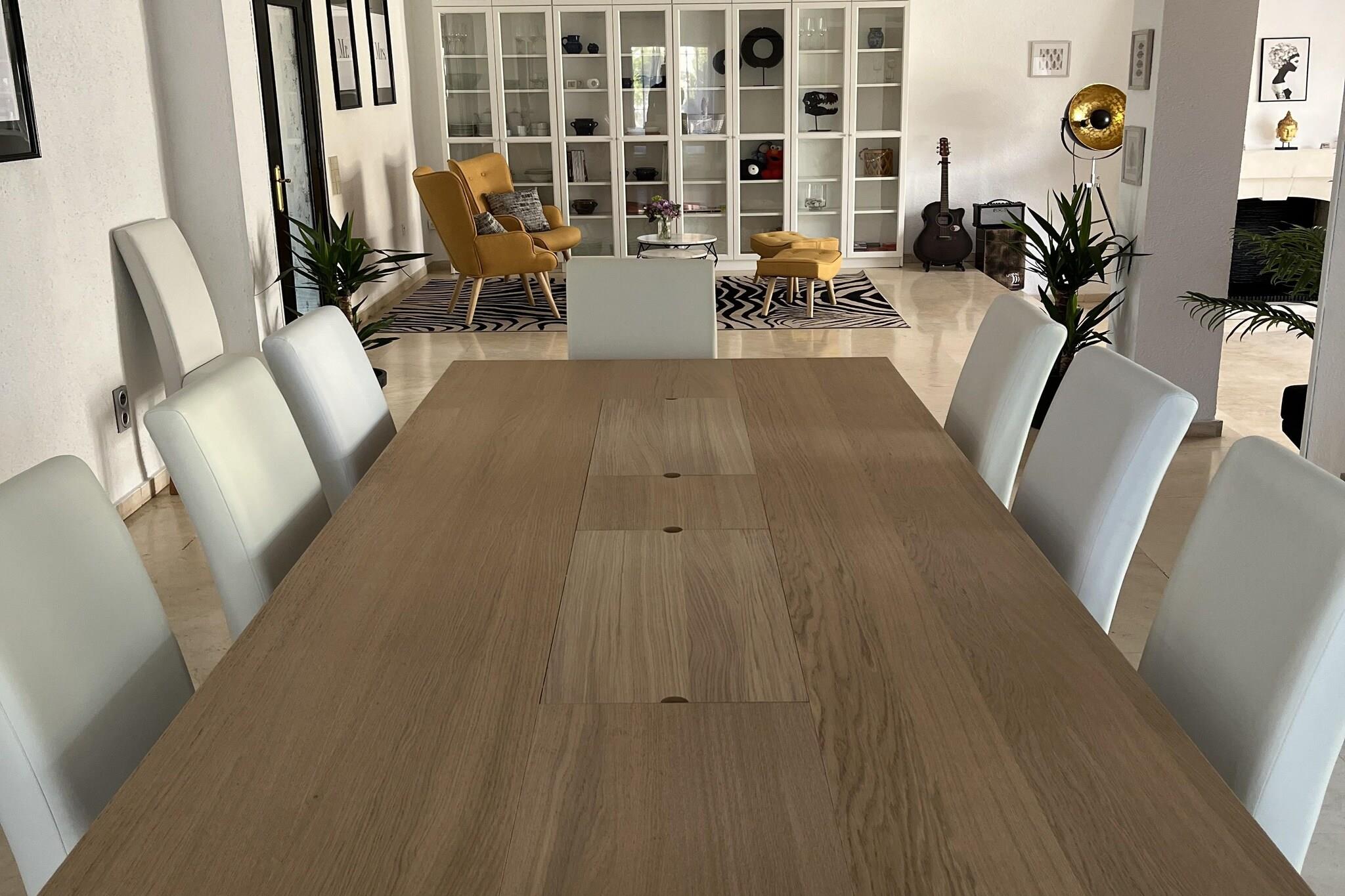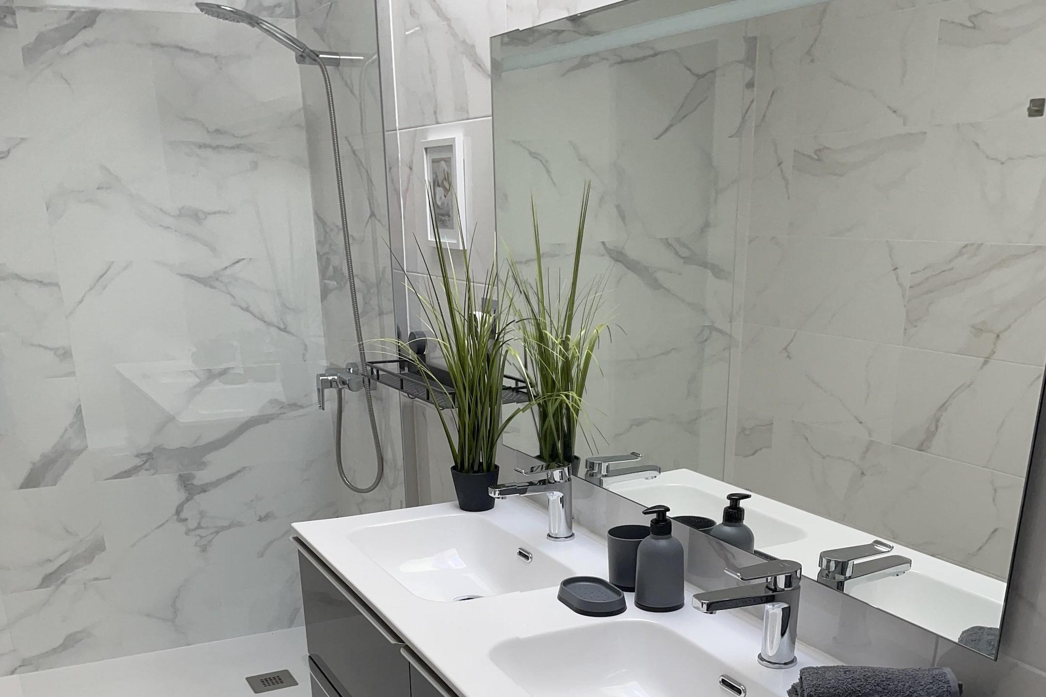 Ground floor: (Entrance(shared with other guests), Kitchen(hob, electric kettle, toaster, hood, coffee machine, oven, microwave, fridge-freezer), bedroom(single bed, single bed), Bedroom with bathroom(double bed, shower, washbasin, toilet), Bedroom with bathroom(double bed, bathtub with shower, washbasin, toilet), bathroom(shower, washbasin, toilet, hairdryer), fitness room(fitness equipment), heating, air conditioning, terrace) On the 1st floor: (bedroom(double bed), recreation room(play equipment), air conditioning, roof terrace, heating) washing room(tumble dryer, washing machine, ironing board, iron), garage(reachable from the outside), garden doors, parking lot(public), swimming pool(shared with other guests, outside, including part for children (depth 50cm), opened from Jan upto and including Dec)