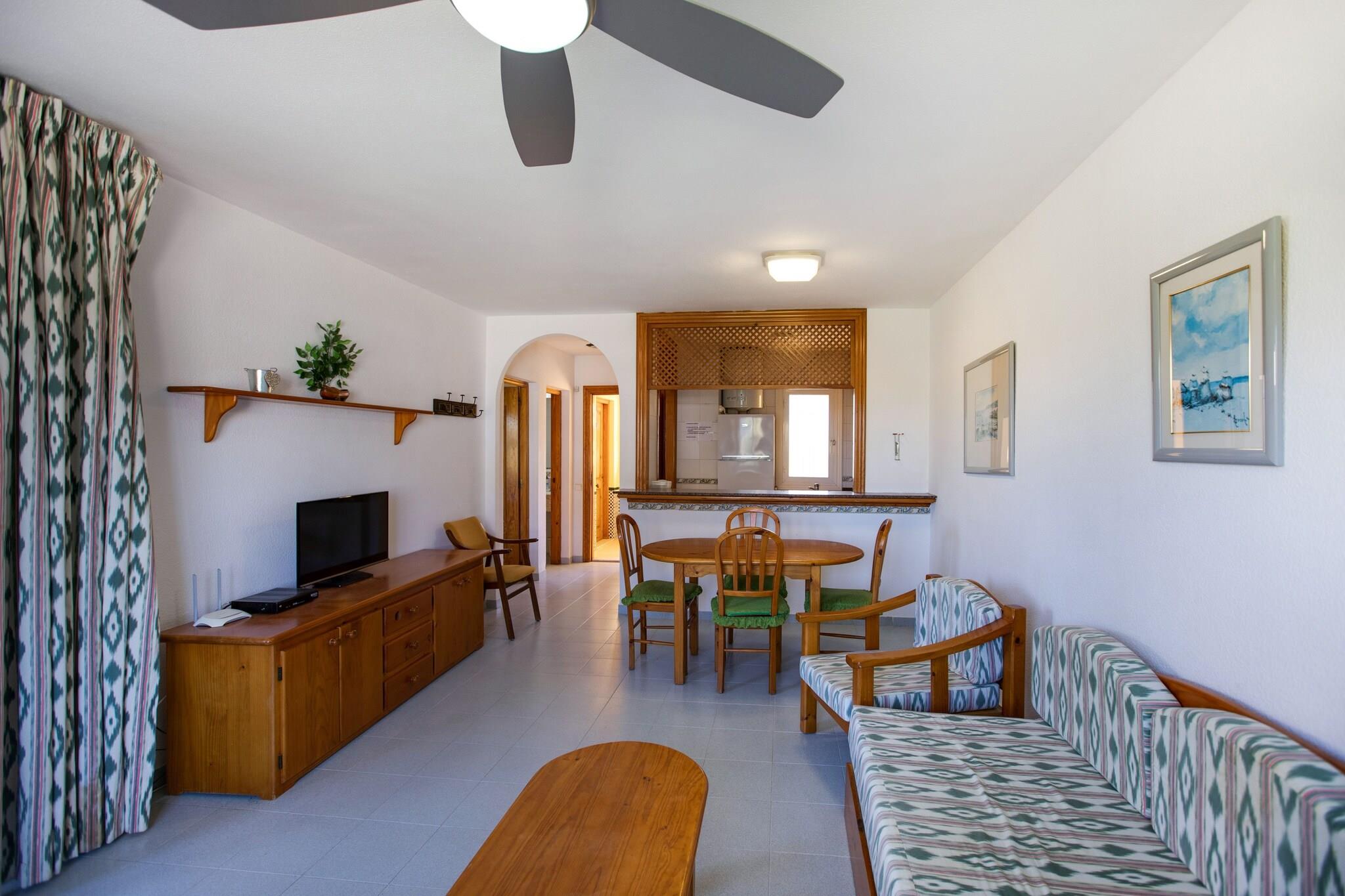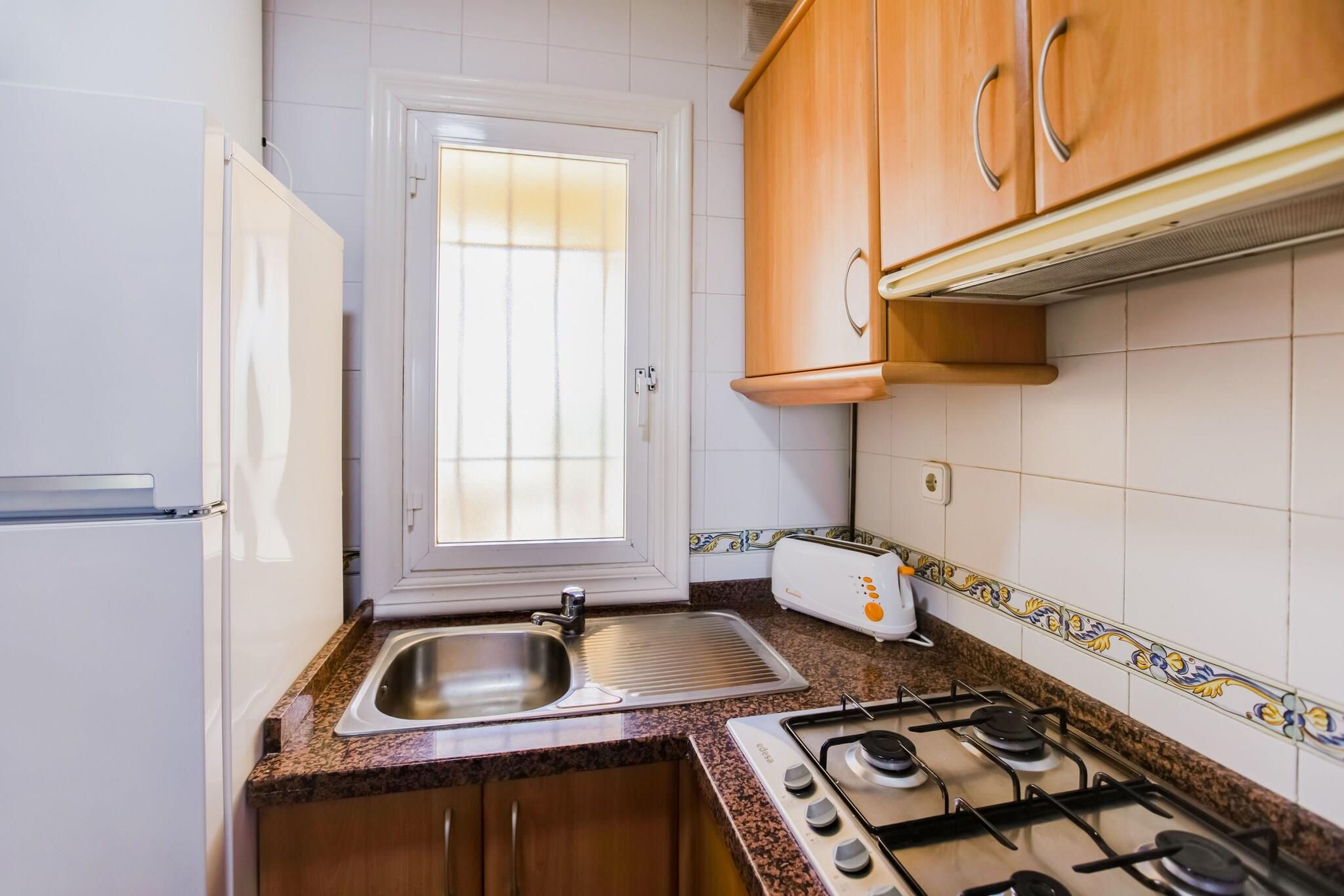 This comfortable ground-floor apartment in Roquetas de Mar is ideal for a small group or family of up to 4 guests. Just 400 meters from the beach, it offers easy access to sun, sand, and sea, perfect for a relaxing holiday by the Mediterranean. Inside, you’ll find an open kitchen fully equipped with a hob, toaster, coffee machine, microwave, fridge-freezer, and juicer, making meal prep a breeze. The living and dining area features air conditioning, a double sofa bed, and a dining table for four. The bedroom has two single beds, while the bathroom includes a bathtub or shower, washbasin, and toilet. Outside, enjoy your private terrace and access to shared garden spaces, a swimming pool, and a tennis court for recreation. Parking is available on-site. Located just 30 km from Almeria Airport, this apartment offers convenience and comfort for your coastal getaway.