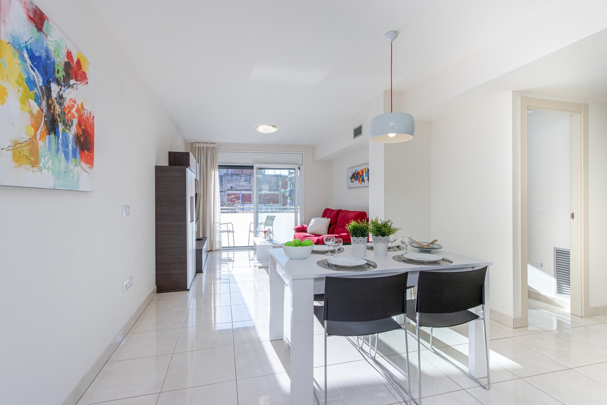 This modern family apartment in Roses offers a comfortable stay for up to 5 guests, featuring two well-appointed bedrooms, one with a double bed and another with twin beds, plus an additional sleeping arrangement in the common area. Located on the second floor with elevator access, the 70 m² space includes a private balcony, ideal for relaxing after a day at the beach. Air conditioning throughout, central heating, and high-speed Wi-Fi ensure year-round comfort. Covered parking in a nearby building is also included. Just 150 meters from the sandy beach "de la Punta" and within walking distance to supermarkets, cafés, and restaurants, this apartment offers a prime location for families and travelers looking to enjoy the Costa Brava. Local attractions like the Aquabrava water park are a short drive away, while golf lovers will appreciate the nearby Peralada Golf Course. Figueres AVE/TGV train station is just 30 km away, and Girona Airport is within 70 km, making travel connections convenient. Guests can enjoy a fully equipped open-plan kitchen with a ceramic hob, oven, dishwasher, and coffee maker, as well as a modern bathroom with a walk-in shower. Additional amenities include a washing machine, satellite TV with multilingual channels, and an iron. Tourist tax and optional services are not included in the price. Please contact the agency to confirm seasonal check-in times.