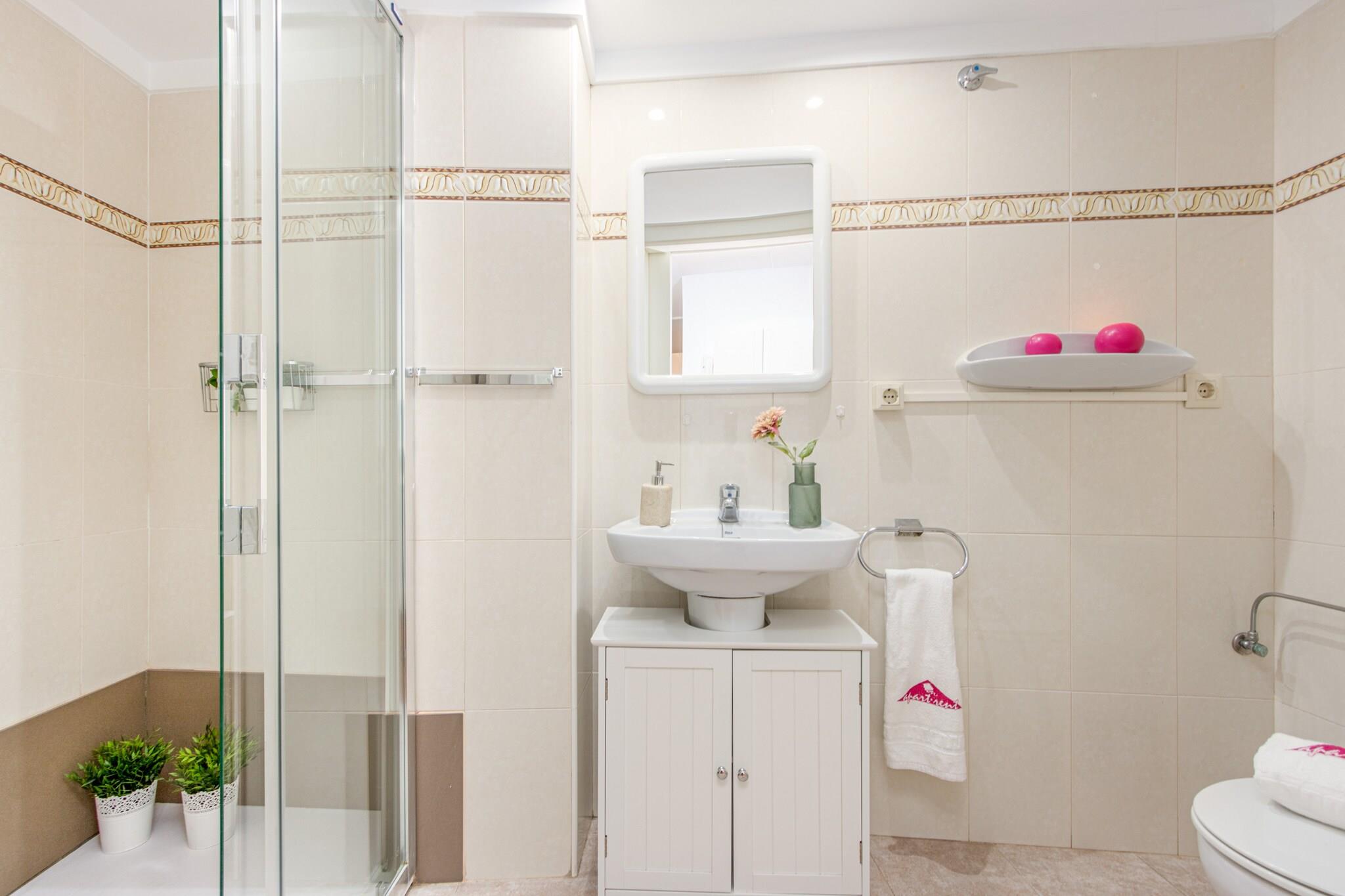 On the 1st floor: (open kitchen(hob(ceramic), toaster, coffee machine, oven, microwave, dishwasher, fridge, freezer, dishes and cutlery), Living/diningroom(double sofa bed, TV, dining table, seating area), bedroom(double bed), bedroom(single bed, single bed), bedroom(single bed, single bed), bathroom(shower, washbasin, toilet), bathroom(shower, shower, washbasin)) Elevator, washing machine, air conditioning, terrace, parking, iron, air to air heatpump, Sea view