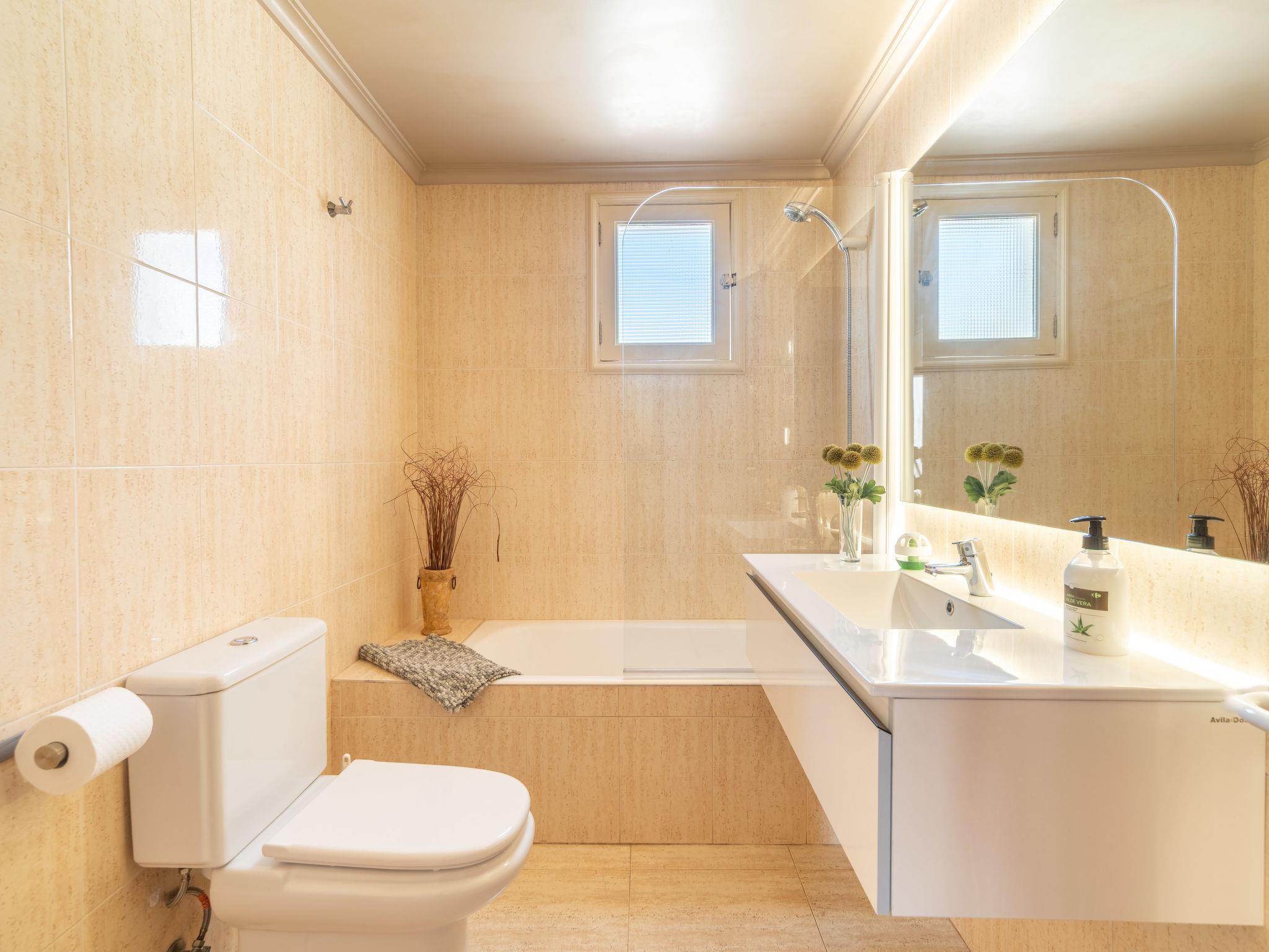 "Villa Can Rosito", 5-room apartment 192 m2 on 2 levels. Object suitable for 4 adults + 2 children. Spacious and bright, simple and comfortable furnishings: living/dining room with satellite TV, air conditioning and forced-air heating. Exit to the garden, to the terrace. 1 double bedroom with 1 french bed (1 x 150 cm, length 200 cm), shower/WC, satellite TV and fan. 1 double bedroom with 1 french bed (1 x 150 cm, length 200 cm), fan. 1 double bedroom with 2 beds (90 cm, length 190 cm), fan. Kitchen (oven, dishwasher, 4 gas rings, toaster, kettle, microwave, electric coffee machine) with dining table. Bath/WC. Upper floor: large lounge with satellite TV. Exit to the terrace. Natural stone floors. Terrace furniture, barbecue, deck chairs (6), sitting area. Panoramic view of the sea. Facilities: washing machine, iron, children's high chair, baby cot for up to 2 year olds, hair dryer. Internet (WiFi, free). Garage on the property. Please note: suitable for families apartment street side. Non-smokers only. ETV/8376 // Reg. Nr.: ESFCTU00000702300041278200000000000000000000ETV/83766