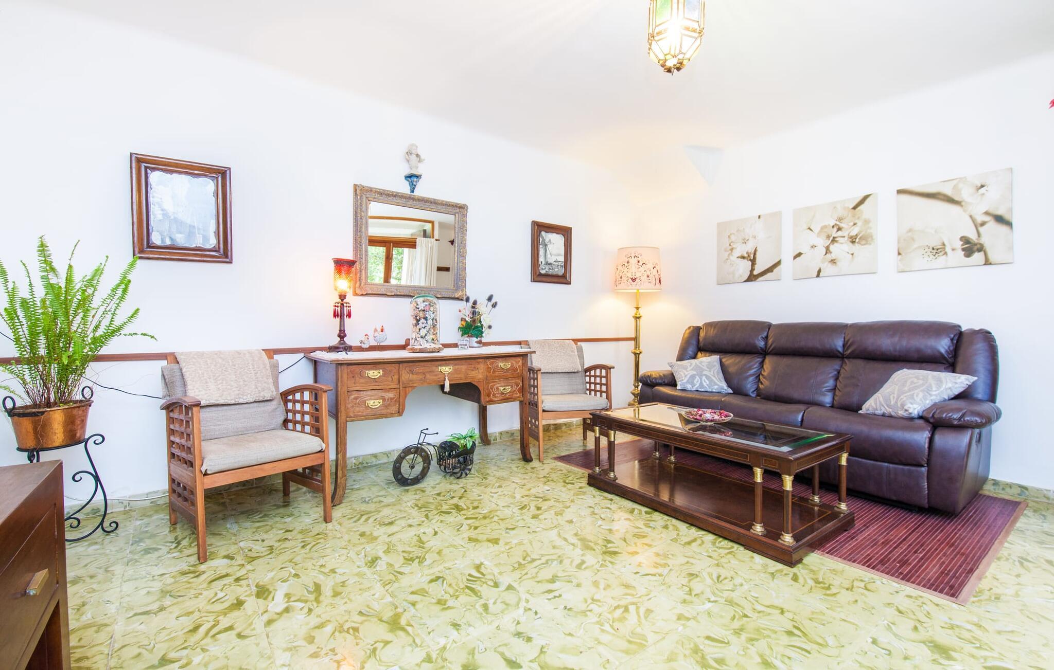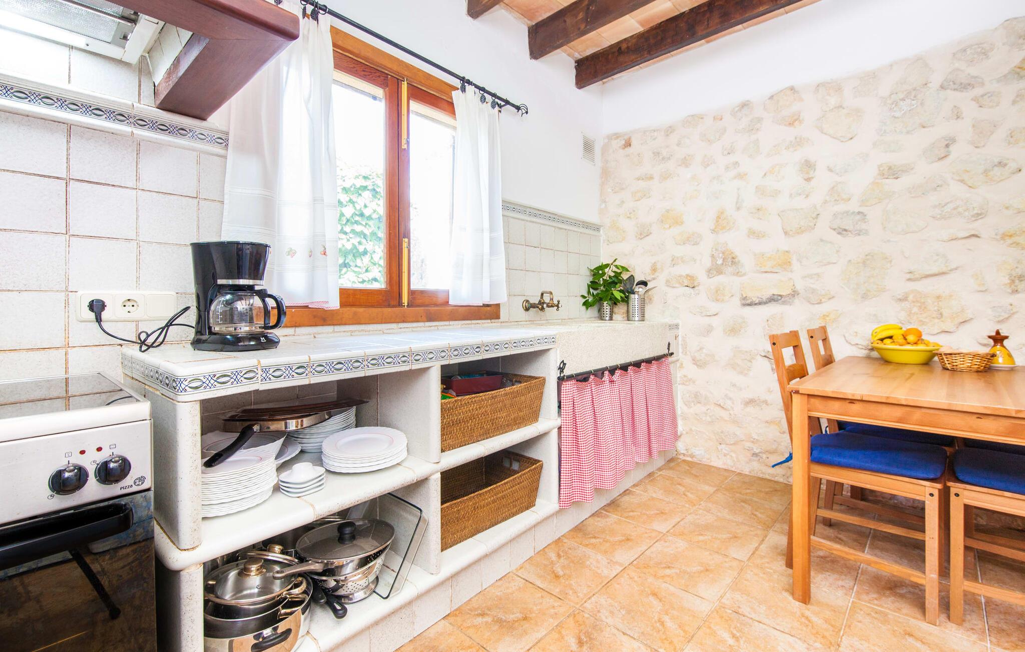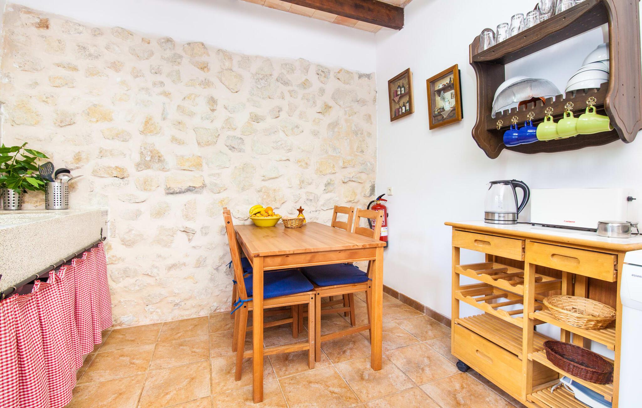 Das Innere der Villa „Sa Caseta den Tronca“ ist sehr rustikal eingerichtet. Im Wohnzimmer gibt es ein gemütliches Ledersofa und einen alten Holzofen, der in Kombination mit der eingebauten Heizung für wohlige Wärme und eine angenehme Atmosphäre in den Wintermonaten sorgt. Auch die Einrichtung dieses Raumes ist überwiegend traditionell gehalten. Vom Wohnzimmer führt eine Tür in die Küche, die mit einer offenen Natursteinwand und einem kleinen Esstisch ausgestattet ist. Im Erdgeschoss finden Sie außerdem ein Schlafzimmer mit Doppelbett sowie ein Badezimmer. Die freigelegten Holzbalkendecken und die klassische Einrichtung sorgen für viel mallorquinisches Flair. Im Obergeschoss befinden sich zwei weitere Doppelschlafzimmer sowie ein Badezimmer mit freiliegender Natursteinwand, einem Doppelwaschbecken und einer Badewanne. Von hier oben gelangt man auch auf den Balkon des Hauses. Dort finden Sie eine Sitzecke, von der aus Sie den Blick über die Baumwipfel schweifen lassen und die Umgebung Ihres Ferienhauses in vollen Zügen genießen können.