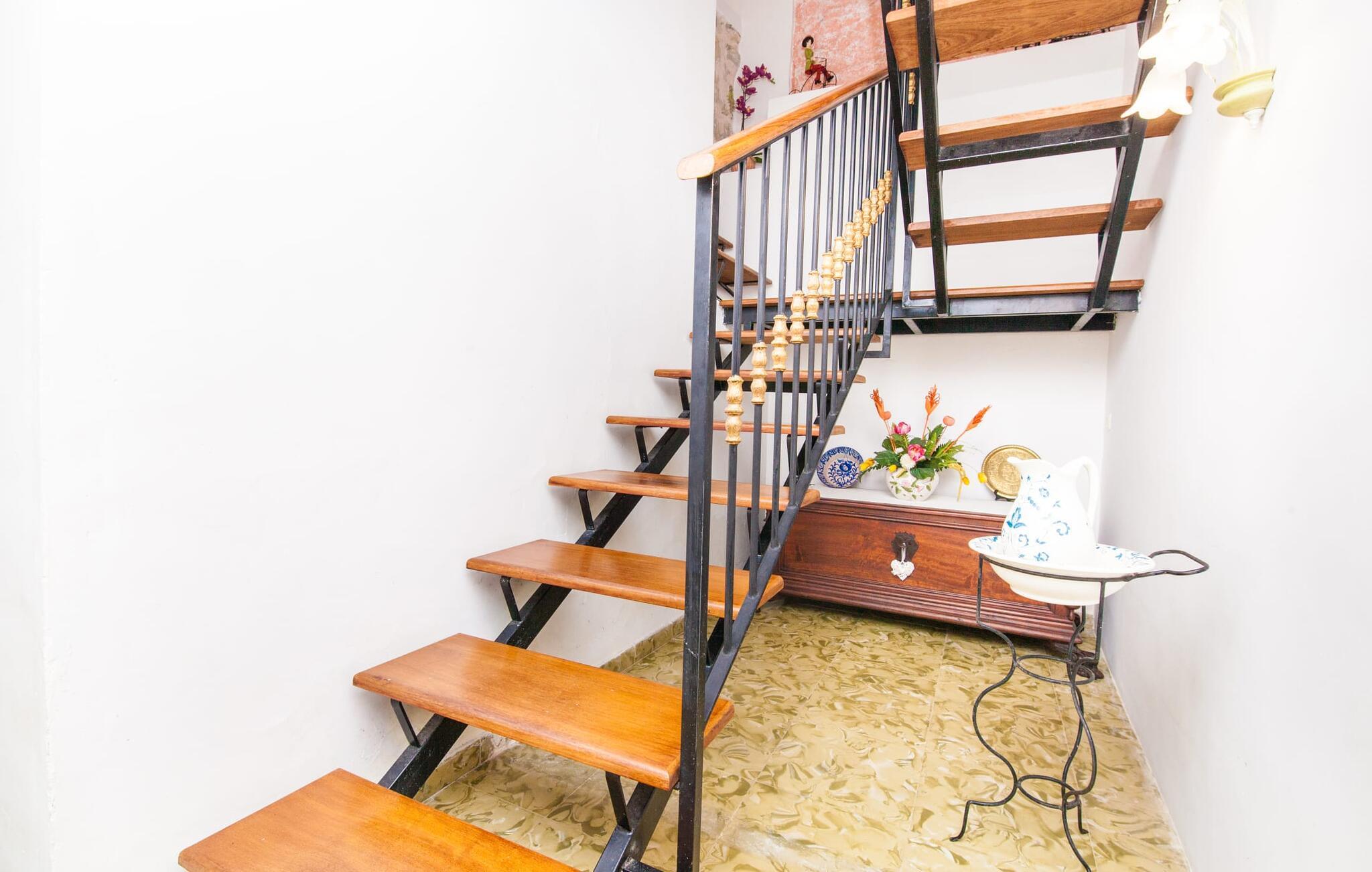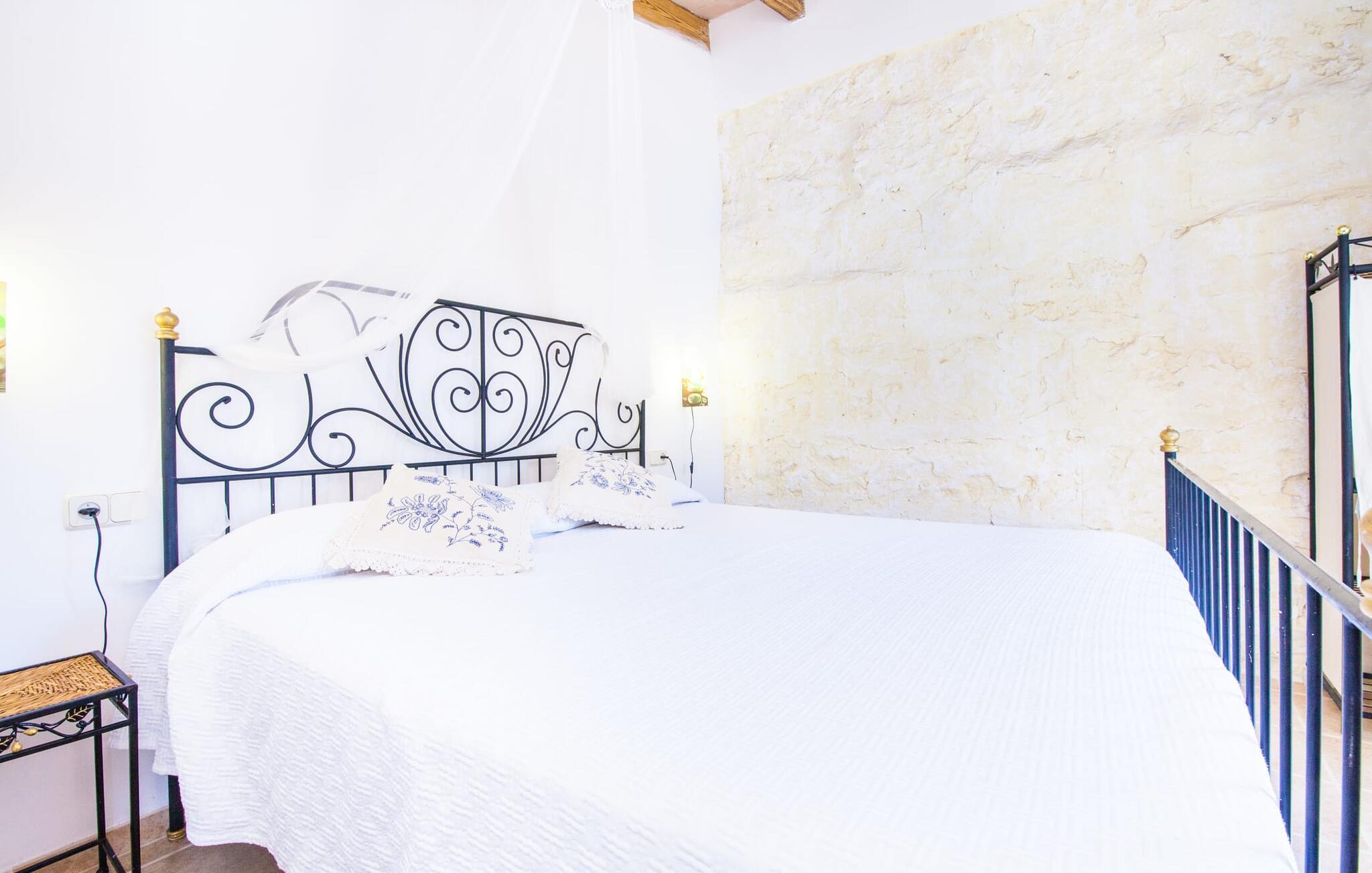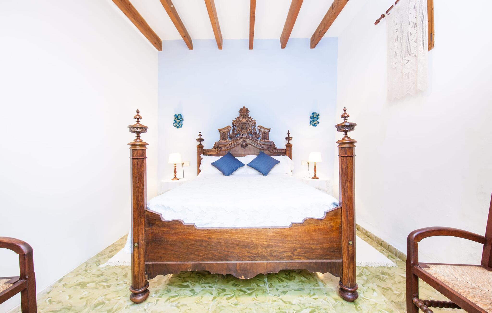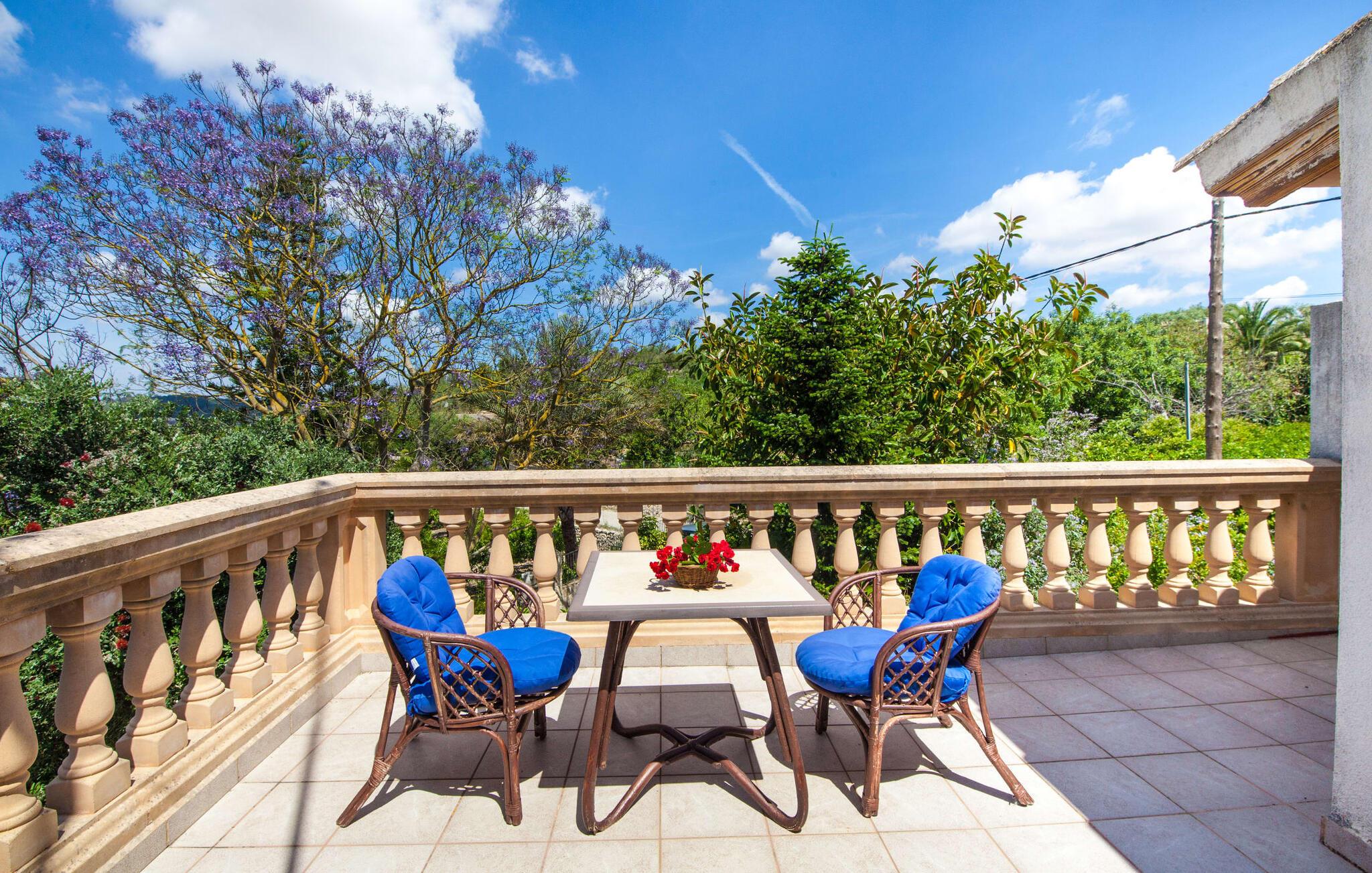 Das Innere der Villa „Sa Caseta den Tronca“ ist sehr rustikal eingerichtet. Im Wohnzimmer gibt es ein gemütliches Ledersofa und einen alten Holzofen, der in Kombination mit der eingebauten Heizung für wohlige Wärme und eine angenehme Atmosphäre in den Wintermonaten sorgt. Auch die Einrichtung dieses Raumes ist überwiegend traditionell gehalten. Vom Wohnzimmer führt eine Tür in die Küche, die mit einer offenen Natursteinwand und einem kleinen Esstisch ausgestattet ist. Im Erdgeschoss finden Sie außerdem ein Schlafzimmer mit Doppelbett sowie ein Badezimmer. Die freigelegten Holzbalkendecken und die klassische Einrichtung sorgen für viel mallorquinisches Flair. Im Obergeschoss befinden sich zwei weitere Doppelschlafzimmer sowie ein Badezimmer mit freiliegender Natursteinwand, einem Doppelwaschbecken und einer Badewanne. Von hier oben gelangt man auch auf den Balkon des Hauses. Dort finden Sie eine Sitzecke, von der aus Sie den Blick über die Baumwipfel schweifen lassen und die Umgebung Ihres Ferienhauses in vollen Zügen genießen können.