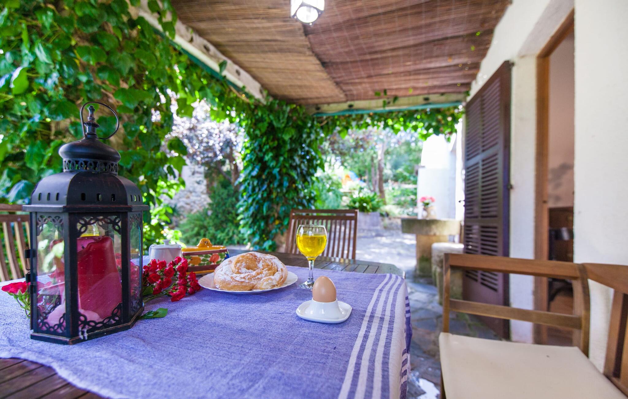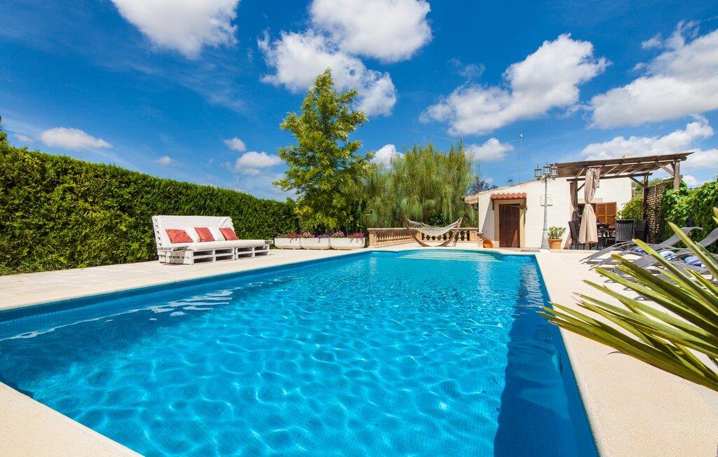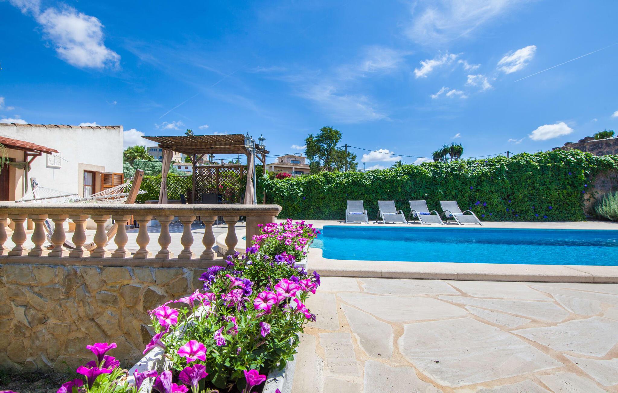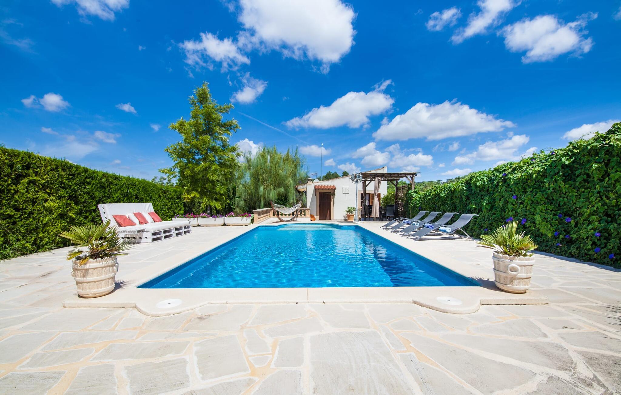 Die Villa „Sa Caseta den Tronca“ wird Sie mit ihrem prächtig gestalteten Außenbereich begeistern. Alles ist wunderschön bepflanzt, jeder Zentimeter ist grün und blüht. Schon von außen vermittelt die Villa einen rustikalen und authentischen Eindruck. Die Wasserstellen sind teilweise mit farbenfrohen Mosaiken verziert und durchgängig mit Naturstein durchzogen. Vor dem Haus gibt es eine überdachte Terrasse und einen Grillplatz, wo Sie köstliche Köstlichkeiten zubereiten können. Ein weiteres Highlight des Außenbereichs ist der herrliche Pool. Ein Sprung ins kalte Wasser ist an heißen Sommertagen eine sichere Erfrischung. Darüber hinaus stehen Ihnen in und rund um die Villa zahlreiche Optionen zur Verfügung, wenn es darum geht, einen Ort zum Entspannen zu finden. Sie können sich auf den Liegestühlen zurücklehnen, in der Chill-out-Lounge entspannen oder in der Hängematte Ihre Sorgen hinter sich lassen. Wenn Sie es lieber schattig mögen, gibt es auch eine kleine überdachte Terrasse mit Sitzecke am Pool. Und mit einem eigenen Spielplatz mit Schaukel und Rutsche sind auch die Bedürfnisse der mitreisenden Kleinen bestens berücksichtigt.