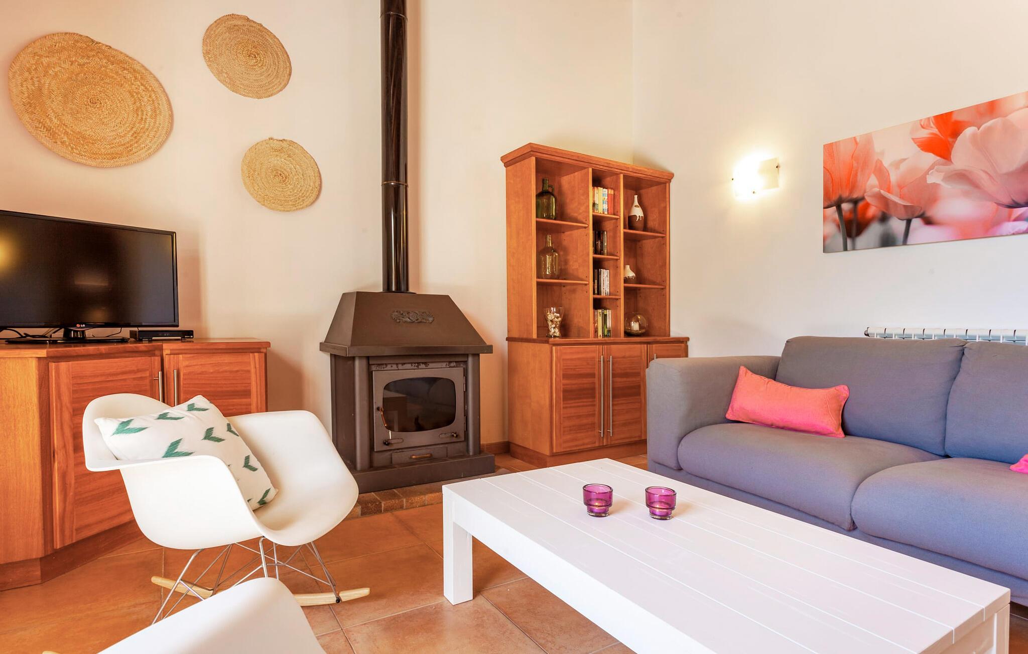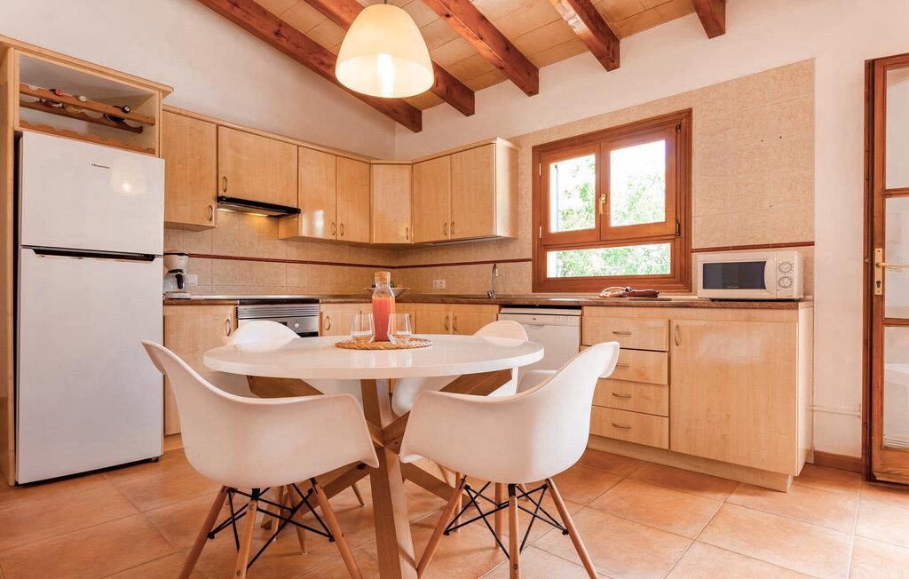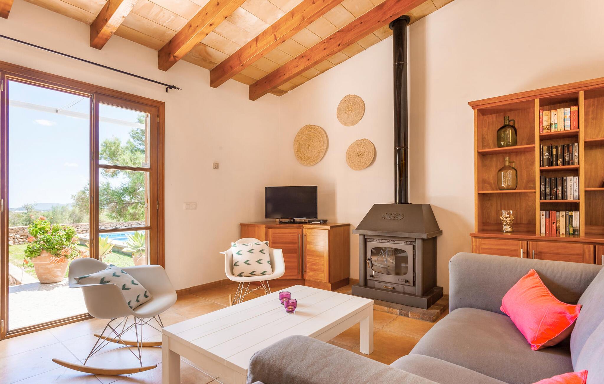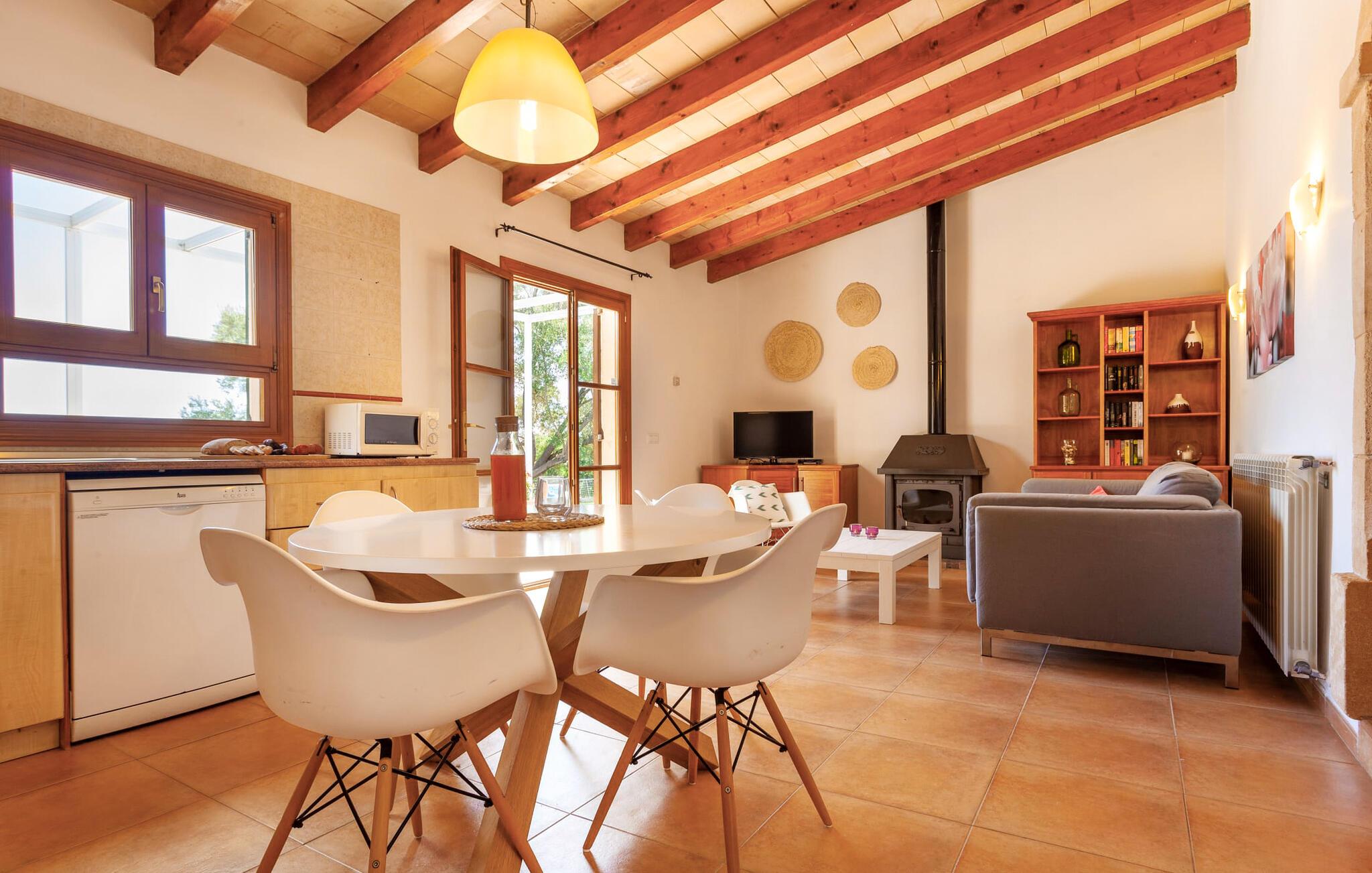 Im Inneren strahlt die Villa Wärme und Komfort aus und verfügt über 80 m² moderne Wohnfläche. Das offene Wohnzimmer verfügt über einen Kamin und bietet einen schönen Rahmen für gemütliche Abende, während die voll ausgestattete Küche mit Esstisch ideal für Mahlzeiten im Innenbereich ist. Mit zwei gemütlichen Schlafzimmern und einem geräumigen Badezimmer ist es zum Entspannen gedacht. Helle Wände und hohe Holzbalkendecken verstärken die luftige Atmosphäre. "Sa Caseta“ wird oft von Paaren gewählt, die einen romantischen Kurzurlaub verbringen und die ruhige Lage genießen möchten. Nachts verleiht das beleuchtete Kloster San Salvador Ihrem Urlaub eine magische Note.