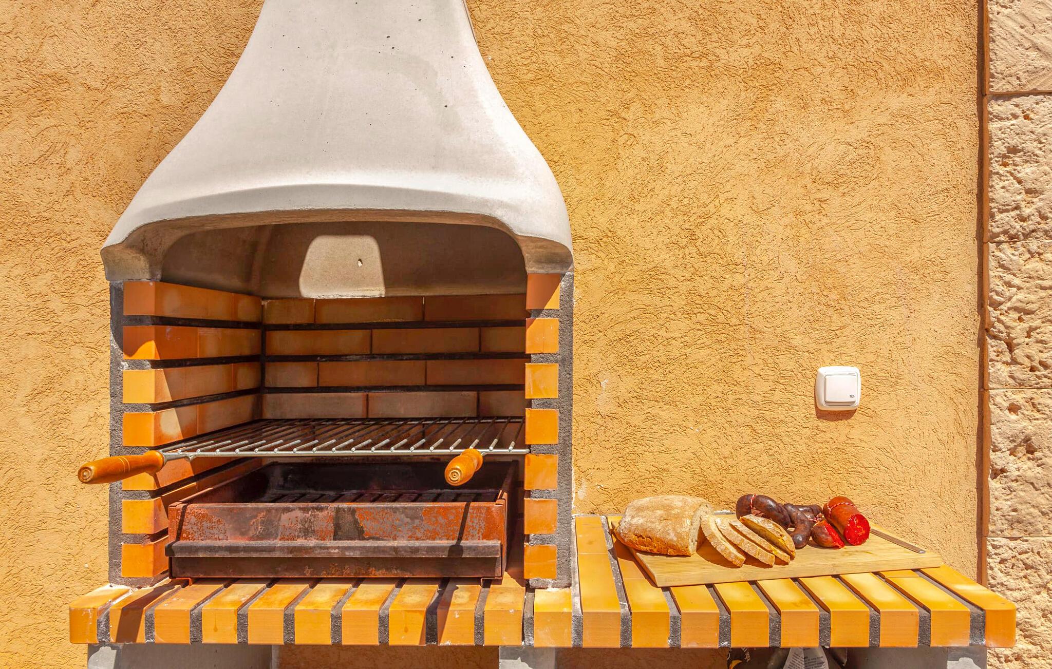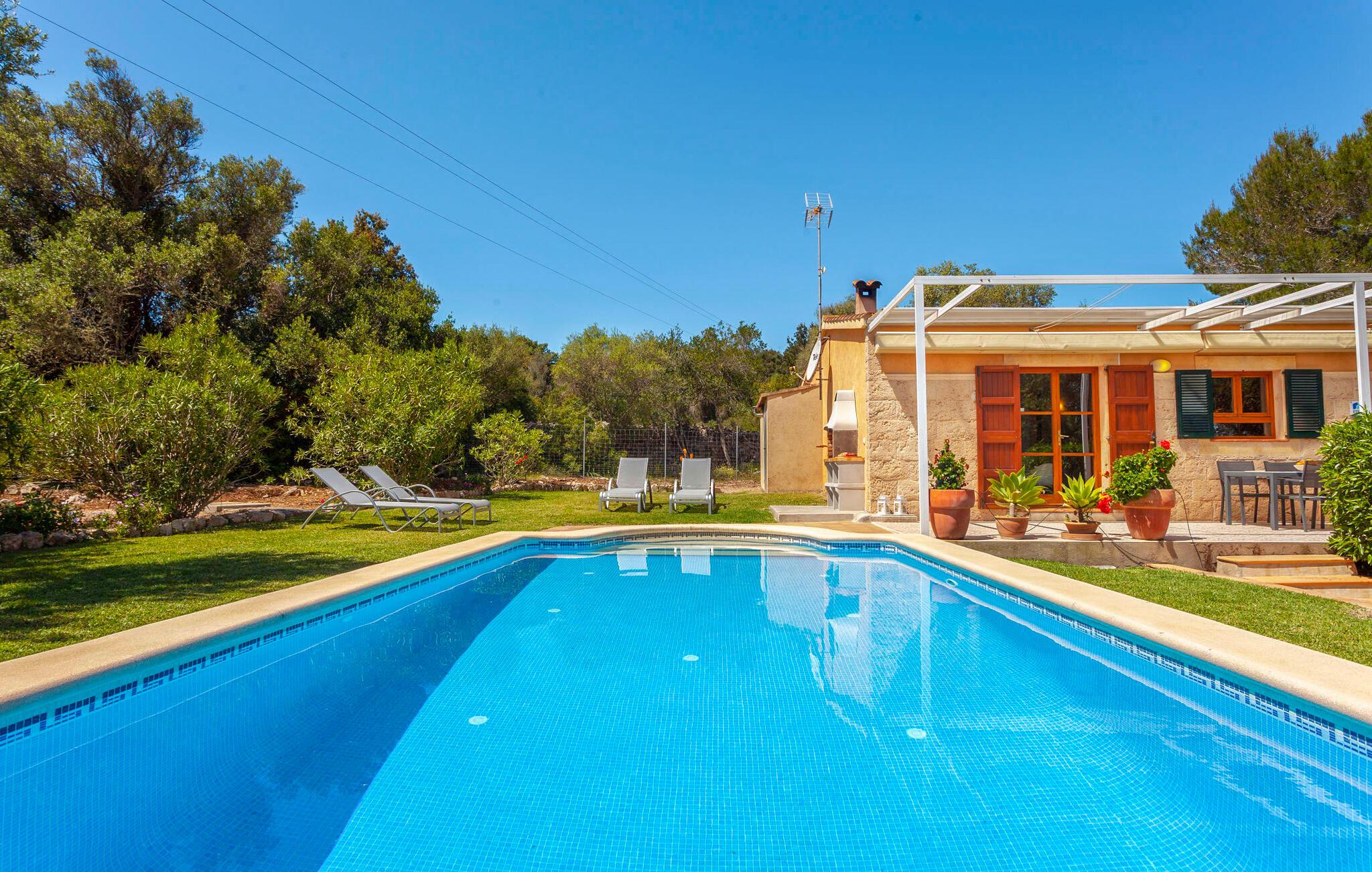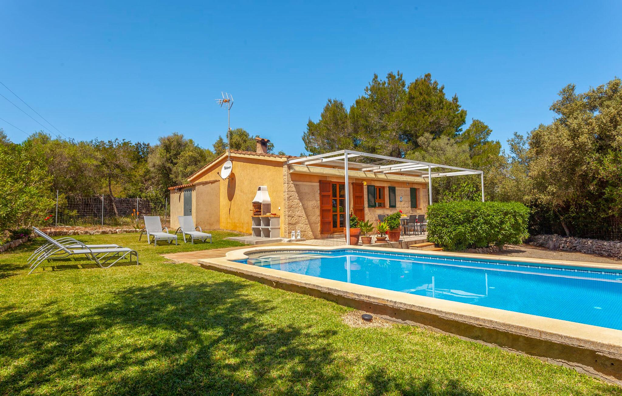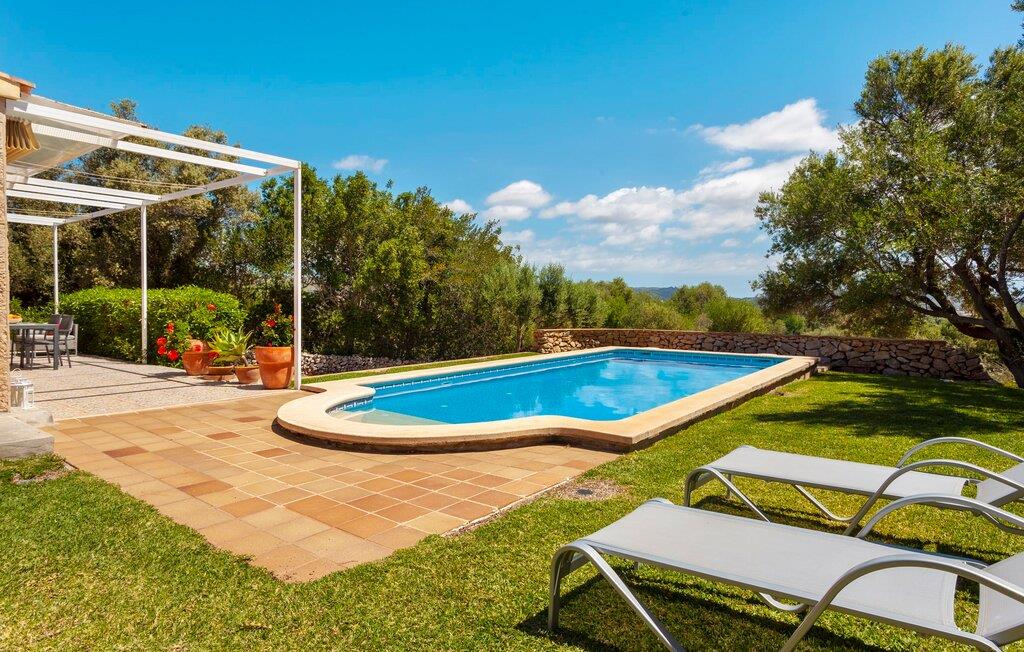 Im Inneren strahlt die Villa Wärme und Komfort aus und verfügt über 80 m² moderne Wohnfläche. Das offene Wohnzimmer verfügt über einen Kamin und bietet einen schönen Rahmen für gemütliche Abende, während die voll ausgestattete Küche mit Esstisch ideal für Mahlzeiten im Innenbereich ist. Mit zwei gemütlichen Schlafzimmern und einem geräumigen Badezimmer ist es zum Entspannen gedacht. Helle Wände und hohe Holzbalkendecken verstärken die luftige Atmosphäre. "Sa Caseta“ wird oft von Paaren gewählt, die einen romantischen Kurzurlaub verbringen und die ruhige Lage genießen möchten. Nachts verleiht das beleuchtete Kloster San Salvador Ihrem Urlaub eine magische Note.