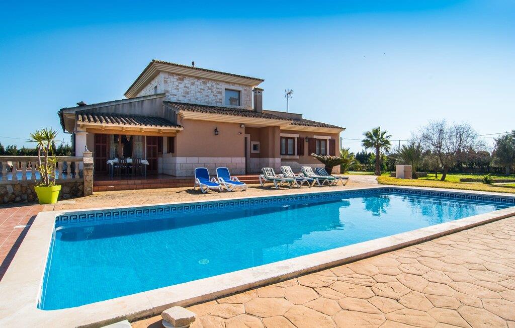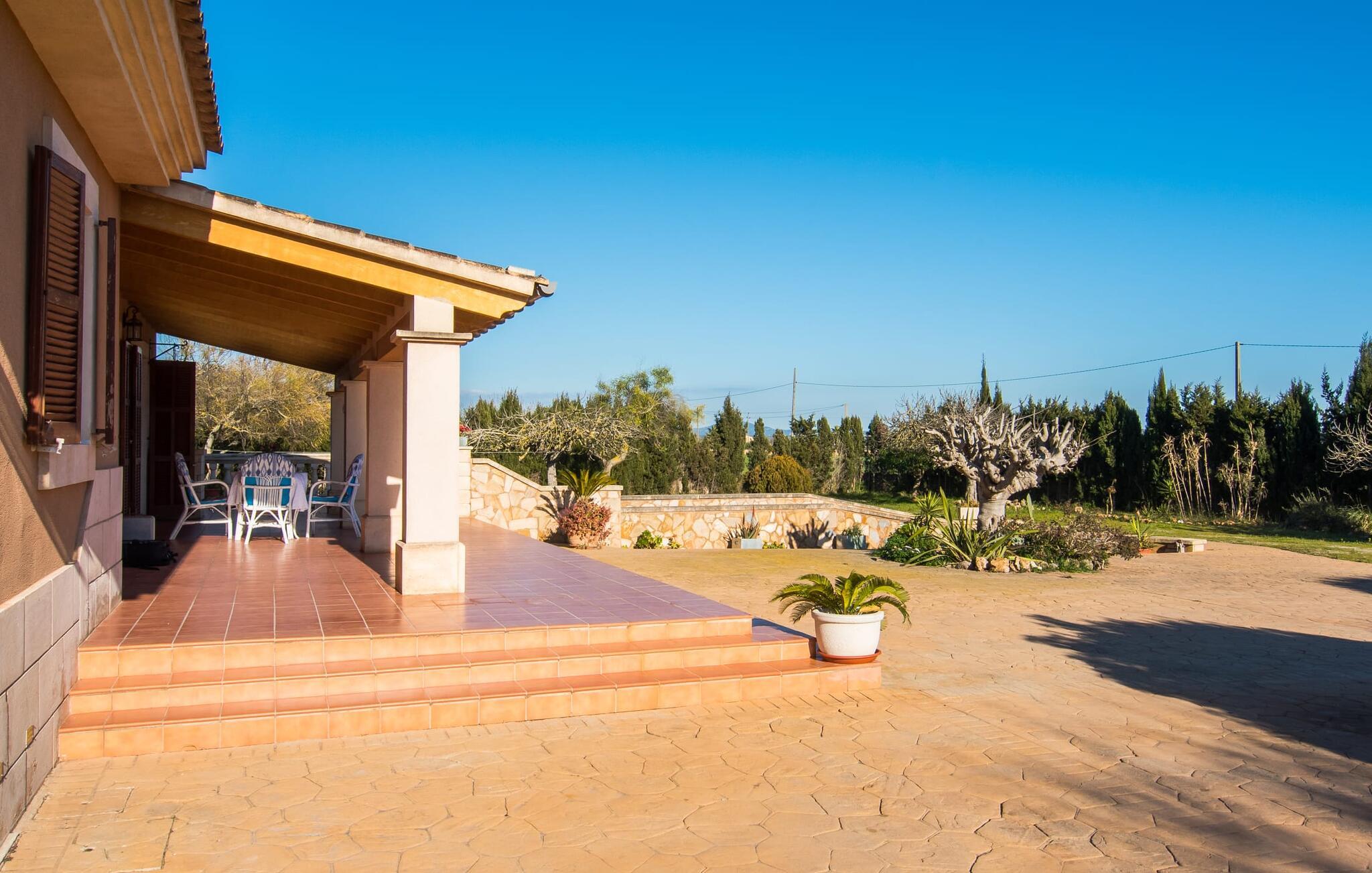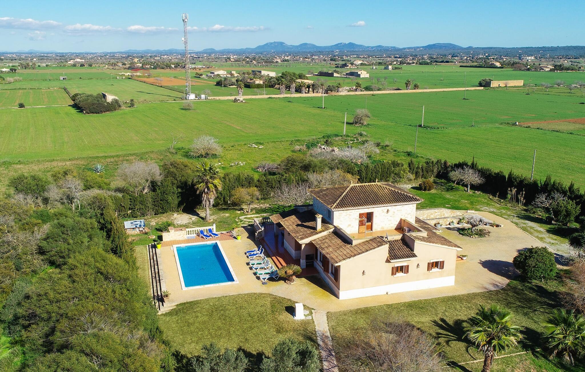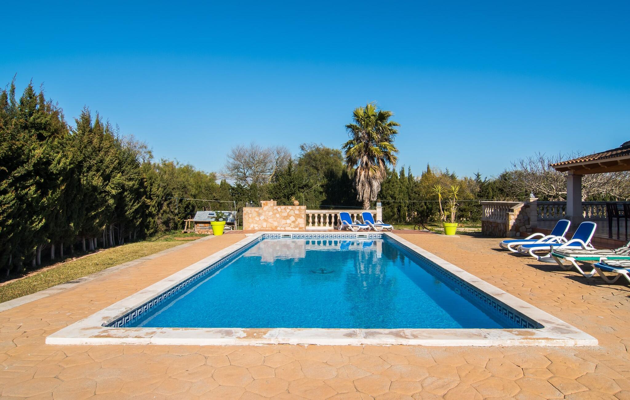 Komfortabel, geräumig und inmitten einer wunderschönen mediterranen Landschaft: Klingt nach einem fabelhaften Ferienhaus, nicht wahr? Vor allem, wenn Sie eine ruhige, ländliche Lage mit viel Privatsphäre schätzen. Die Villa „Sa Gravera de Sa Barrala“ liegt auf einem weitläufigen Anwesen mit liebevoll angelegtem Garten im Süden der Insel. Familien mit Kindern werden sich hier besonders wohl fühlen: Die Rasenflächen bieten Platz zum Spielen und der Pool am Haus lädt zum Planschen und Schwimmen ein. Von der überdachten Terrasse aus können Eltern ihre Kleinen im Auge behalten. Oder von einer der Sonnenliegen, die rund um das kühle Nass aufgestellt sind. Bewegung macht hungrig: Der Grill hilft Ihnen bei der Zubereitung allerlei Köstlichkeiten, die Sie am Esstisch mit Blick auf Garten und Pool genießen können. Auf einer weiteren überdachten Terrasse vor dem Haus gibt es außerdem eine Sitzecke, ideal für einen Kaffee zu jeder Tageszeit. Wenn Sie Sonne tanken möchten, können Sie sich auf die Dachterrasse im Obergeschoss begeben.