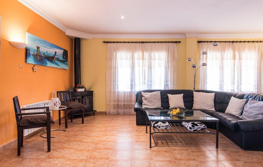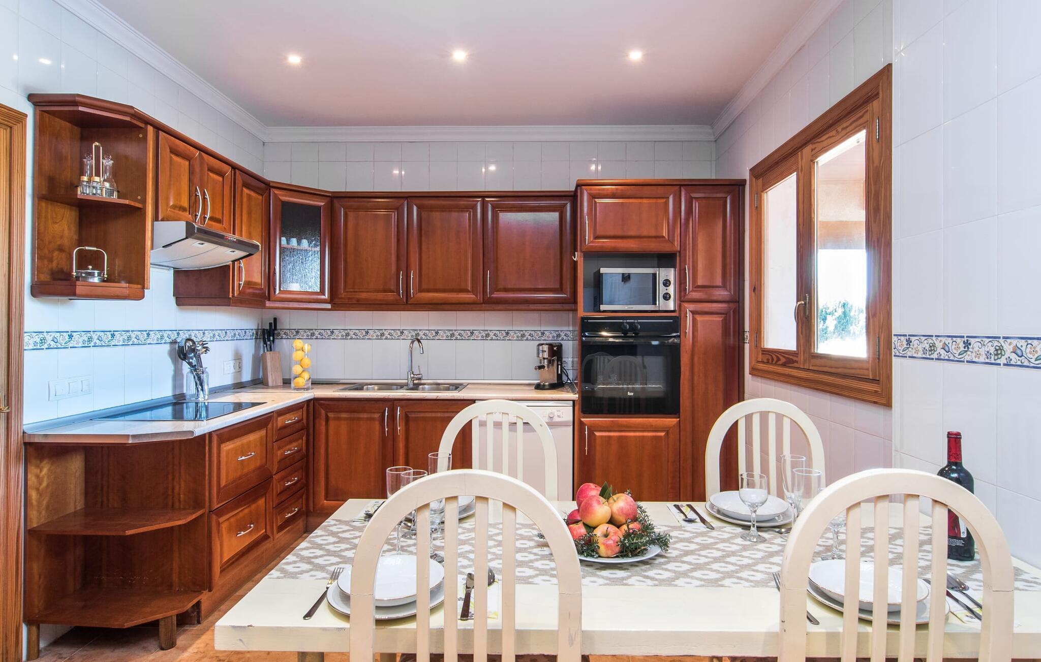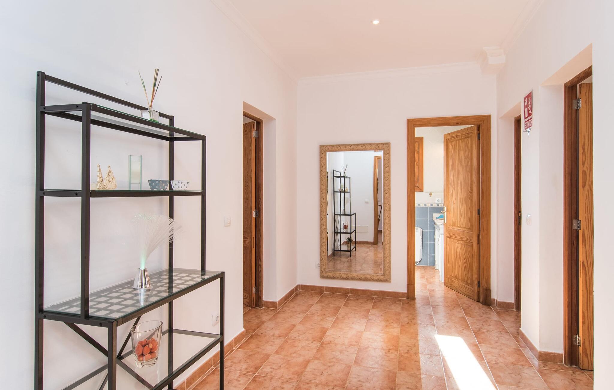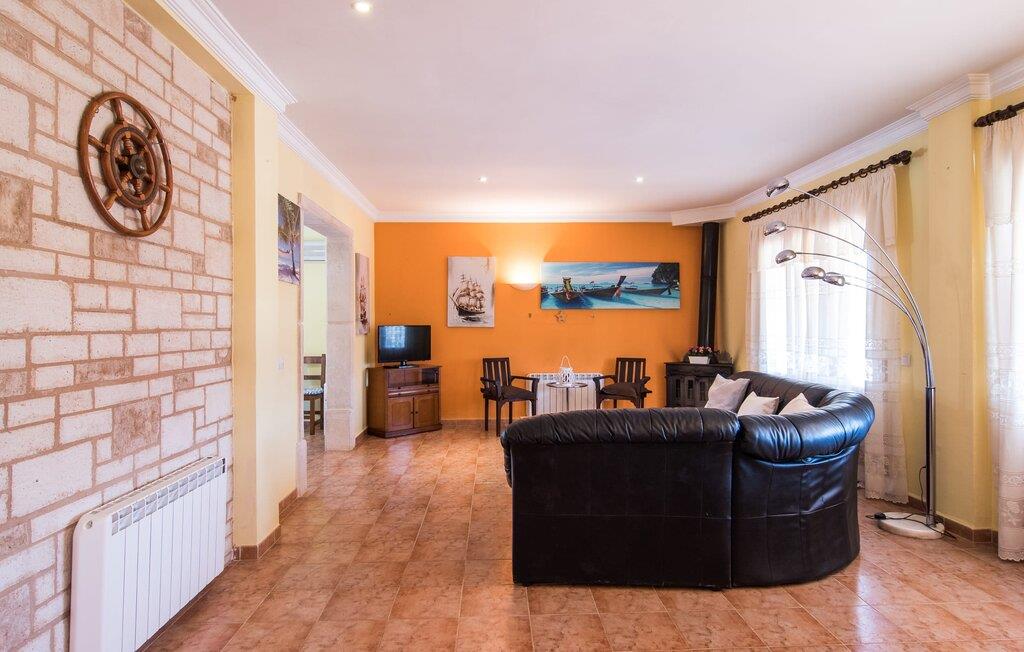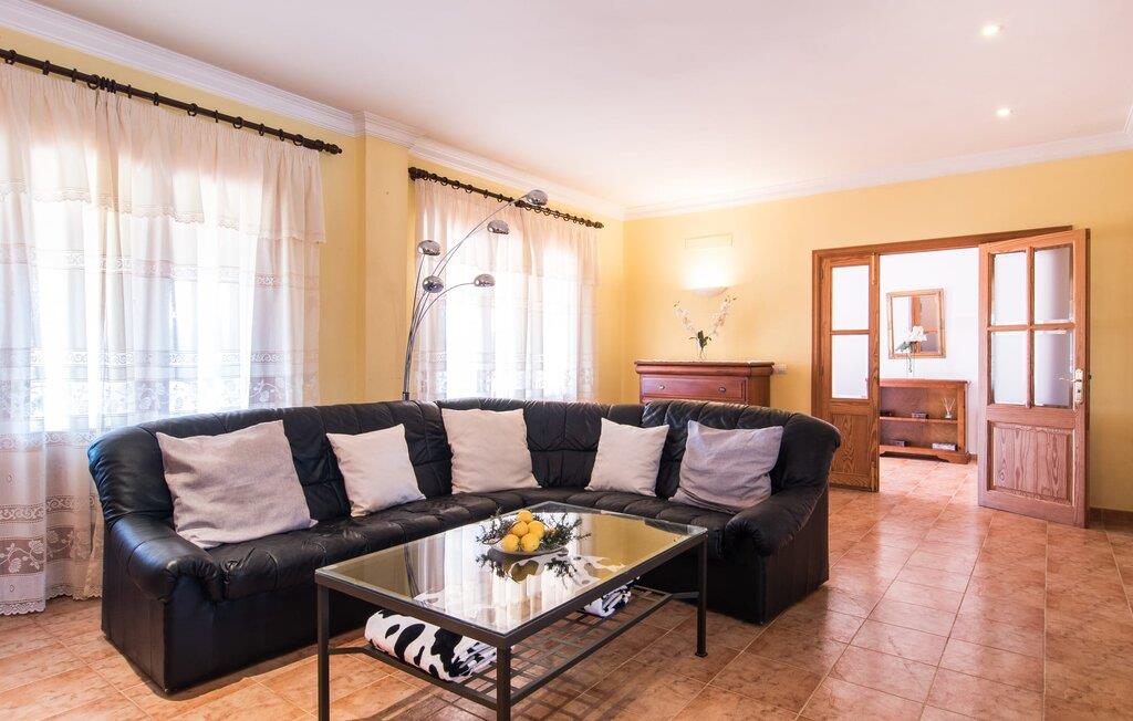 Das Innere der Villa ist hell und freundlich. Weiße und ein paar sonnengelbe Wände sorgen zusammen mit vielen kleinen Deckenlampen und großen Fenstern für eine sommerliche Leichtigkeit, die das ganze Haus durchdringt. Die Einrichtung ist eine Mischung aus praktischen, modernen und traditionell-rustikalen Elementen, sodass Sie sich sofort wie zu Hause fühlen werden. Im Erdgeschoss befinden sich der großzügige Eingangsbereich sowie das Wohnzimmer mit riesigem Sofa und Glastisch: perfekt für gemütliche Fernsehabende mit leckeren Snacks! Alternativ können Sie sich für ein gemeinsames Essen an den hölzernen Esstisch nebenan setzen, der viel Platz für die in der Küche zubereiteten Gerichte bietet. Sobald Sie satt sind und müde werden, können Sie sich einfach in eines der drei Doppelzimmer im Erdgeschoss oder in das andere Doppelzimmer im Obergeschoss zurückziehen. Alle Zimmer verfügen über aufwendig gestaltete Einzel- oder Doppelbetten aus Holz. Abgerundet wird der Wohnkomfort durch drei moderne Badezimmer, zwei davon im Erdgeschoss und ein En-Suite-Badezimmer im ersten Stock.