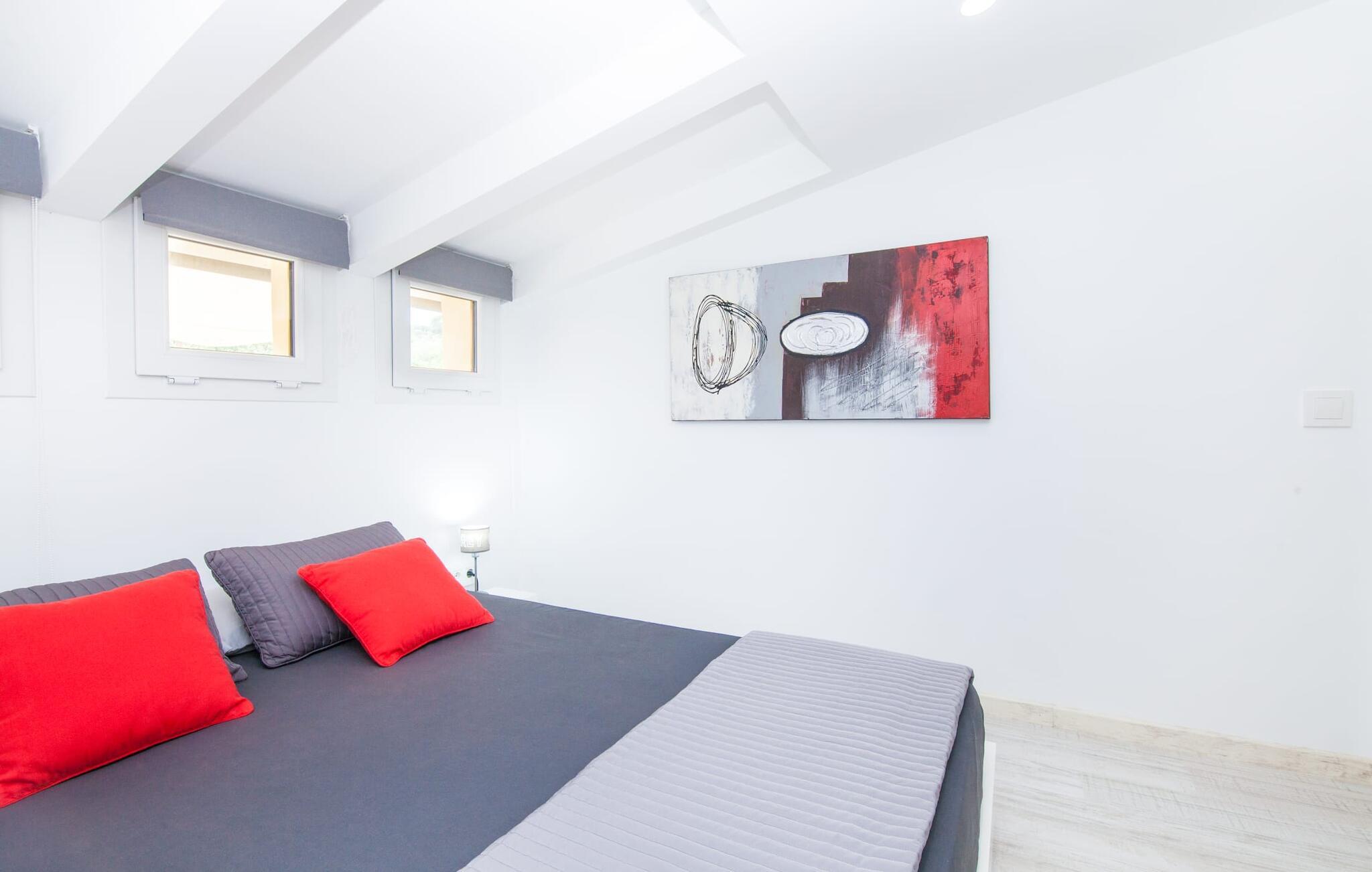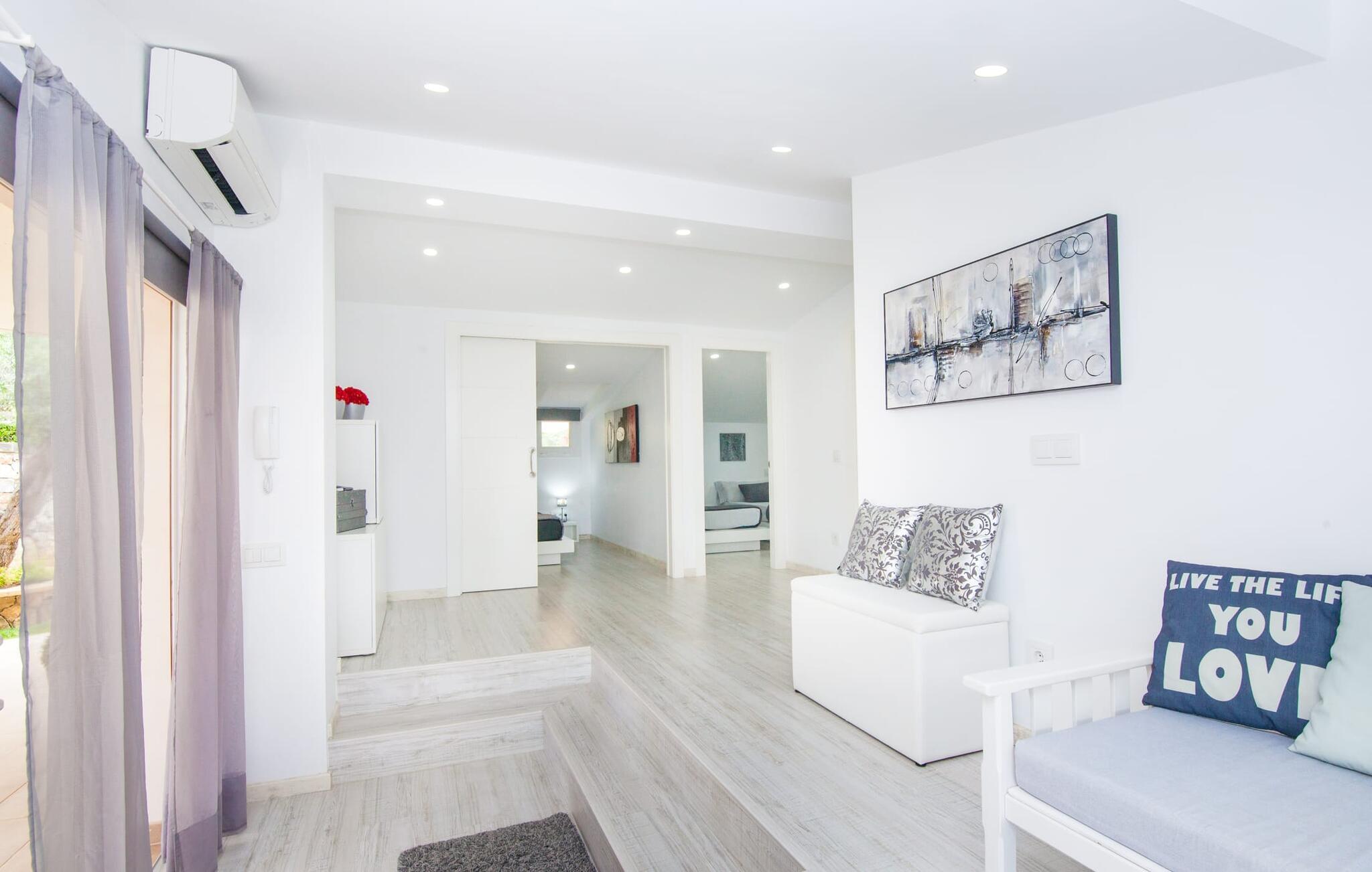 Währenddessen kann drinnen eine Partie Billard gespielt werden, was eine spielerische Alternative zu einem Fernsehabend vor dem Kamin bietet. Dank der Position des Billardtisches kann es bis spät in die Nacht zu Wettkämpfen kommen, ohne befürchten zu müssen, den Schlaf anderer zu stören. Das Besondere an dieser Villa ist die Tatsache, dass sie aus zwei völlig getrennten Bereichen besteht: Das Wohnzimmer mit Durchgang zur modernen Einbauküche macht das Grillen im Freien zu einem überdachten Abenteuer. Gegenüber finden Sie den Grundstücksbereich mit den drei puristisch gestalteten Schlafzimmern. Hinter der Lounge führt eine Glastür zu einer Treppe, die Sie wiederum in einen Vorraum mit Sitzgelegenheiten führt. Dahinter warten zwei Doppelbetten und zwei Einzelbetten darauf, bezogen zu werden. Jedes der Betten lässt Sie garantiert ganz in Weiß träumen. Drei gemütliche Badezimmer mit Waschmaschine und Duschen bzw. Duschwannen können unter Ihnen aufgeteilt werden – eines im rechten und eines im linken Flügel des Hauses, sowie ein Außenbad, sodass Sie bei Bedarf keine langen Wartezeiten haben Höre eines Morgens die Berge, die deinen Namen rufen.