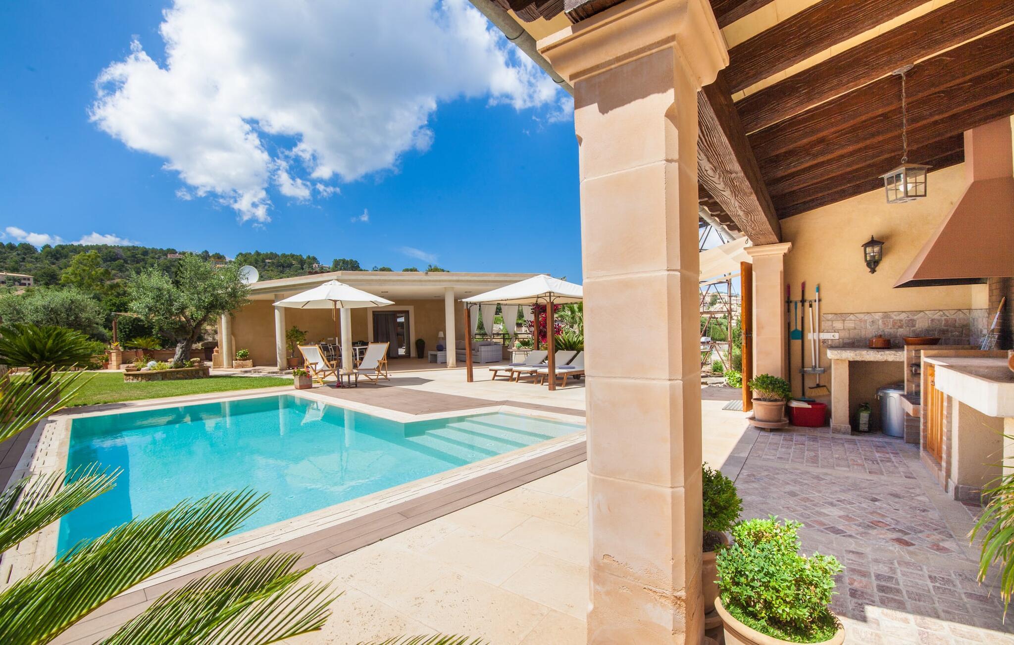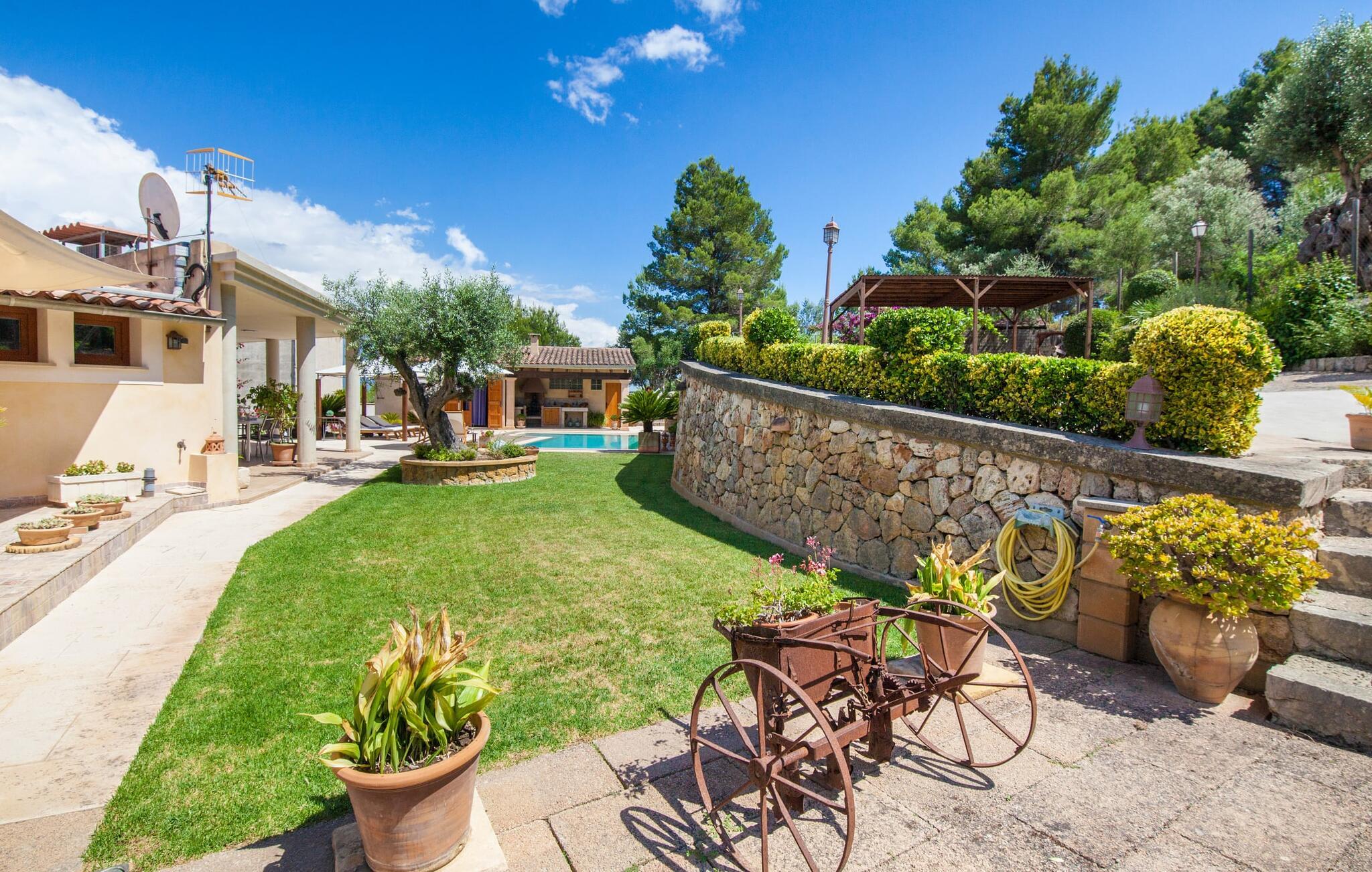 Für diejenigen unter Ihnen, die die raue Berglandschaft und die traditionsreichen Dörfer Mallorcas bevorzugen, ist diese Villa perfekt gelegen: Das Wandergebiet rund um das Heiligtum von Lluc ist leicht zu erreichen, es gibt einen guten Blick auf die markante gotische Kirche, die Selva überblickt , und die Autos, die auf dem Parkplatz, der etwas unter der Erde liegt, warten, sind immer bereit, in Aktion zu treten. Mit dem Gepäck in der Hand führt Sie eine breite Treppe direkt hinauf zum gepflegten Pool. Dies bildet die „goldene Mitte“ – die perfekte Position zwischen den beiden Gebäuden, aus denen das Grundstück besteht. Hier finden Sie Klappstühle und Sonnenliegen für eine kleine Verschnaufpause im Schatten. Unter dem weitläufigen Flachdach des Schlafbereichs können Sie es sich (und Ihre Familie) ganz einfach auf dem gut gepolsterten Rattansofa bequem machen, mit windgeschütztem Rücken und Blick auf das üppige Grün vor sich. Drüben in der Außenküche kann der Grill sicher angefeuert werden. Mit seinen knorrigen Olivenbäumen, Pflanzkübeln, Bougainvilleen und Chamaerops ist der Garten wirklich eine Augenweide. Es bietet auch viel Platz für angenehme Abende unter freiem Himmel, einen ruhigen Rückzugsort mit einem guten Buch und jede Menge Tischtennisspiele. Ein wichtiger Hinweis für diejenigen mit Kindern: Der dekorative Metallturm auf dem Gelände ist ein Überbleibsel aus dem Bergbau und kein Klettergerüst.
