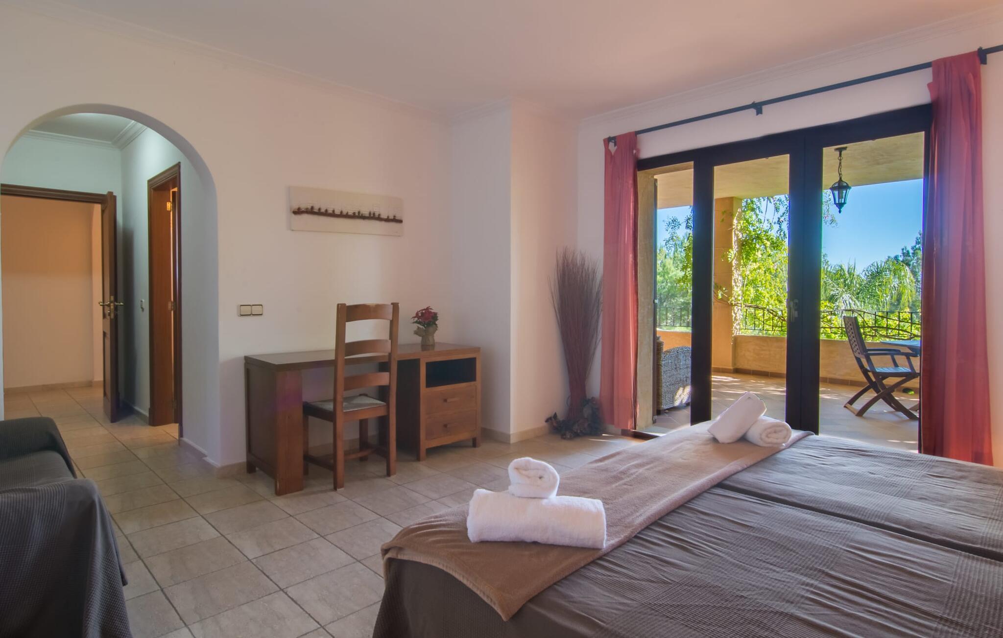 Ihr Ferienhaus ist im typisch mallorquinischen Stil eingerichtet, geschmackvoll kombiniert mit modernen Elementen. Hochwertige rustikale Holzmöbel werden durch schicke, schlichte Lampen und zeitgenössische Kunst an den Wänden ergänzt. Im gesamten Haus dominieren die Farben der Natur – passend zur Umgebung: helle Sandfarben und dunkle Holztöne, durchsetzt mit Akzenten von warmem Rot oder kräftigem Ockergelb. Neben insgesamt sechs Doppelzimmern, die sich über zwei Etagen verteilen und angenehm dezent eingerichtet sind und jeweils über ein schickes Badezimmer en Suite verfügen, befindet sich im Erdgeschoss ein großes Wohn- und Esszimmer. Im Wohnbereich können Sie es sich auf einem riesigen Sofa gemütlich machen und in das knisternde Feuer des gemauerten Eckkamins blicken oder einen spannenden Thriller im Fernsehen genießen. Dank des langen Holztisches und der Stühle bietet das angrenzende Esszimmer genügend Platz, um gemeinsam zusammenzusitzen und die Mahlzeiten zu genießen, die in der geräumigen Küche mit hochwertigen Geräten und einem großen Kühlschrank zubereitet wurden.