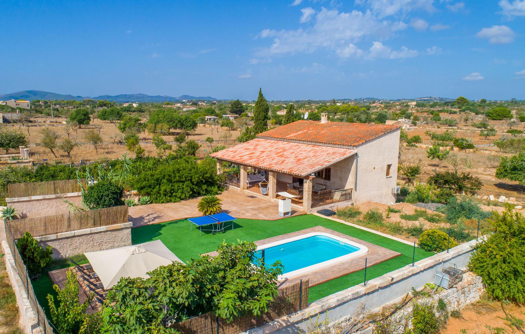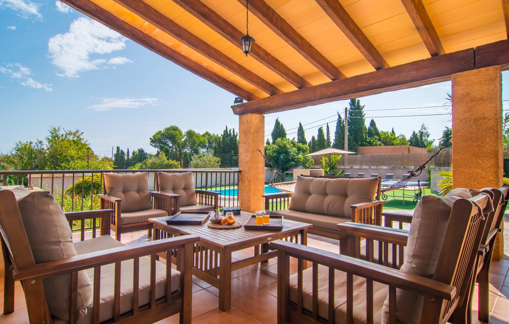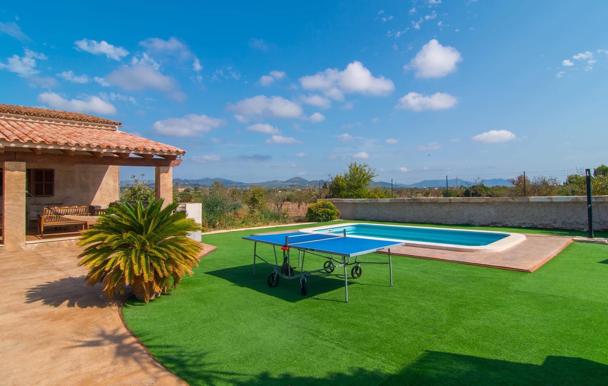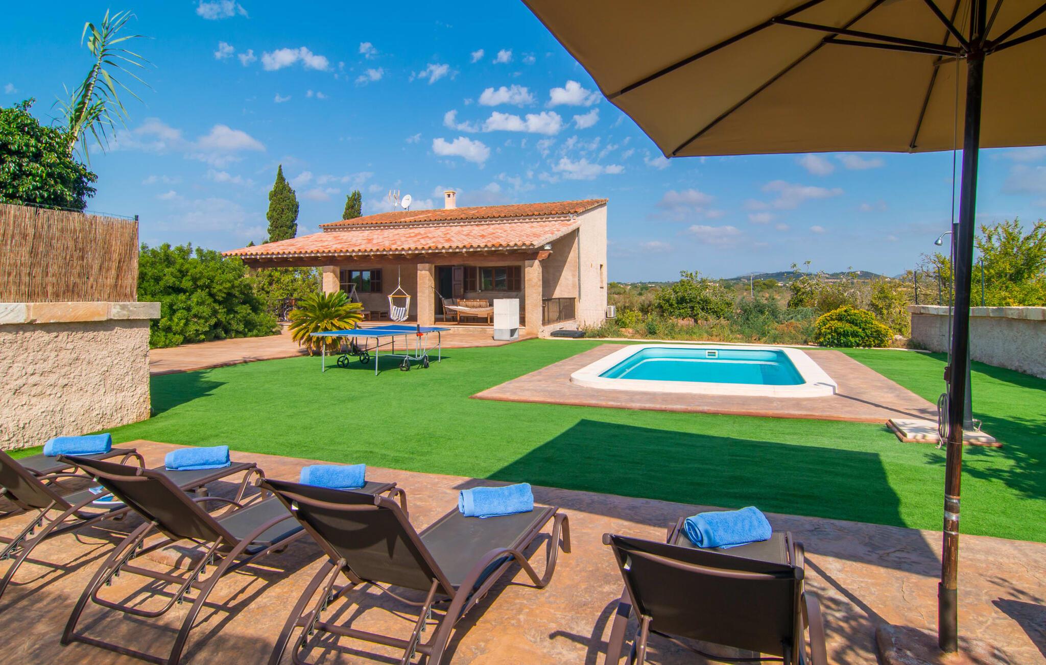 Die Villa „Sa Pedrera d’es Turó“ ist eine Oase nahe am Meer und bietet viel Abwechslung an der Ostküste. Das gilt auch für die Villa selbst: Der großzügig angelegte Außenbereich lockt zu zeitlosen, sonnigen Nachmittagen mit einem herrlich erfrischenden Pool. Umgeben von einem sattgrünen Kunstrasen können Sie es sich nach dem Plantschen auf einer der bequemen Liegen gemütlich machen, bis die laue Brise Ihre sonnenverwöhnte Haut getrocknet hat und Sie vielleicht Lust auf eine Partie Tischtennis bekommen. Die überdachte Veranda-Terrasse bietet eine Hängematte, einen Schaukelsessel, eine Hollywoodschaukel sowie einen entspannenden Sitzbereich – attraktive Orte zum Entspannen in der entspannenden Ruhe. Darüber hinaus steht Ihnen ein eingebauter Grill zur Verfügung, damit Sie viel Zeit an der frischen Luft verbringen können.