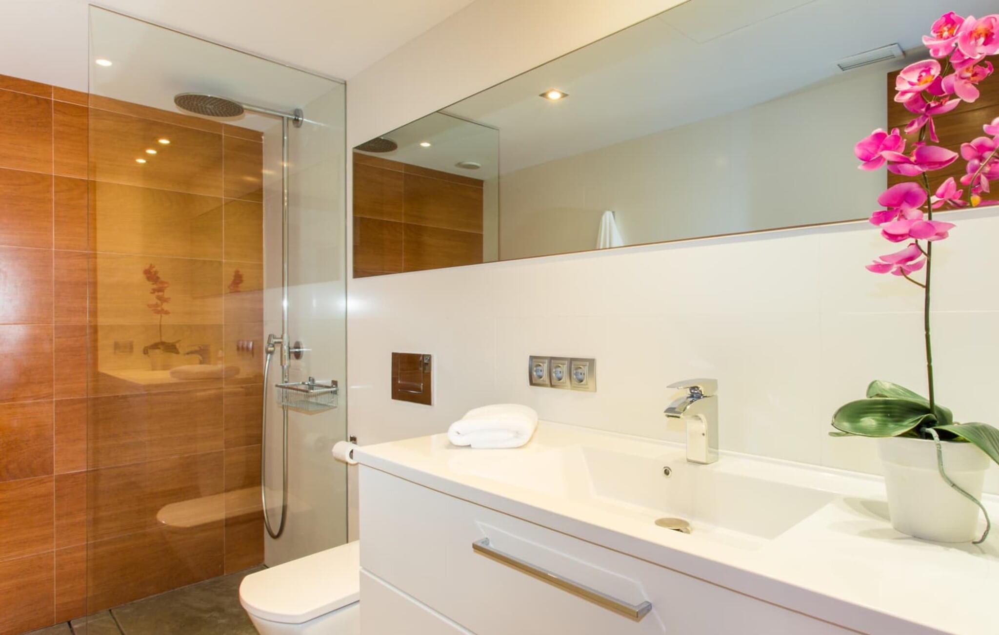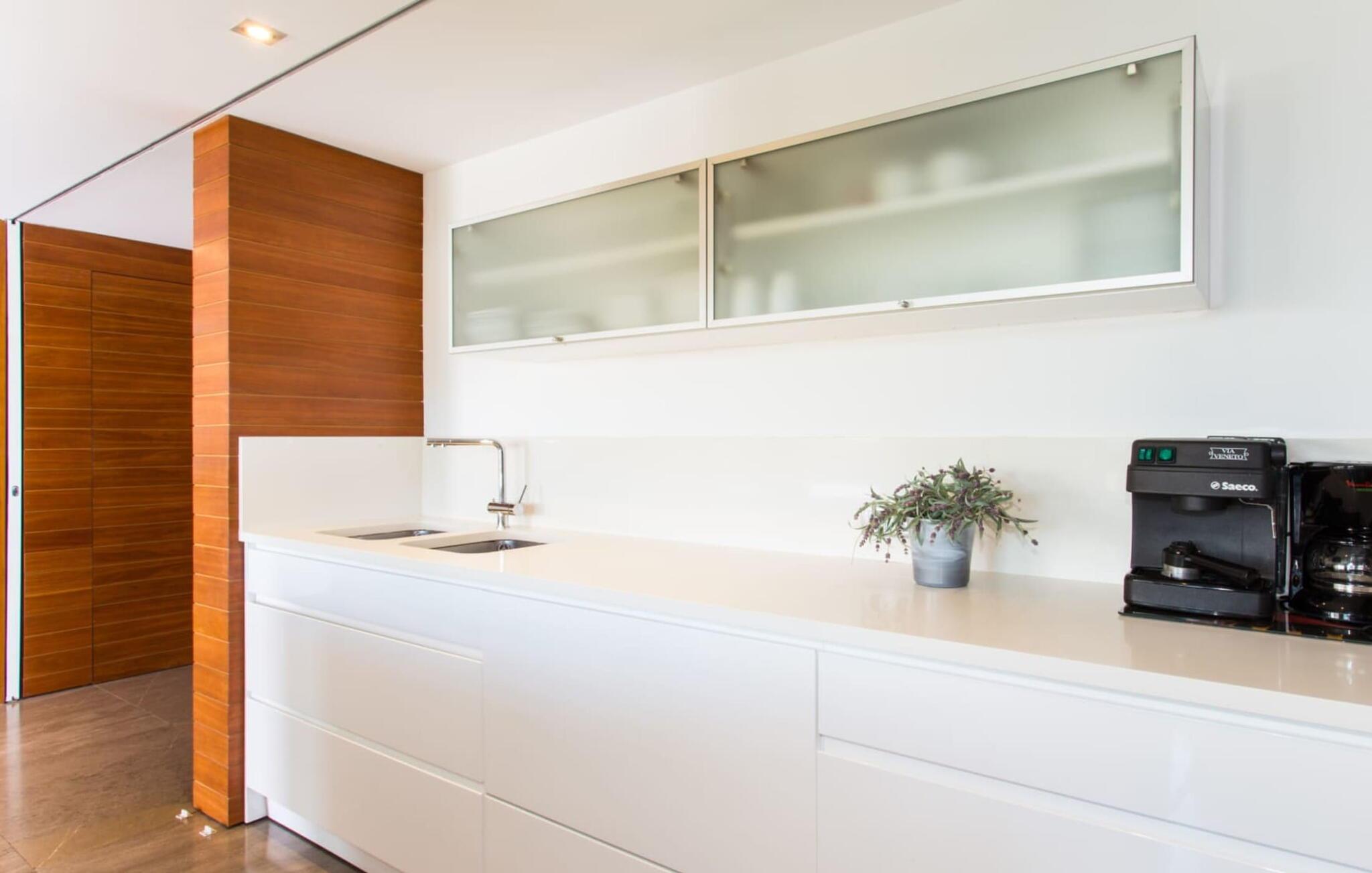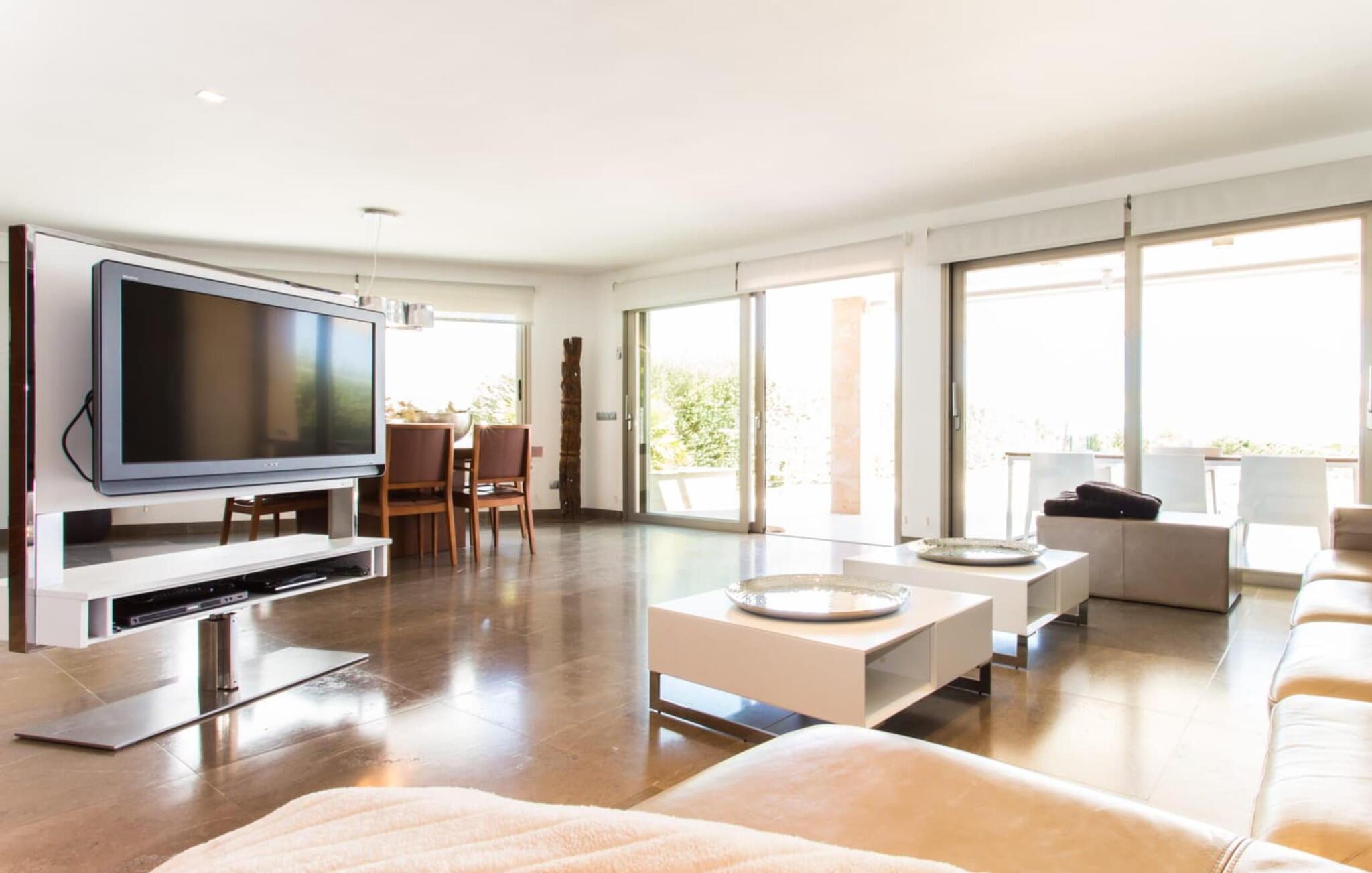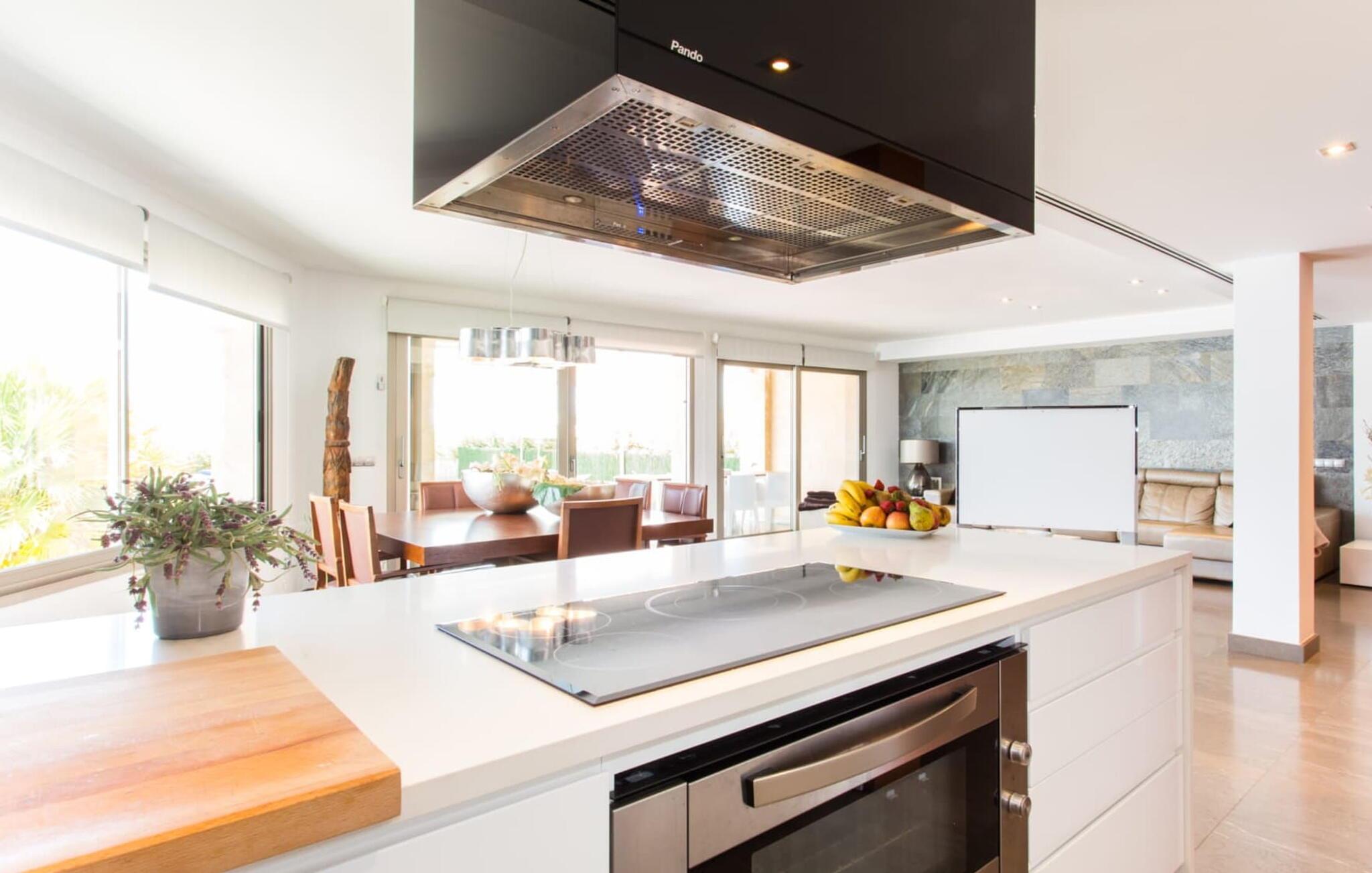 Von der Terrasse aus führen Glastüren in den geschmackvoll und hochwertig eingerichteten Innenraum der Ferienvilla. Im Erdgeschoss erwartet Sie ein helles, freundliches Wohnzimmer. Es ist zum Esszimmer und zur luxuriös ausgestatteten Küche mit Kochinsel und Frühstückstheke hin offen. Auf dieser Ebene befinden sich auch eines der drei gemütlichen Schlafzimmer und ein Badezimmer. Im Obergeschoss befinden sich ein weiteres Doppelzimmer mit eigenem Bad und ein elegantes Hauptschlafzimmer. Beide Zimmer haben Zugang zu einer Sonnenterrasse mit herrlichem Meerblick. Das Haus ist komplett mit Klimaanlage und Heizung ausgestattet. Gerne können Sie bei Bedarf auch Home-Office-Arbeit erledigen. Es gibt eine stabile WLAN-Verbindung und ein Glasfasernetz.