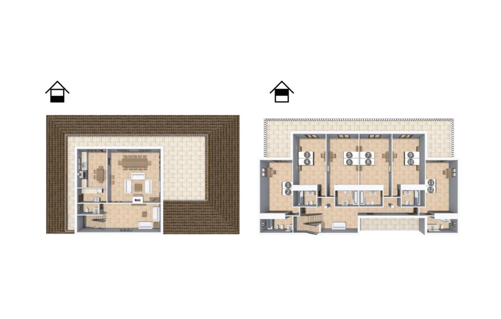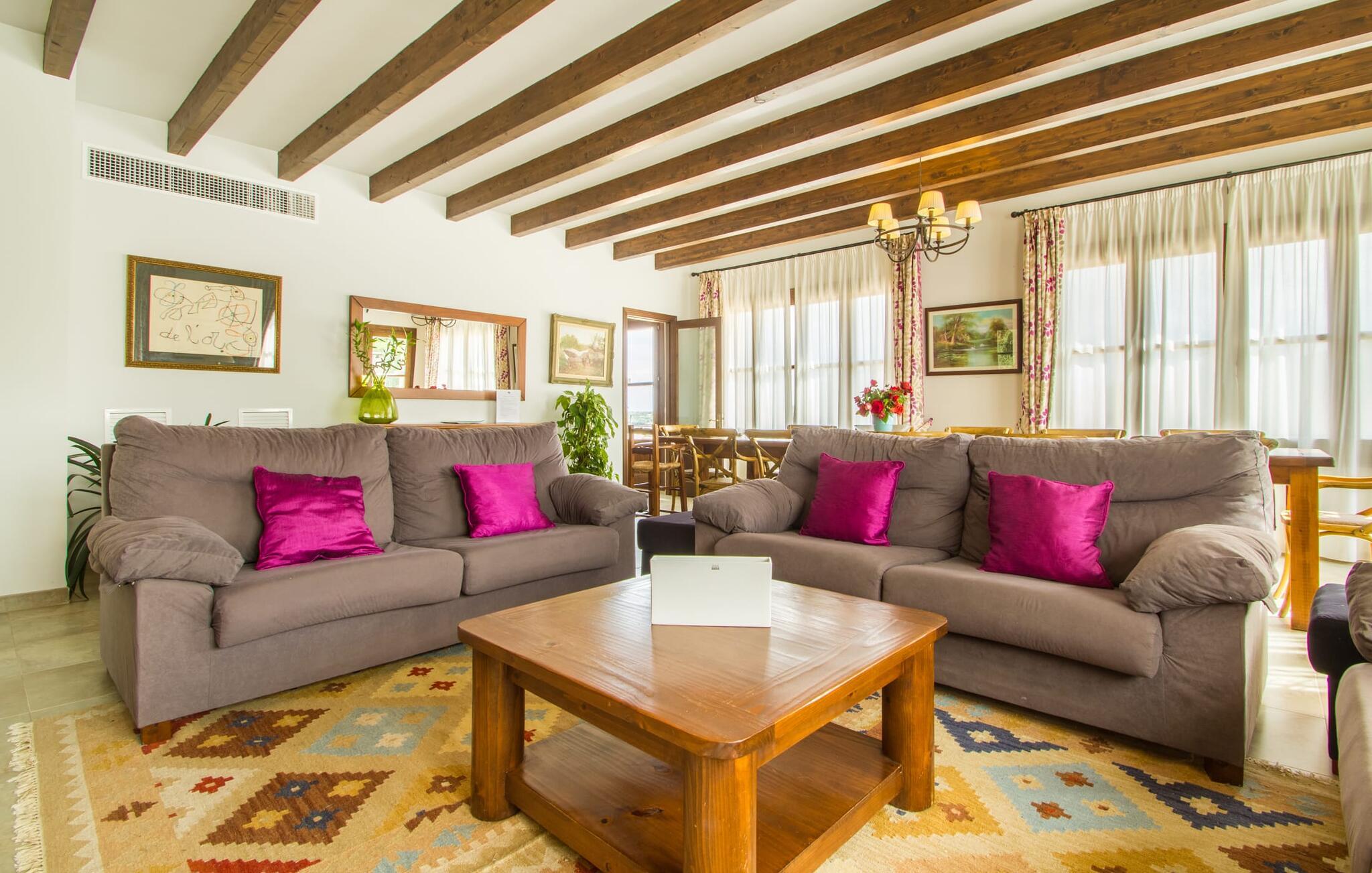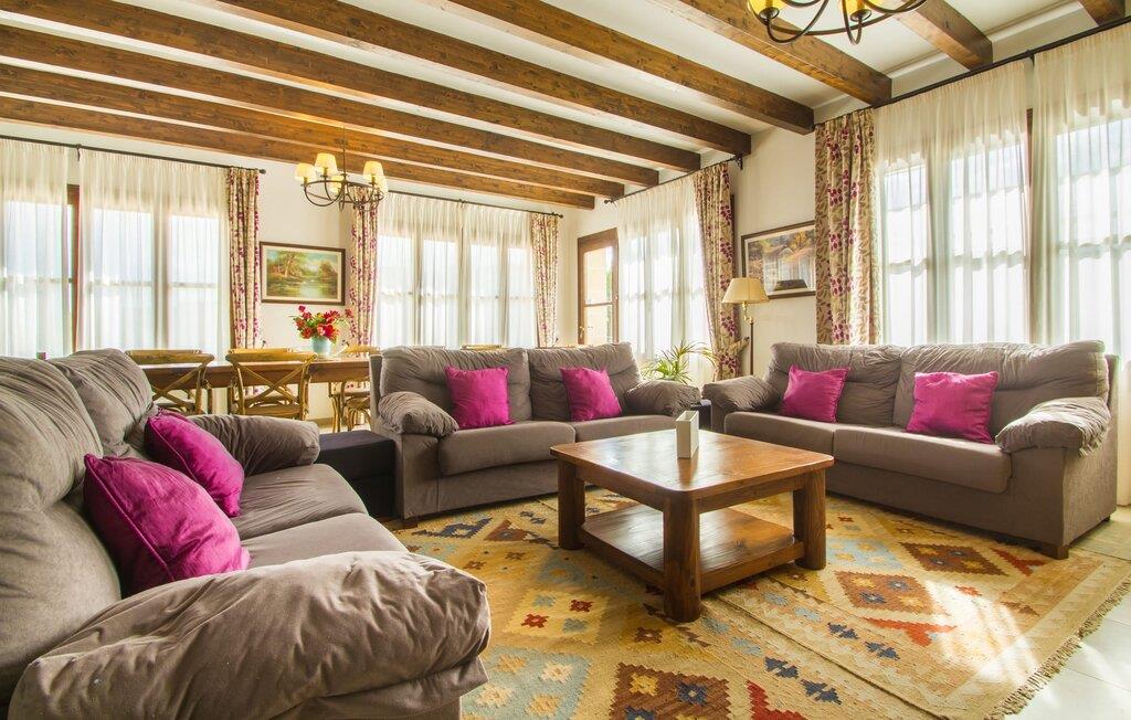 Im Inneren strahlt die Villa Wärme und Charme aus, mit Holzakzenten, traditionellen Holzbalkendecken und gemütlichen Möbeln. Das offene Wohn- und Esszimmer lädt zum Entspannen ein, während eine Klimaanlage in den Sommermonaten für Komfort sorgt. Die voll ausgestattete Küche bietet Flexibilität für Selbstverpflegung. Mit sechs Doppelzimmern, jedes mit eigenem Bad, ist Privatsphäre garantiert.